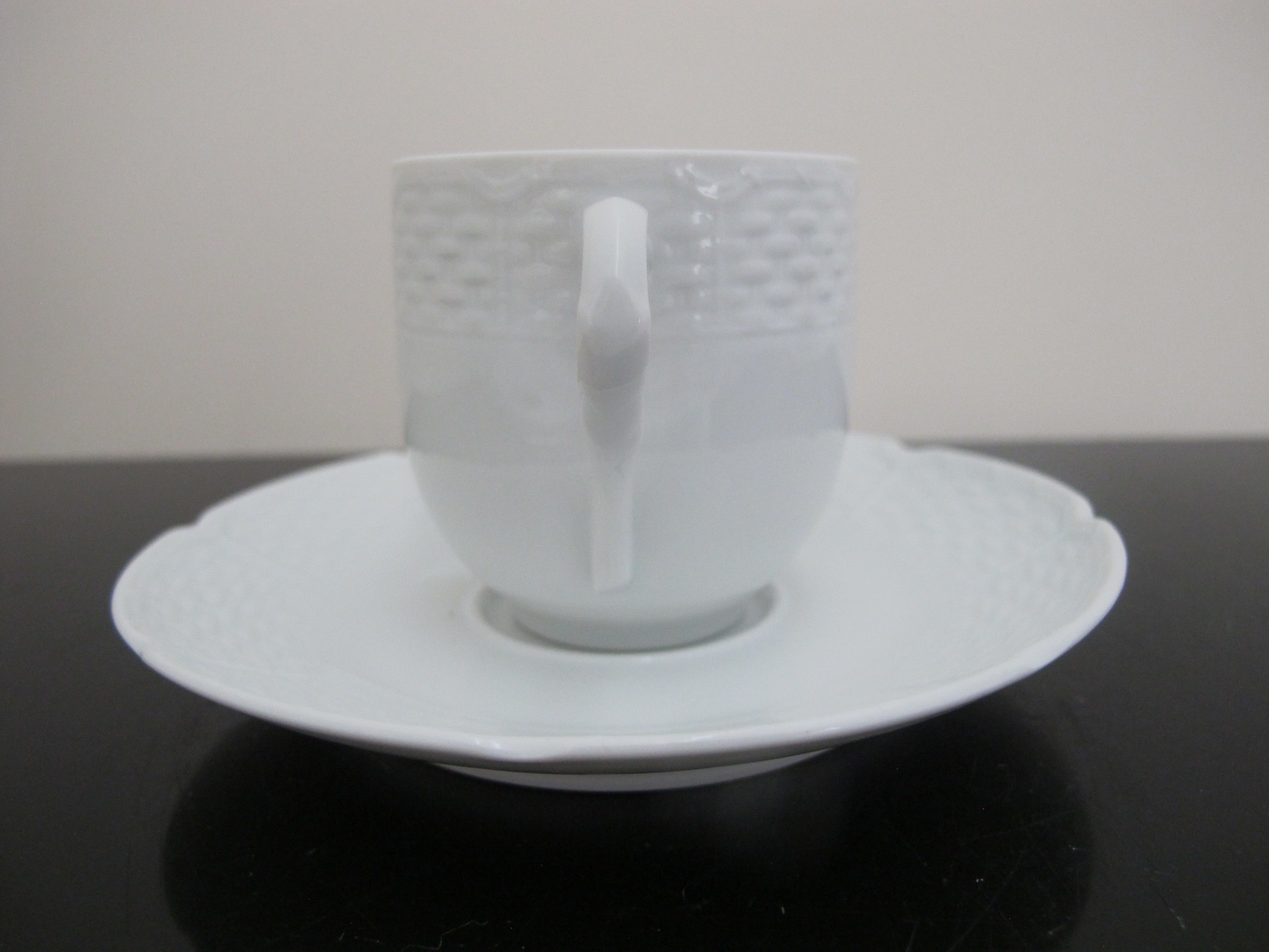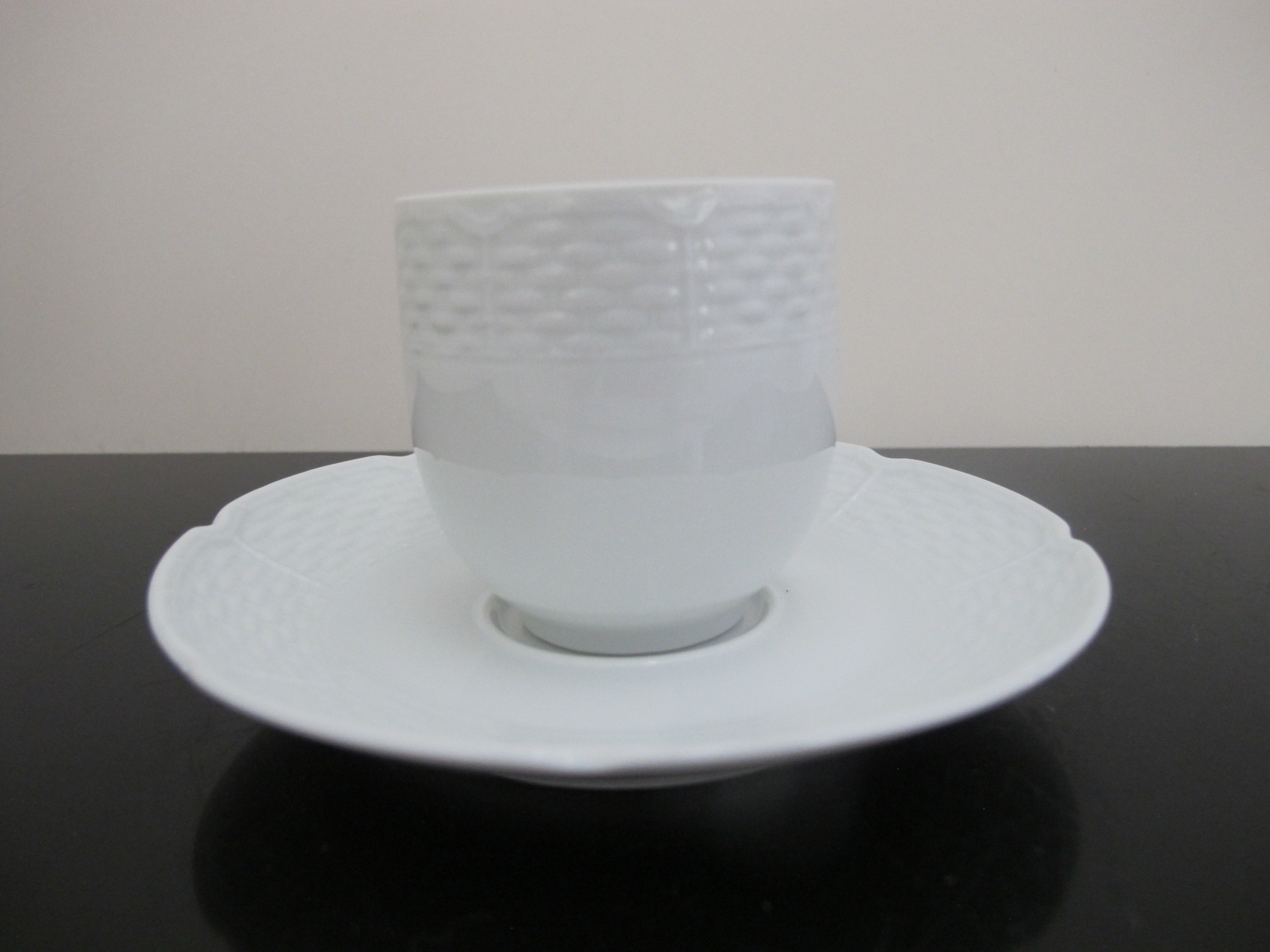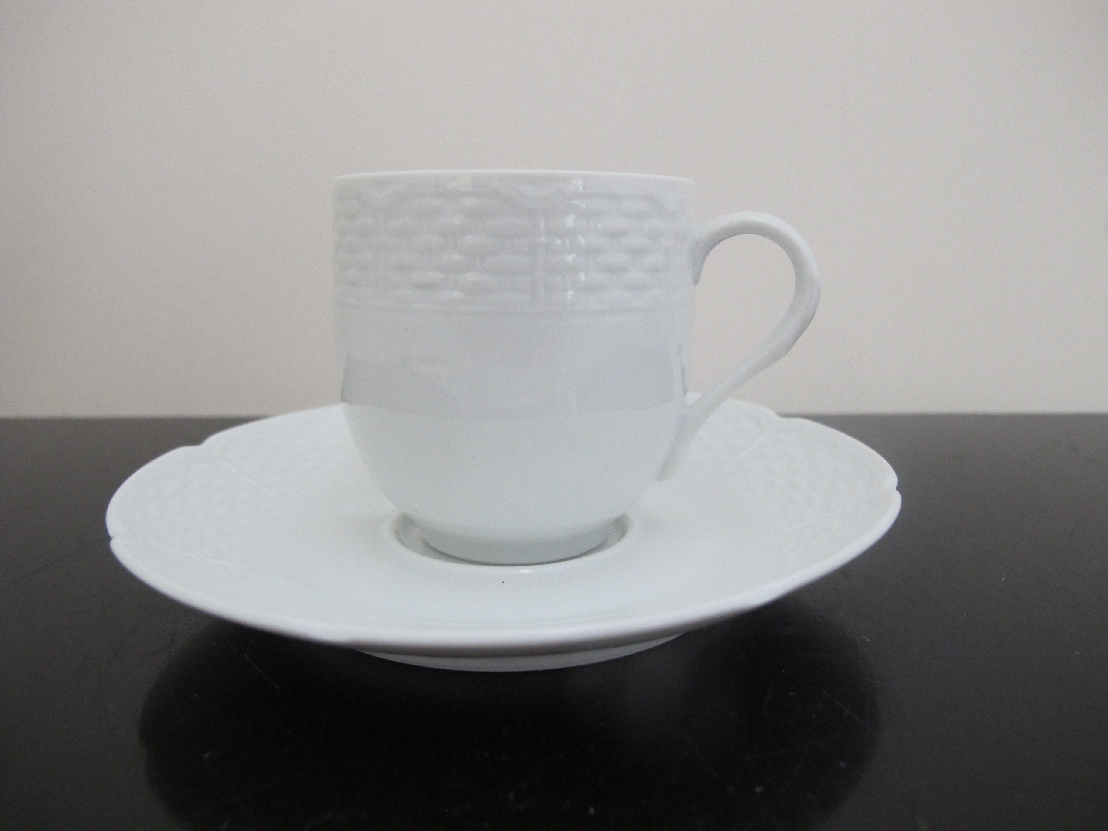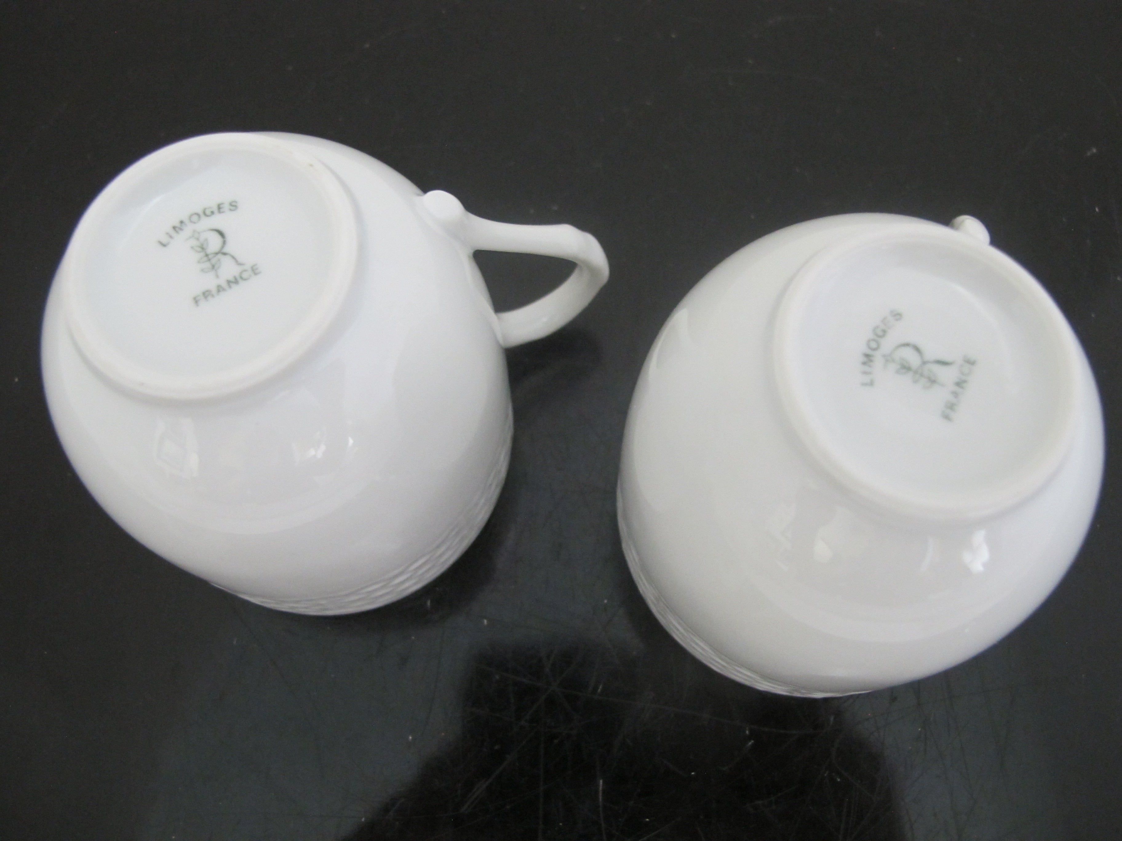 Classic and lovely Limoges A Raynaud Osier pattern demitasse cup and saucer pair. Crisp white showing basket weave texture. Cup measures 3 1/4" x 2 1/2" x 2 1/2" tall. Each saucer with scalloped rim measures 5 1/4". Both are in excellent condition, no chips, cracks, or repairs. Multiple sets may be available.