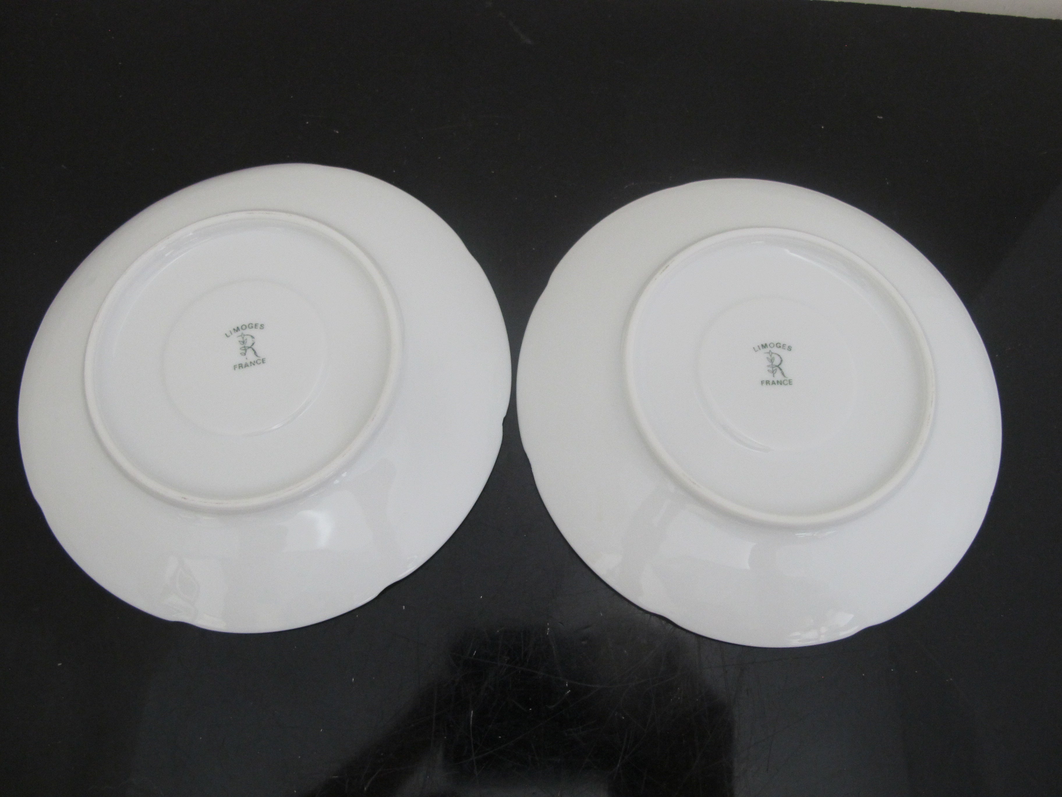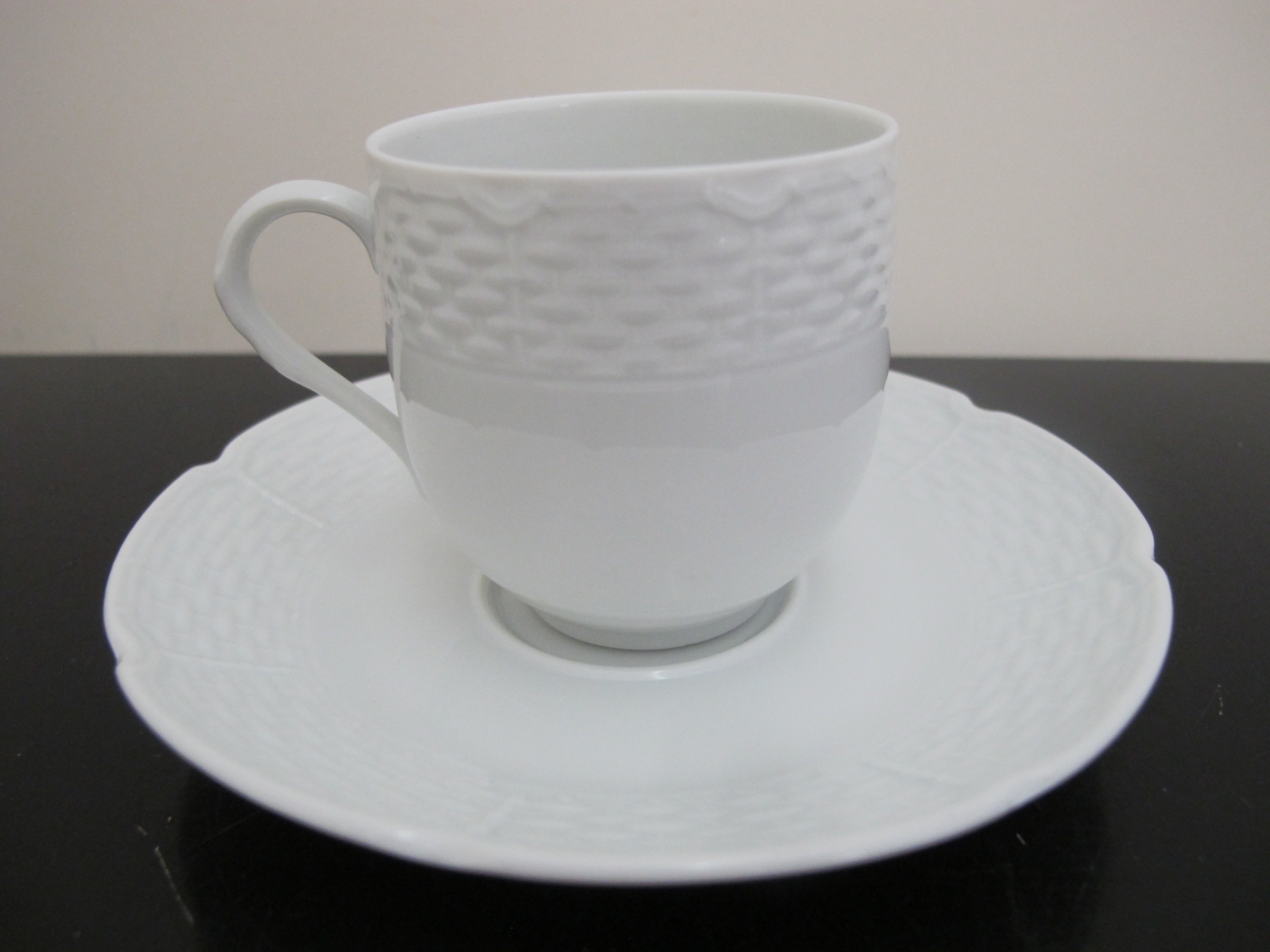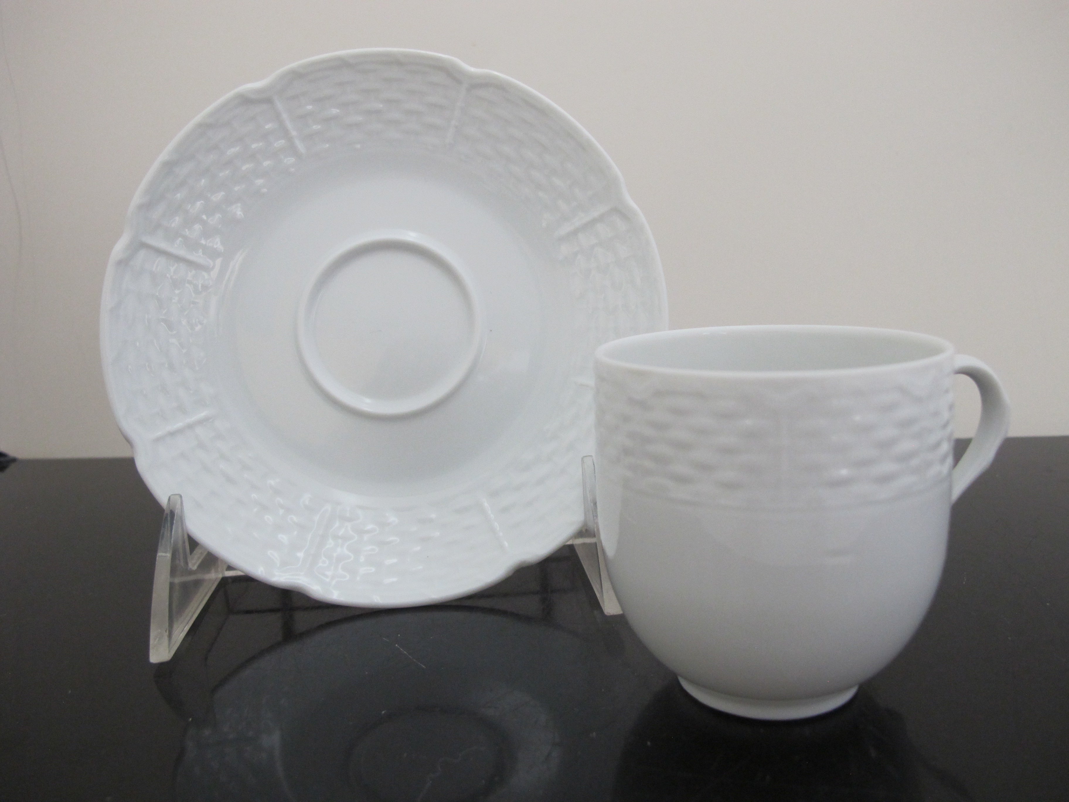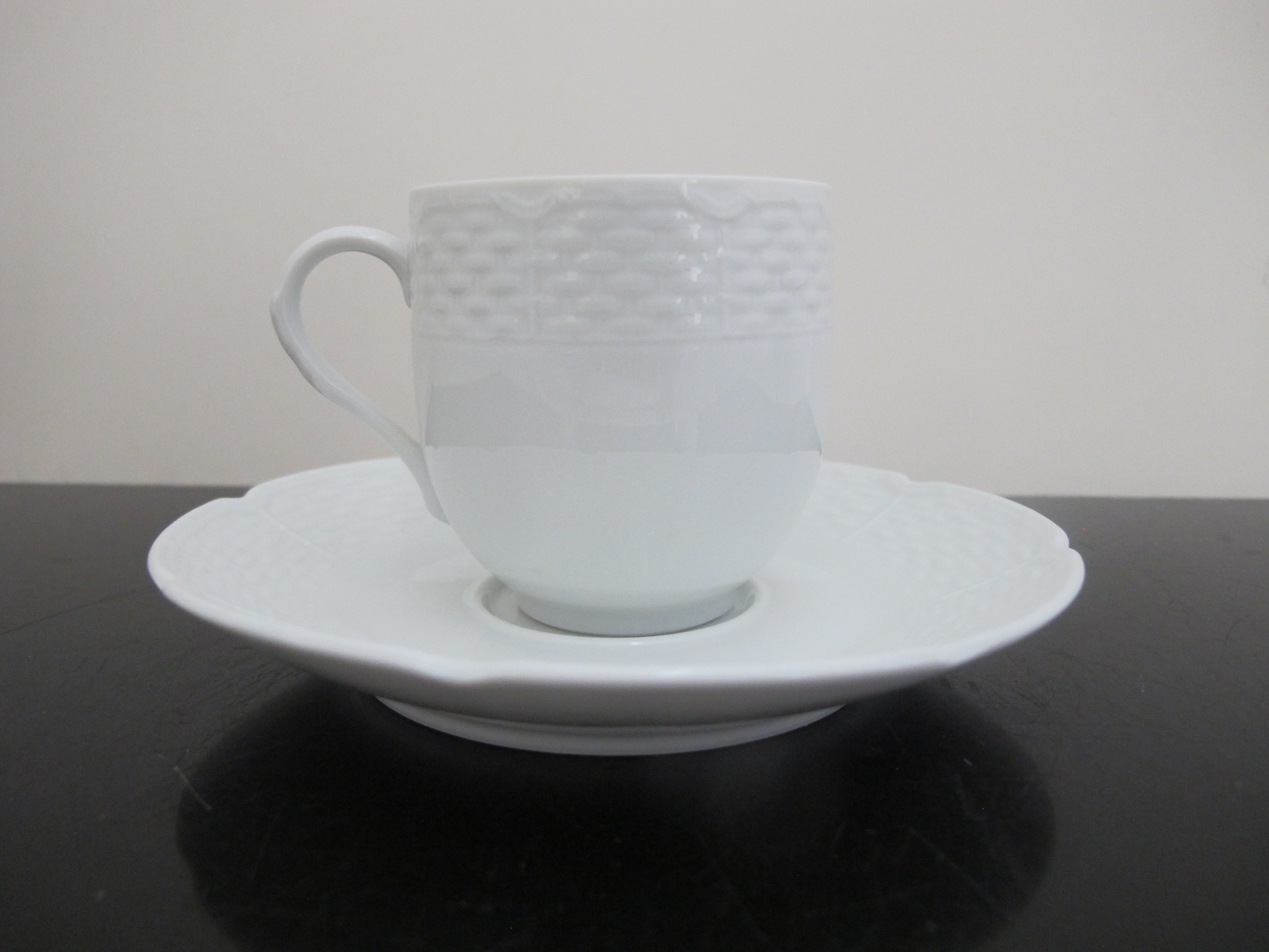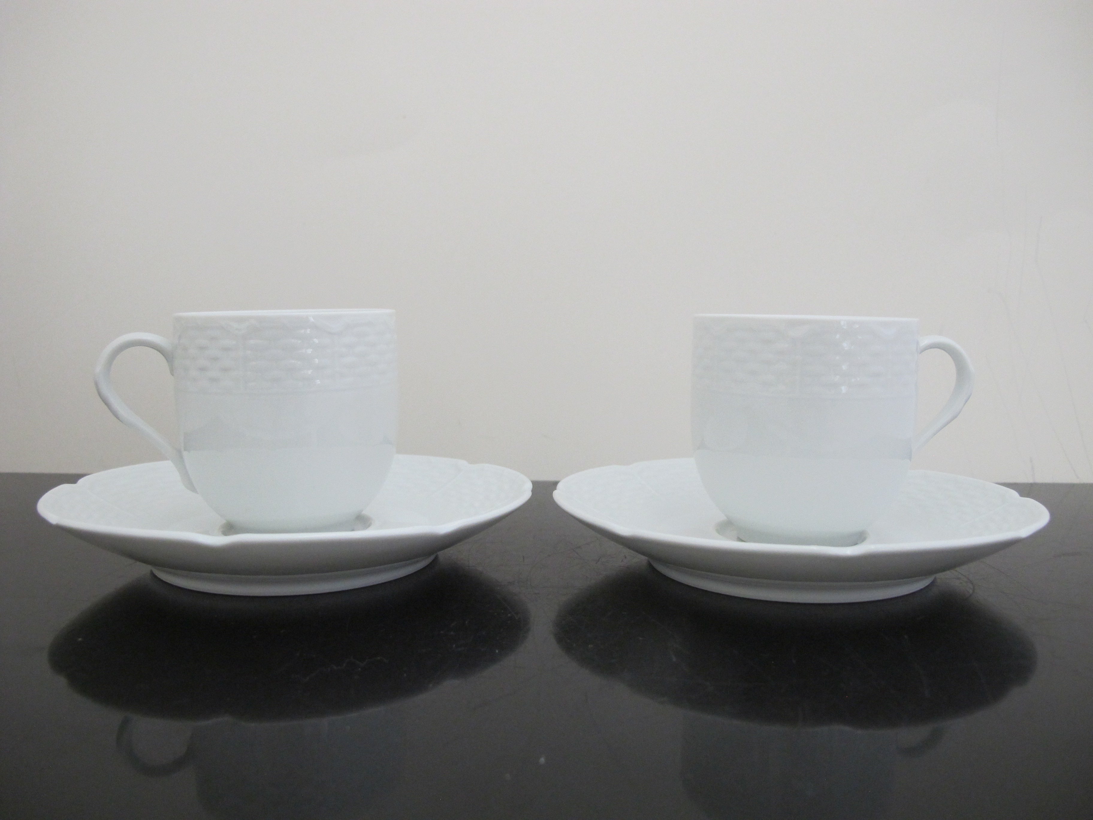 Classic and lovely Limoges A Raynaud Osier pattern demitasse cup and saucer pair. Crisp white showing basket weave texture. Cup measures 3 1/4" x 2 1/2" x 2 1/2" tall. Each saucer with scalloped rim measures 5 1/4". Both are in excellent condition, no chips, cracks, or repairs. Multiple sets may be available.