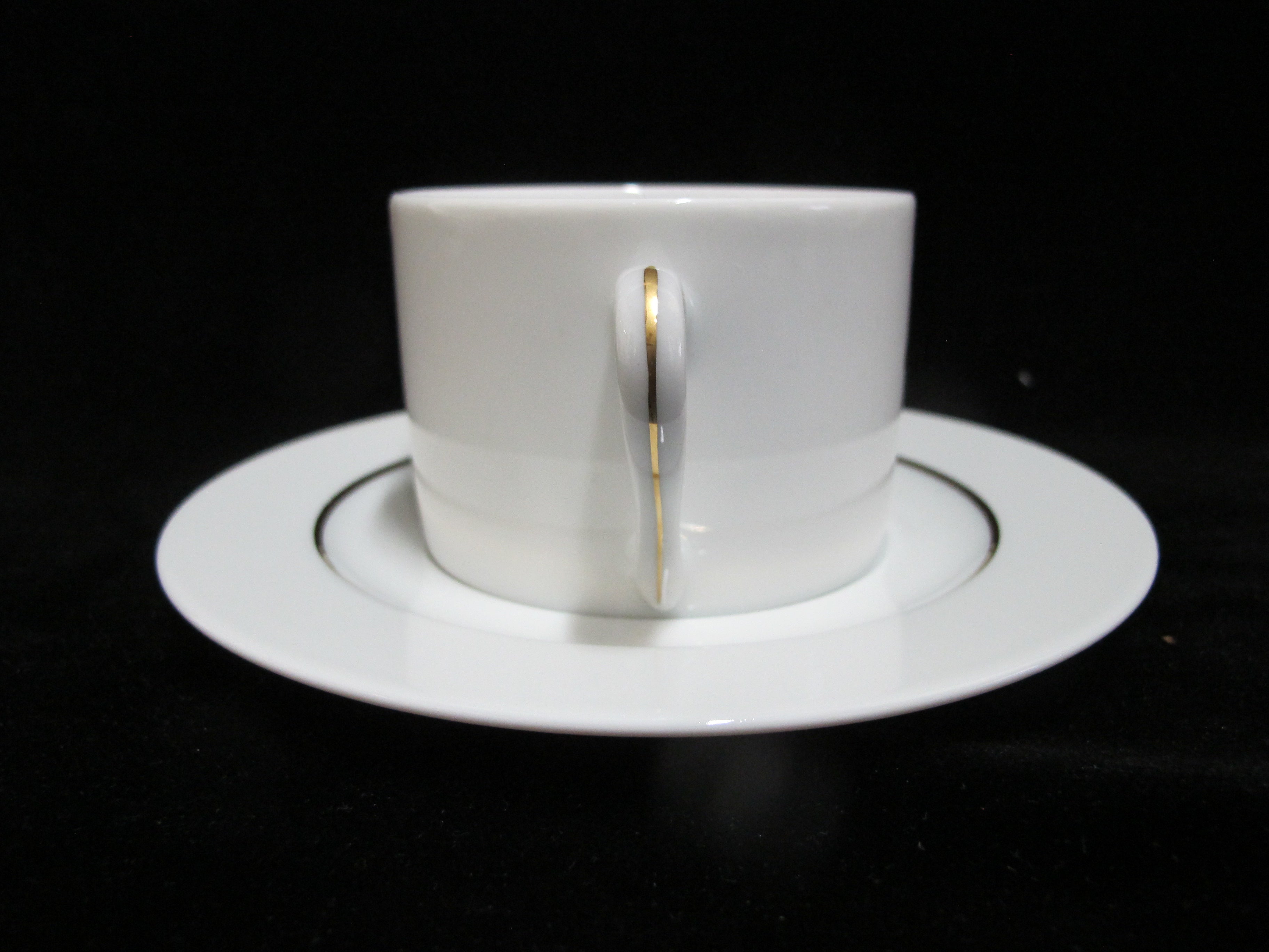 Lovely Limoges France, Philippe Deshoulieres, Maldives design porcelain cup and saucer. Cup and saucer hand painted with palm trees in green and gold. Excellent condition, no chips, cracks, or repairs.