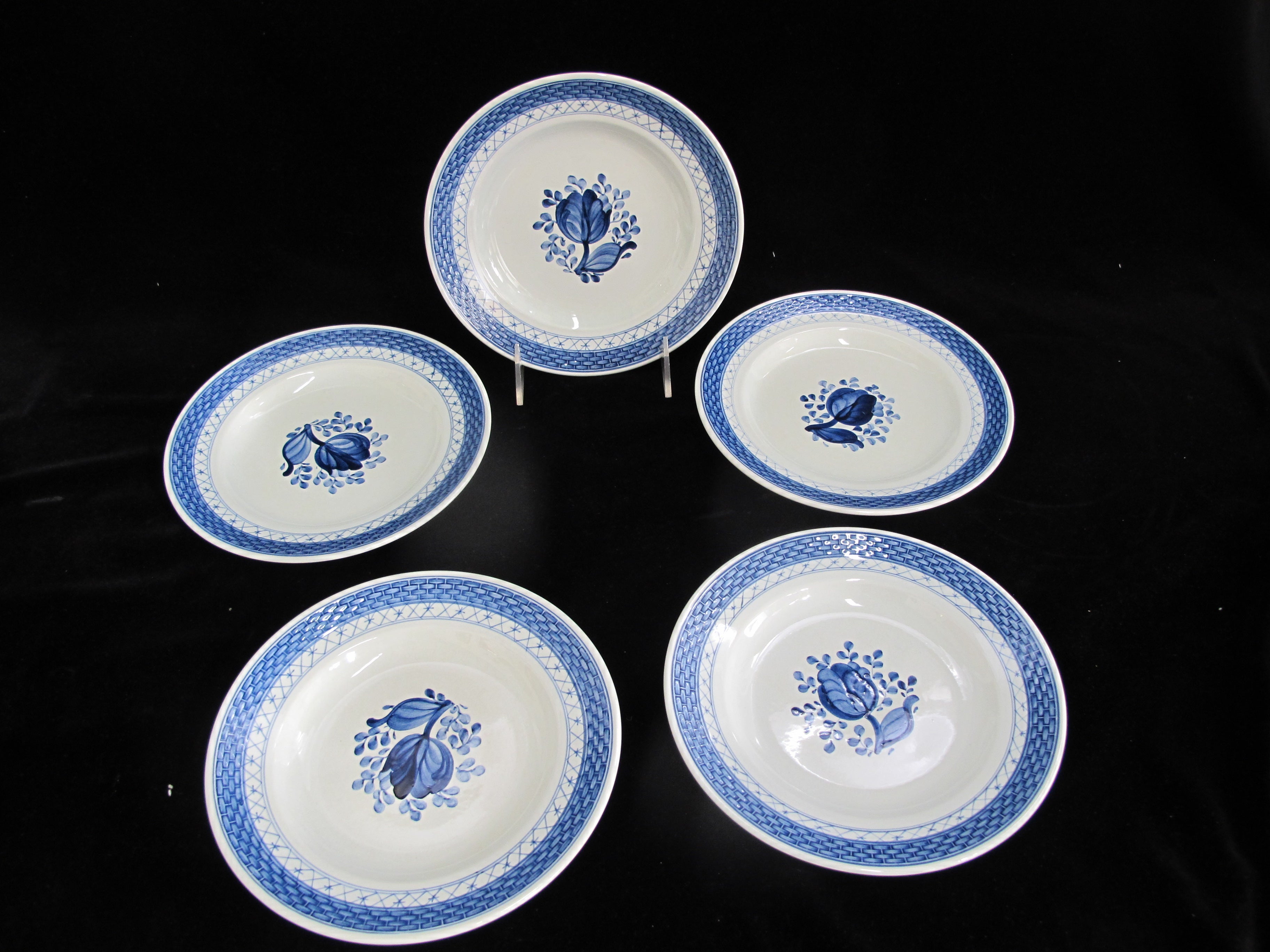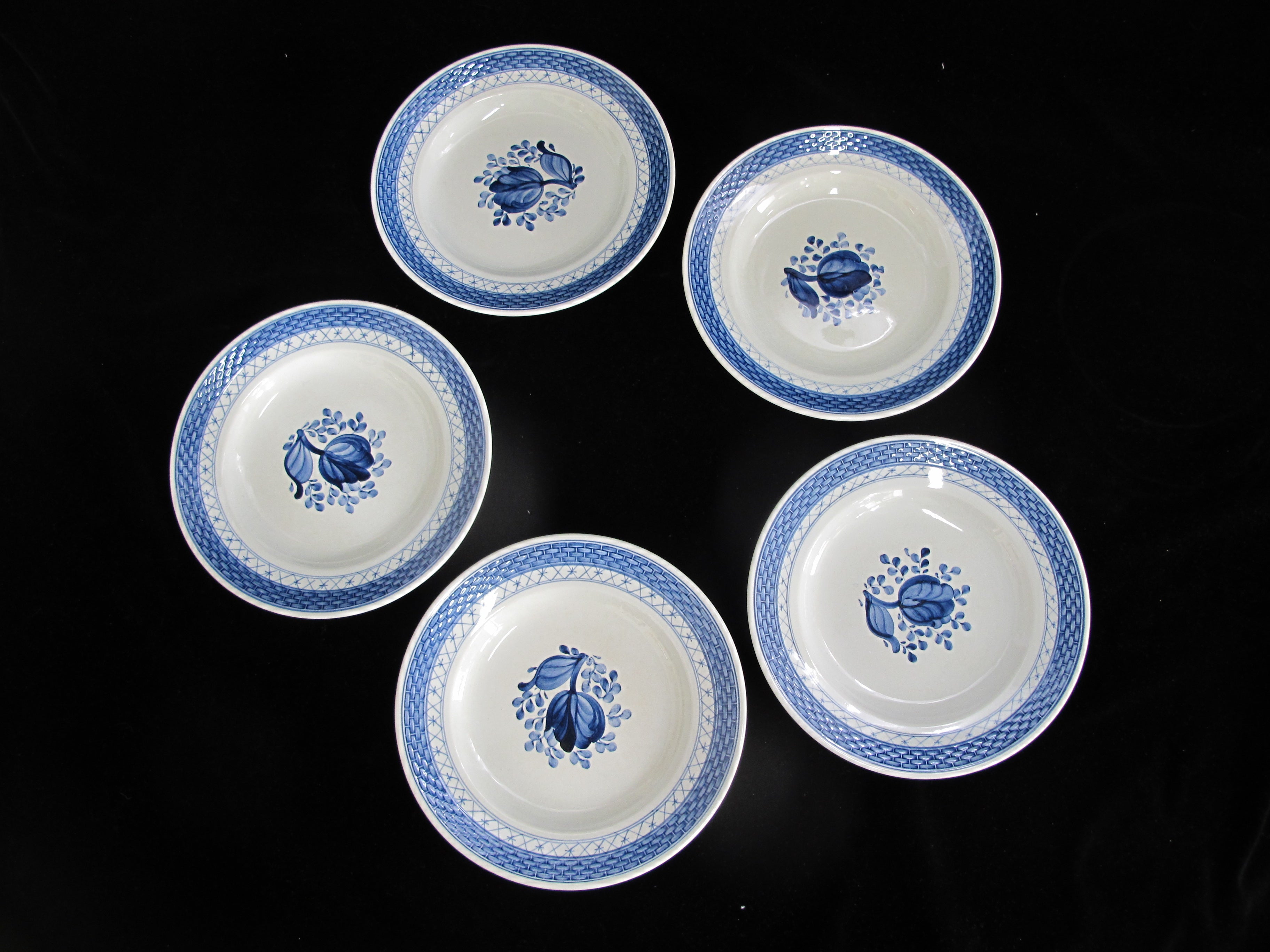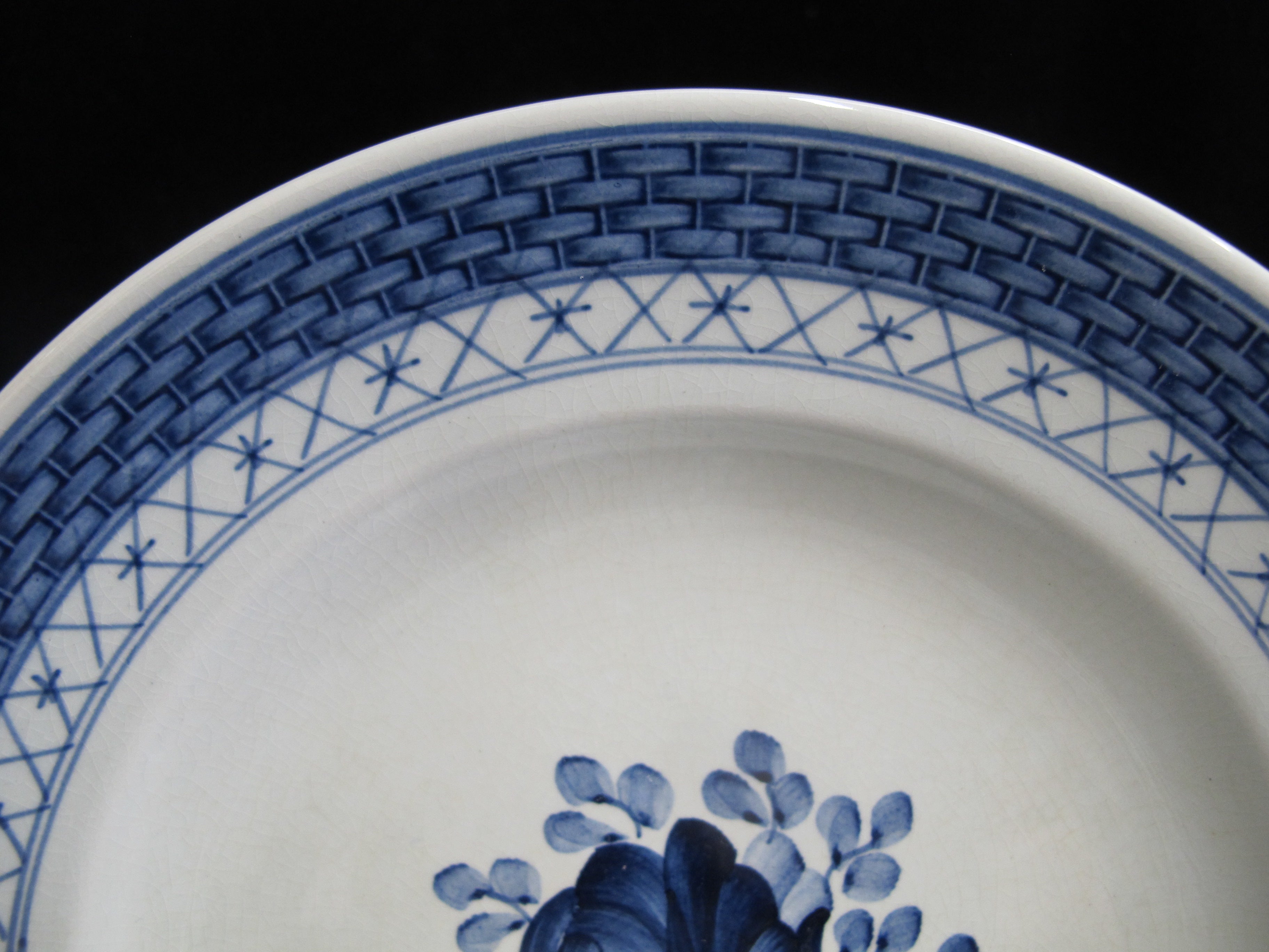 Royal Copenhagen, Denmark, Aluminia Faience Tranquebar blue pattern plate set of 5. Cobalt blue flower framed by basket weave design.