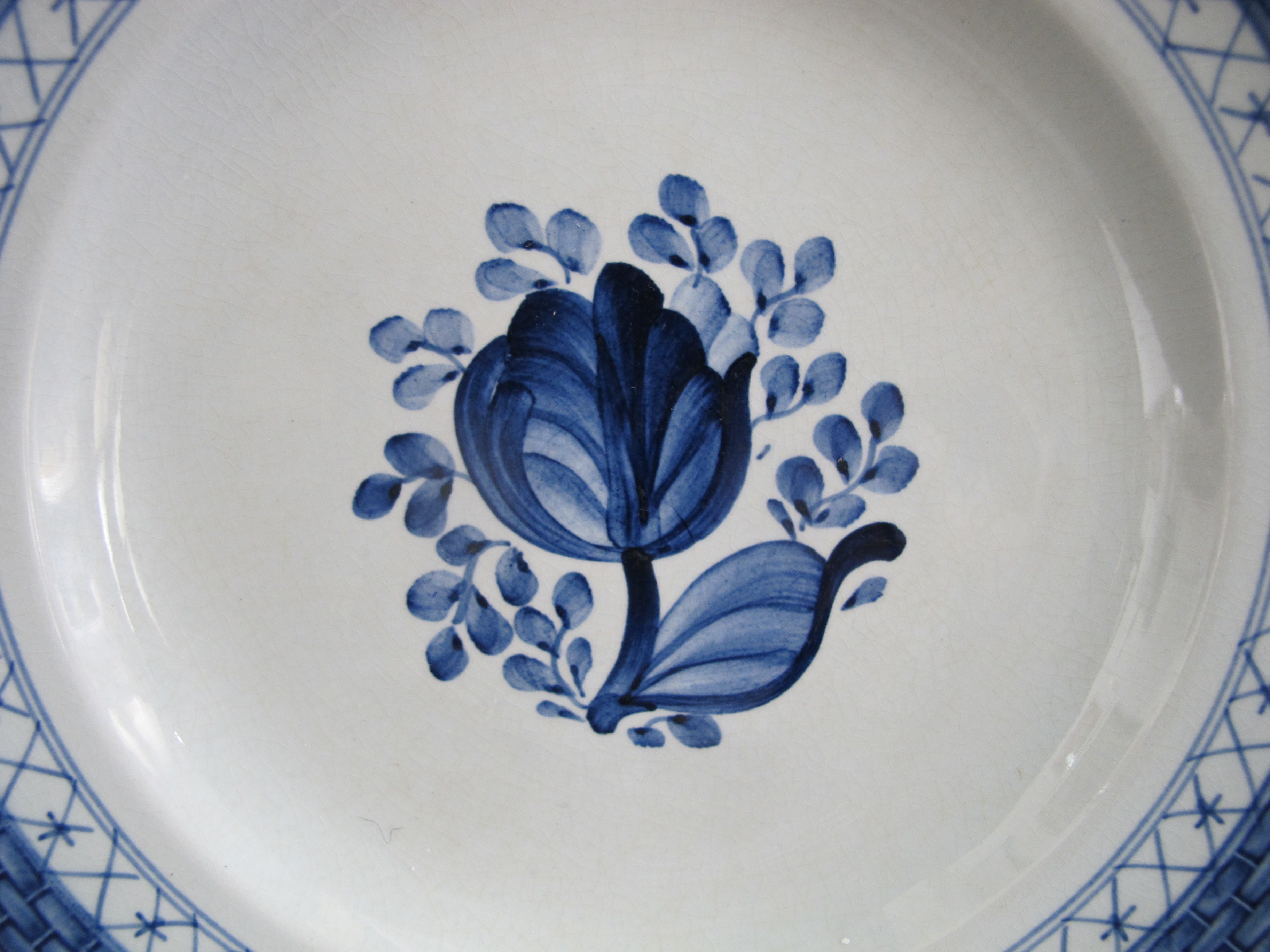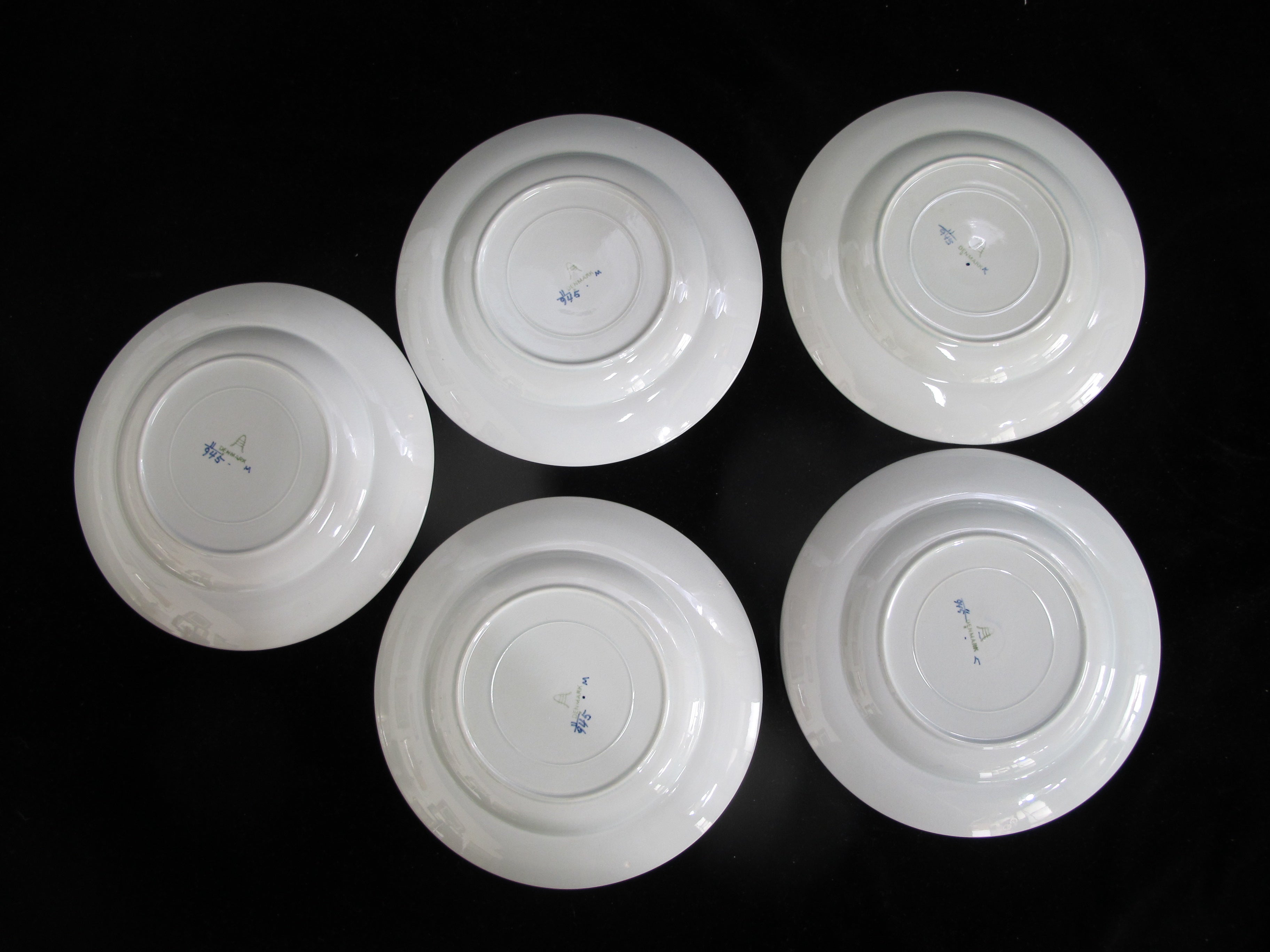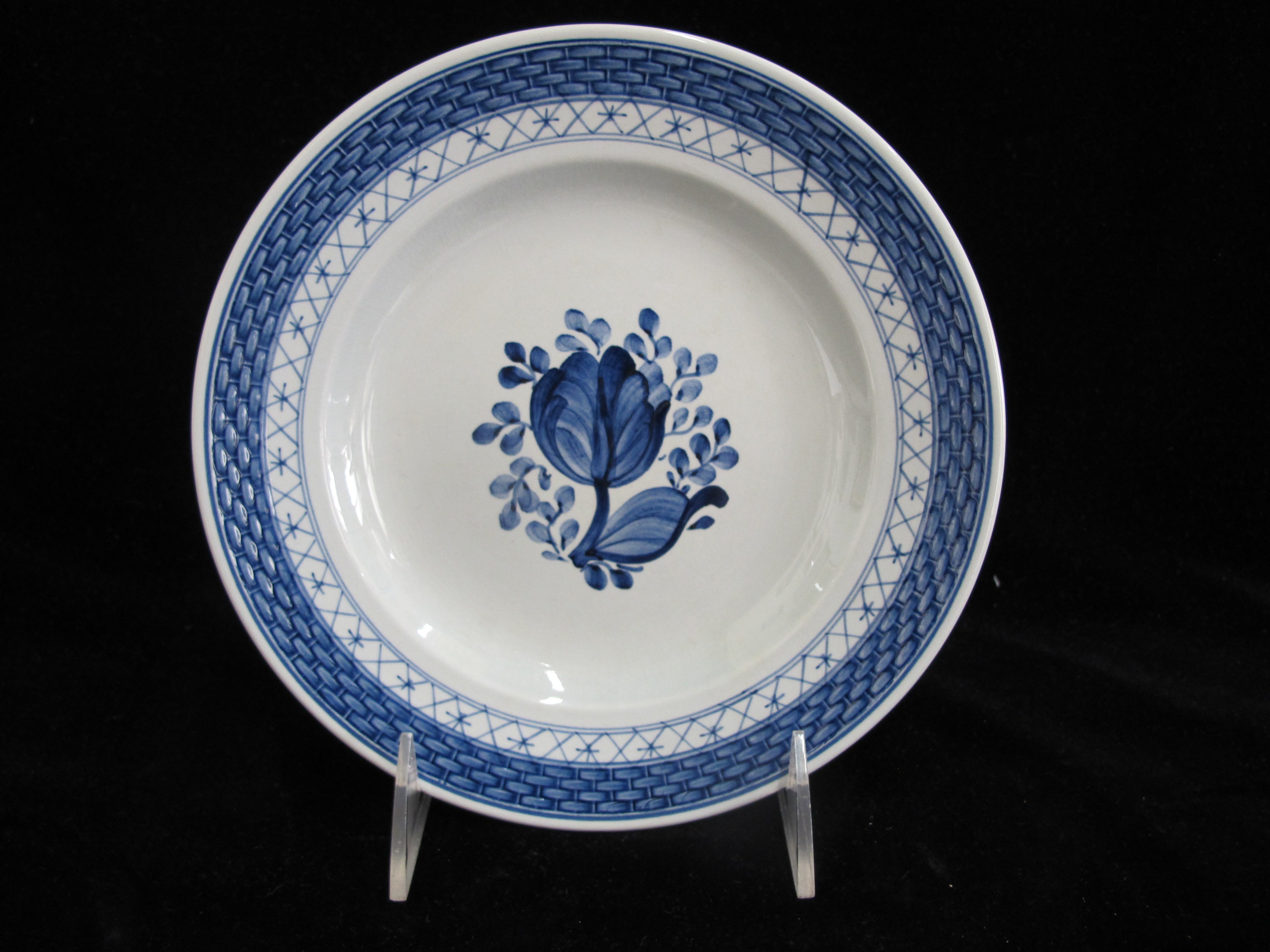 Royal Copenhagen, Denmark, Aluminia Faience Tranquebar blue pattern plate set of 5. Cobalt blue flower framed by basket weave design.
