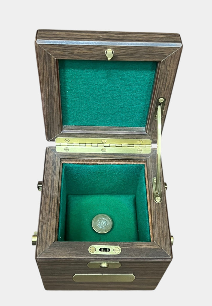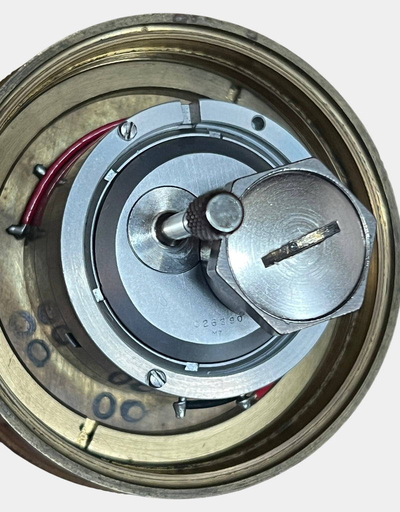 This chronometer is extremely clean. There is no sign of corrosion anywhere on this piece. The box looks fantastic, the glass is clear, and the brass is clean. This may need a new battery, or I am not winding something correctly. Once given a new battery or after winding it correctly this would work. Please zoom in on all photos taken.
