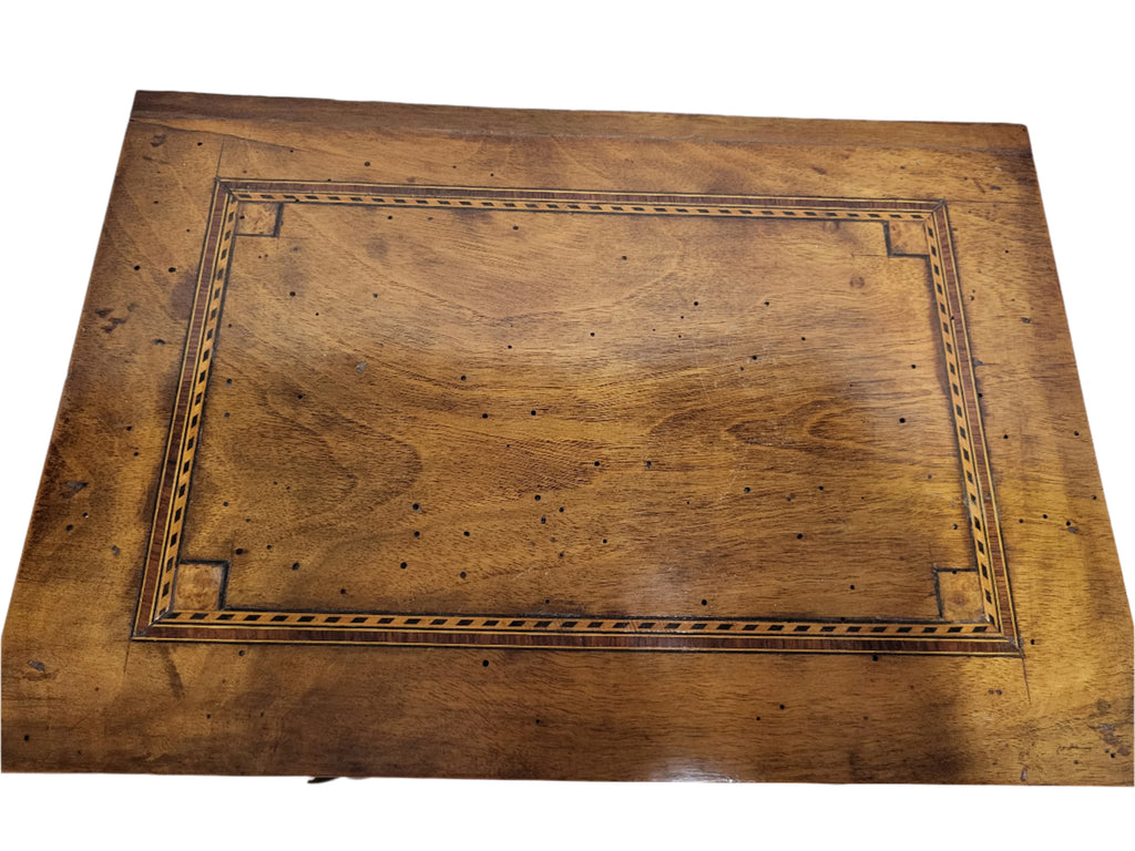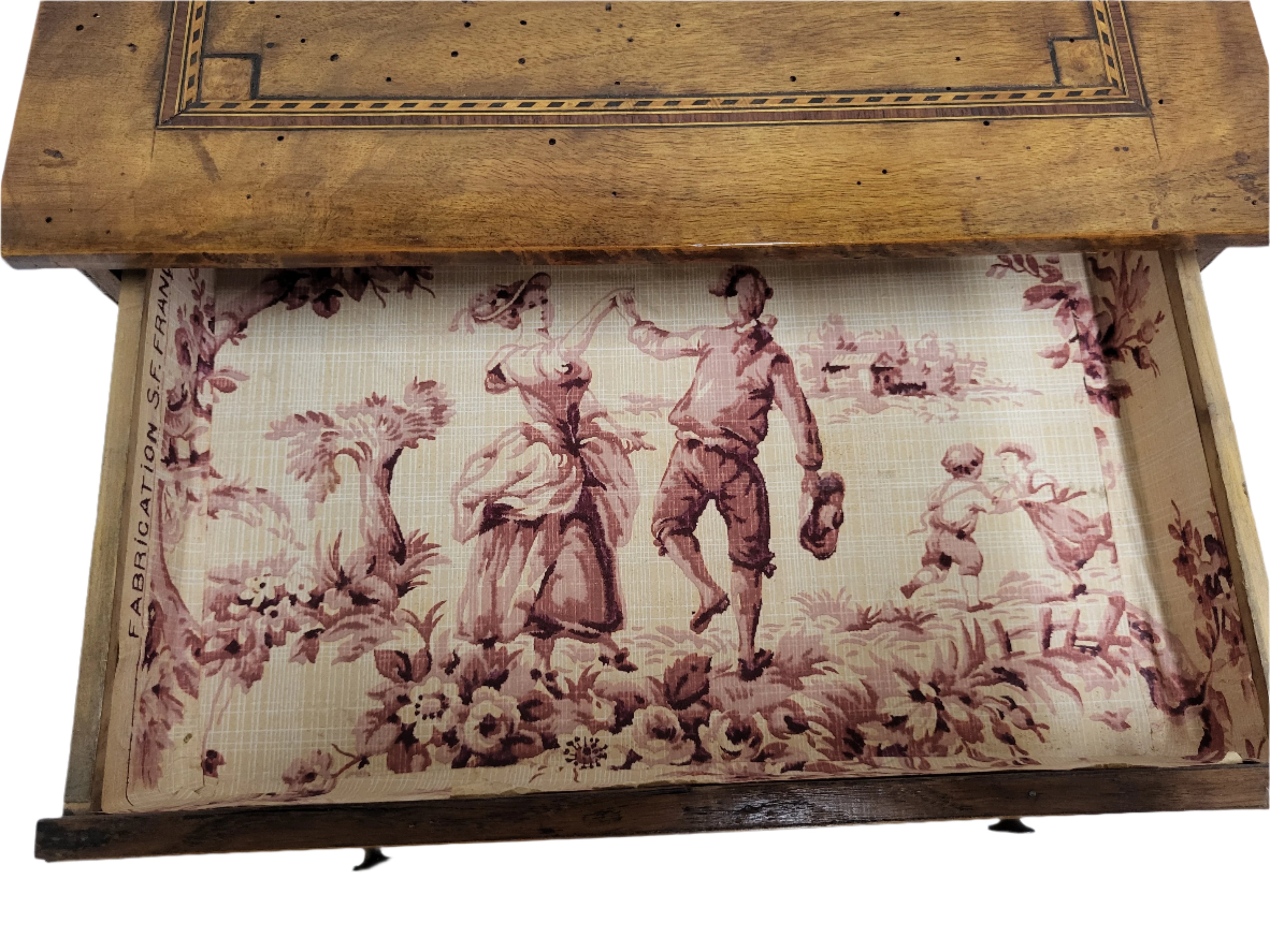 In excellent condition for its old age. Stunning Wood inlay on the drawers, top and sides of piece. Drawers wood have slightly warped a bit from age, but the drawers close easily. Minor wear to wood.
