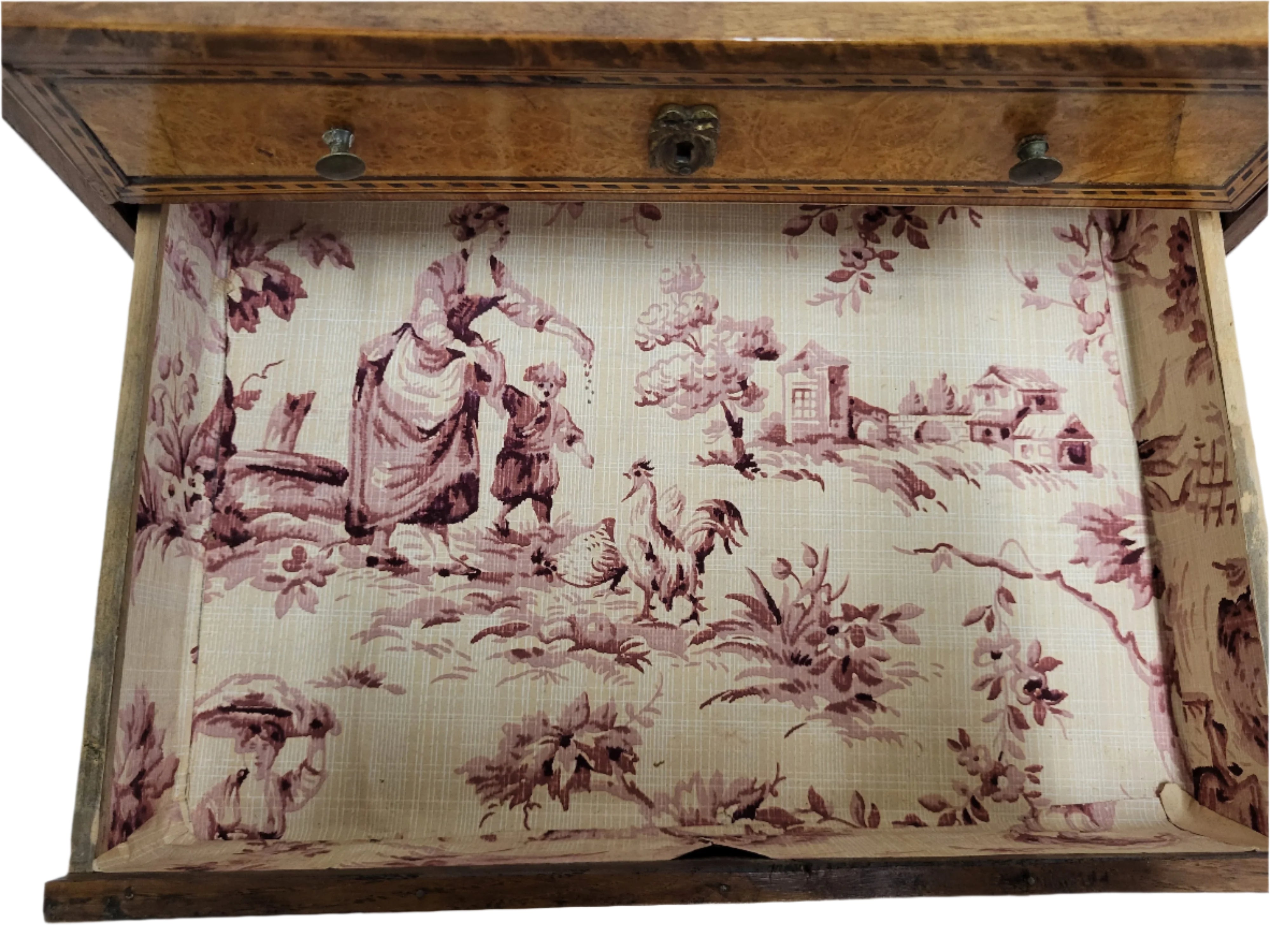 Incredibly gorgeous, most likely French 18th century Neoclassical commode. Footed miniature chest has 2 drawers with decorative brass pulls and escutcheons, and is adorned with marquetry detailing. Each drawer is lined in French Toile showing a figural pastoral design. Stands on lightly curved legs with curved wood detailing at each base side.