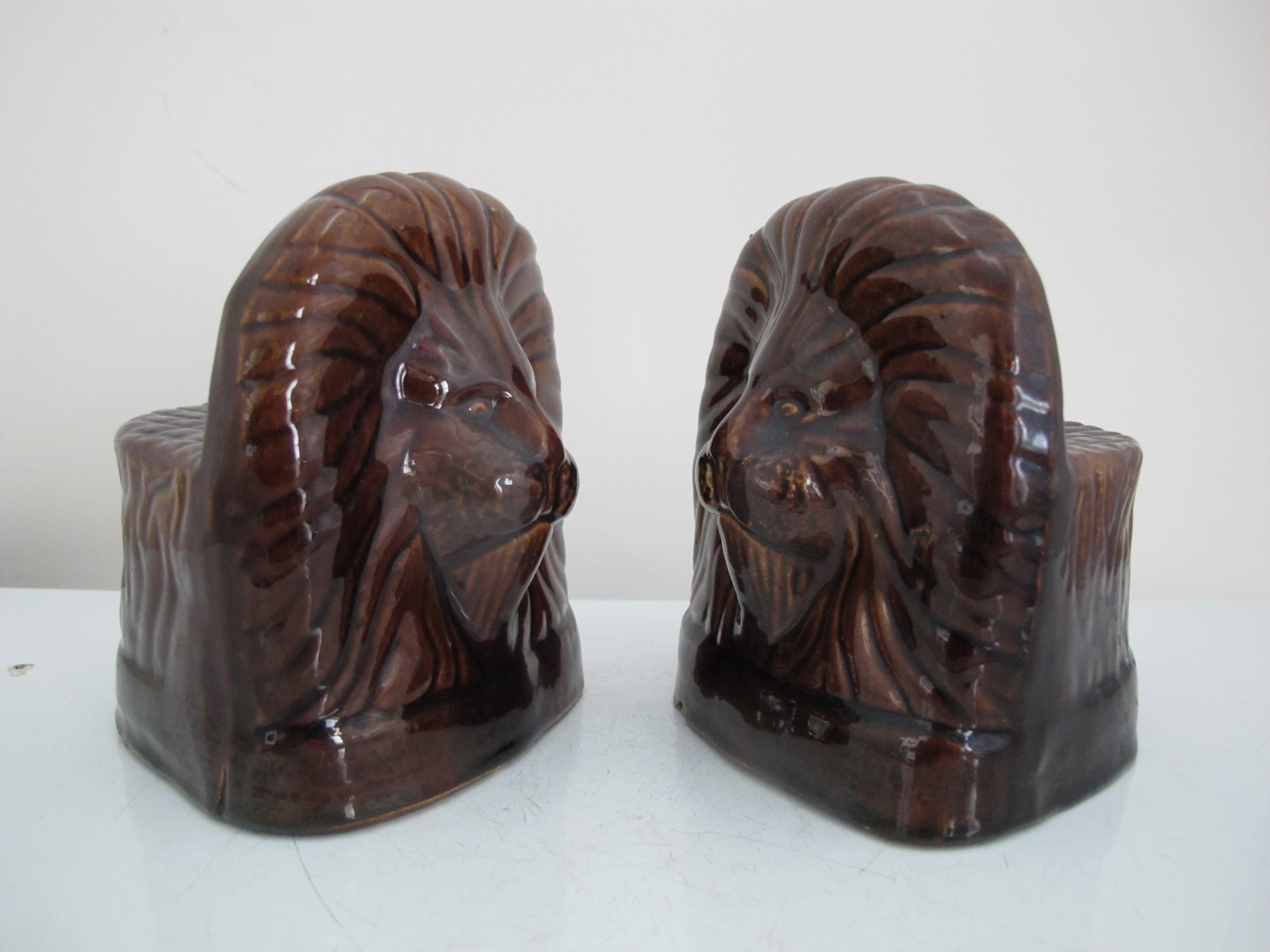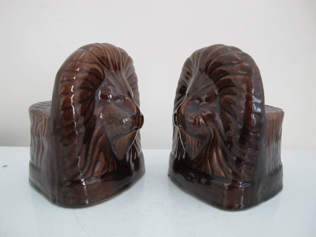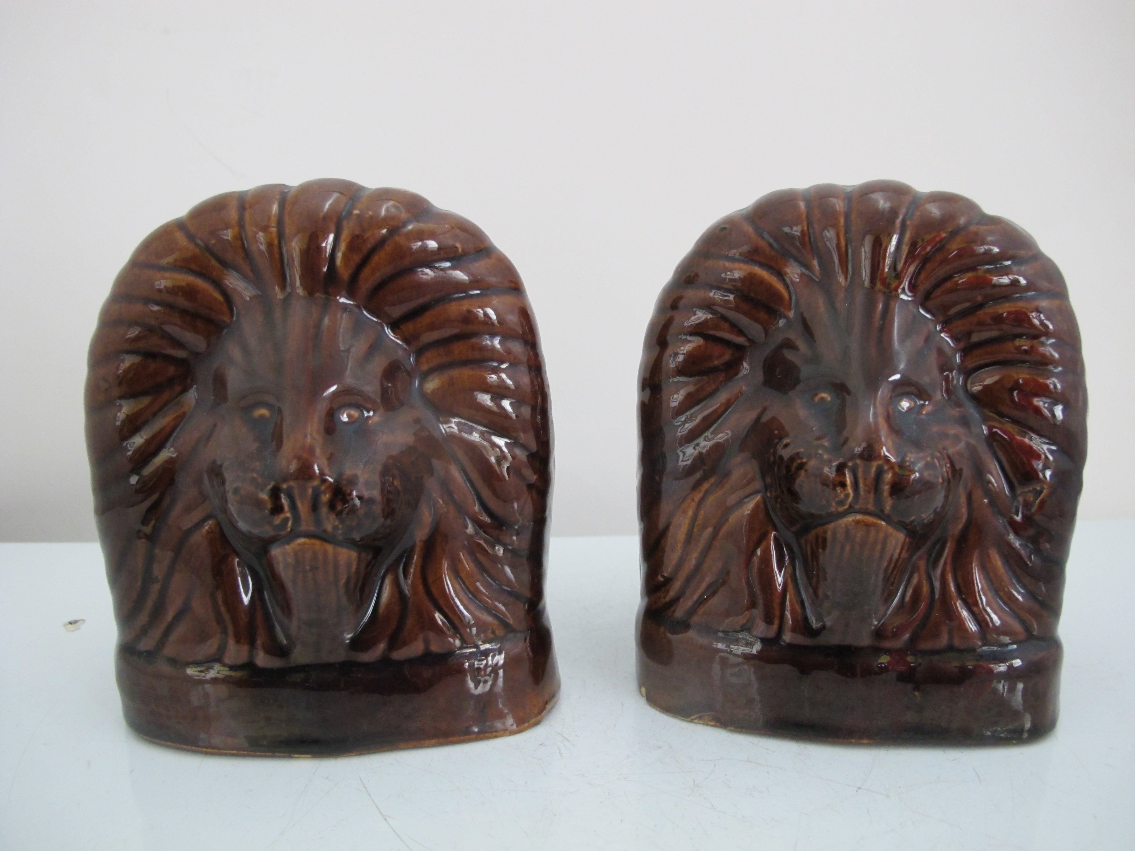 Antique, 19th century pair of window rests. Glazed brown ceramic in shape of lion's heads. Each measures 5" tall x 4 1/4" x 3 1/4". Both are in excellent condition, light wear to glaze and minor chips at base rim.