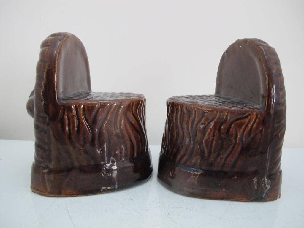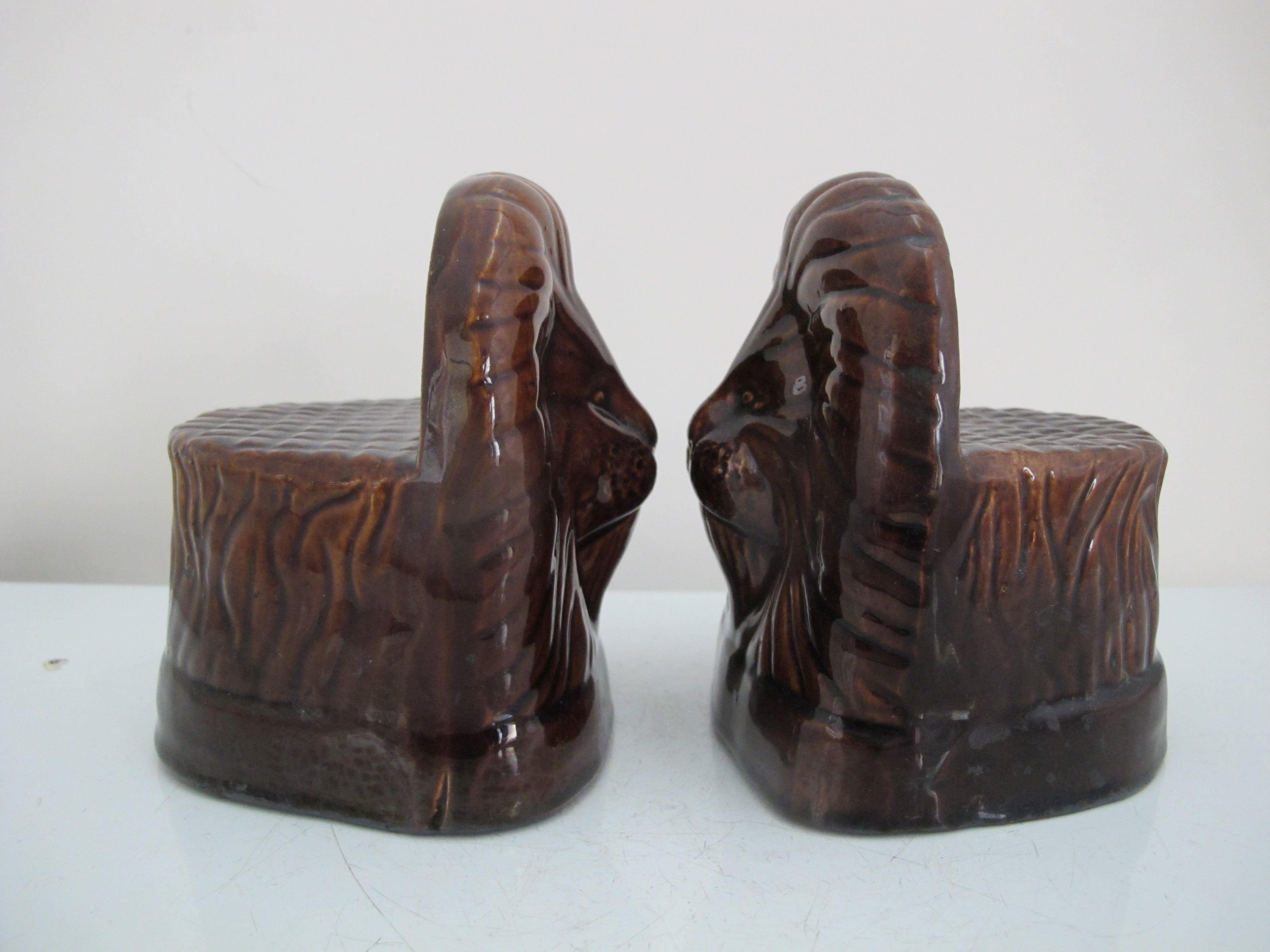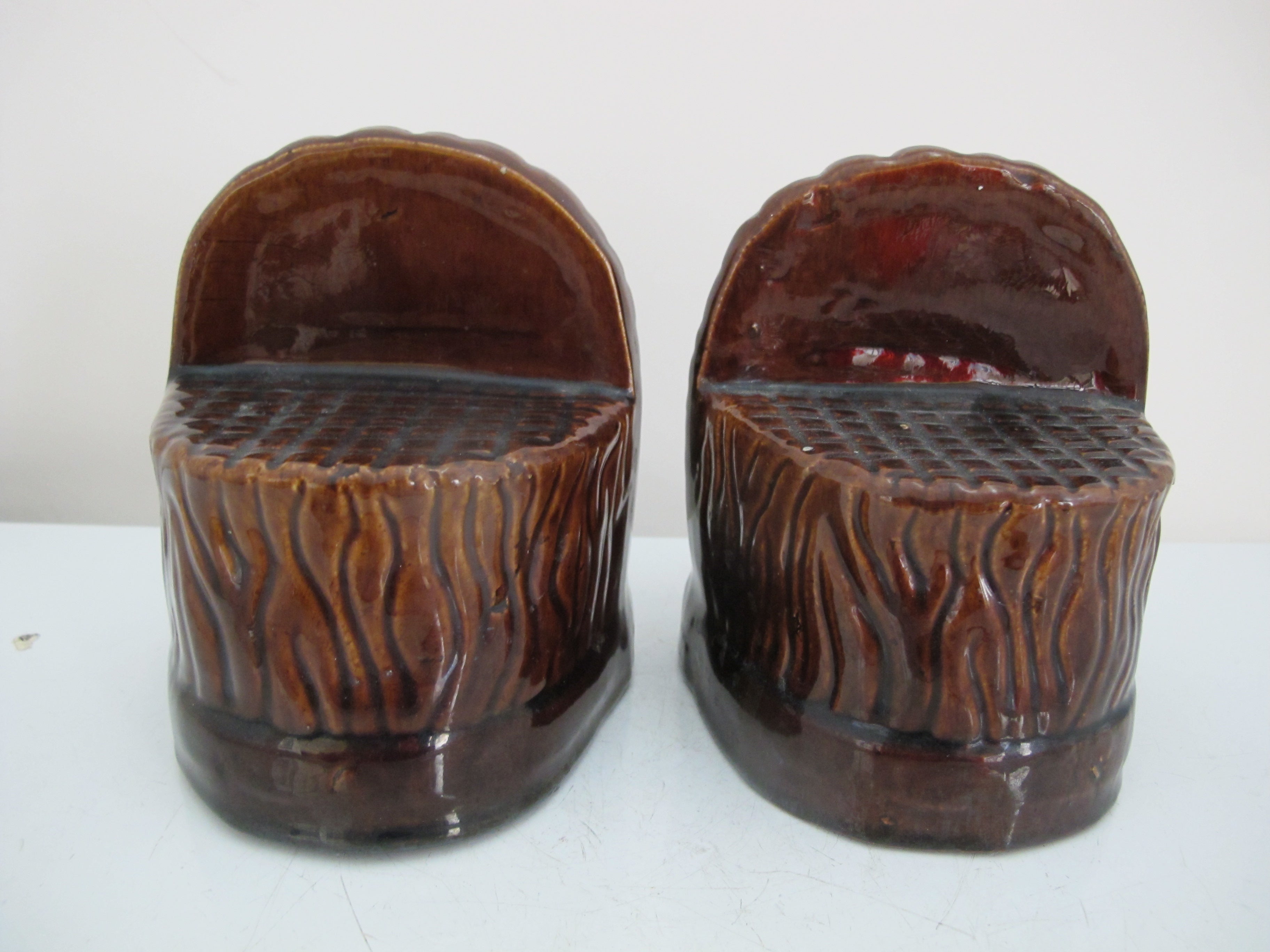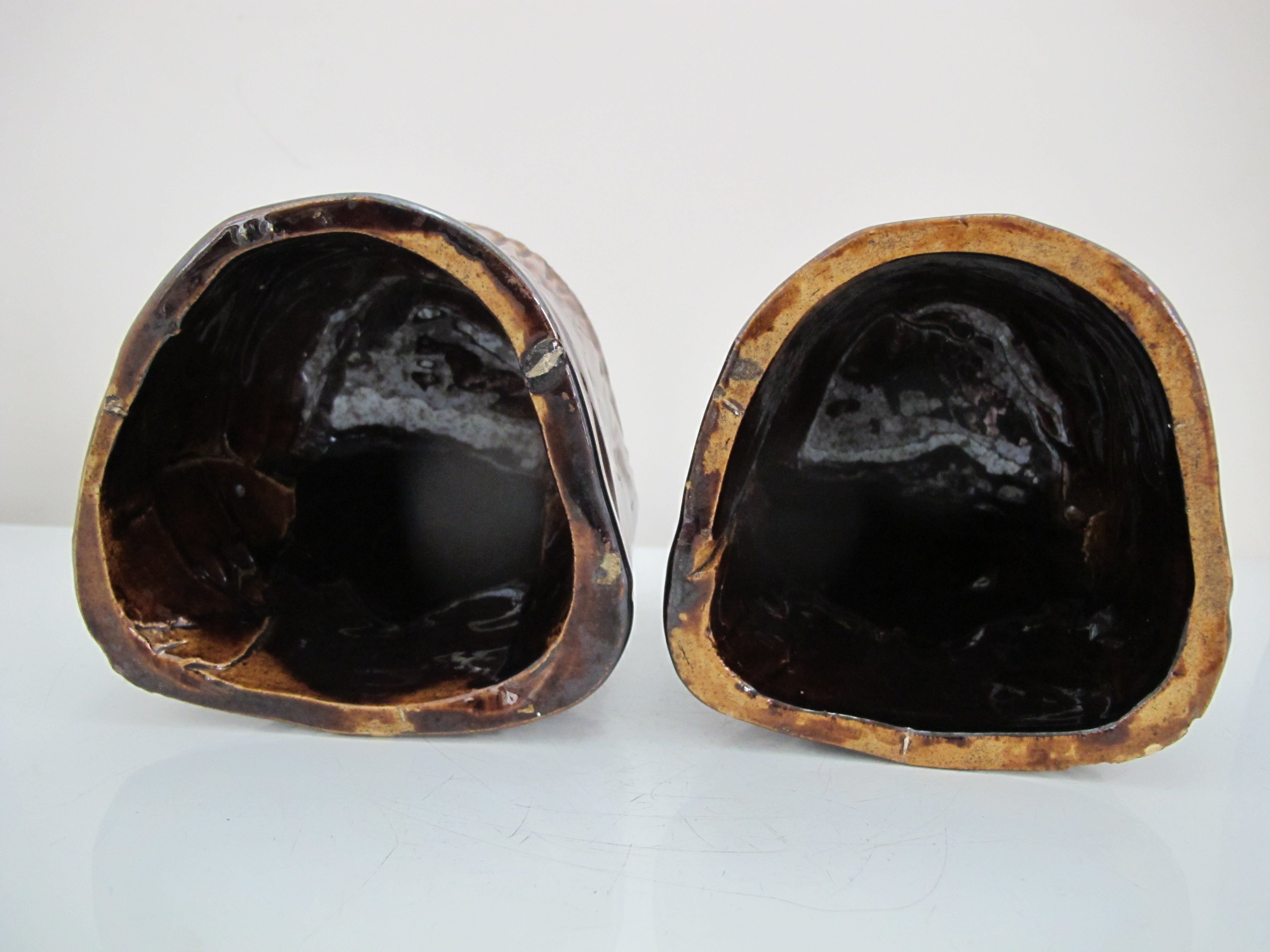 Antique, 19th century pair of window rests. Glazed brown ceramic in shape of lion's heads. Each measures 5" tall x 4 1/4" x 3 1/4". Both are in excellent condition, light wear to glaze and minor chips at base rim.