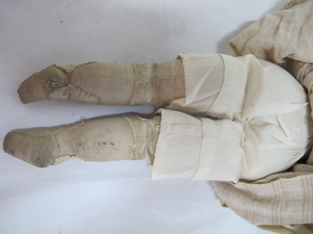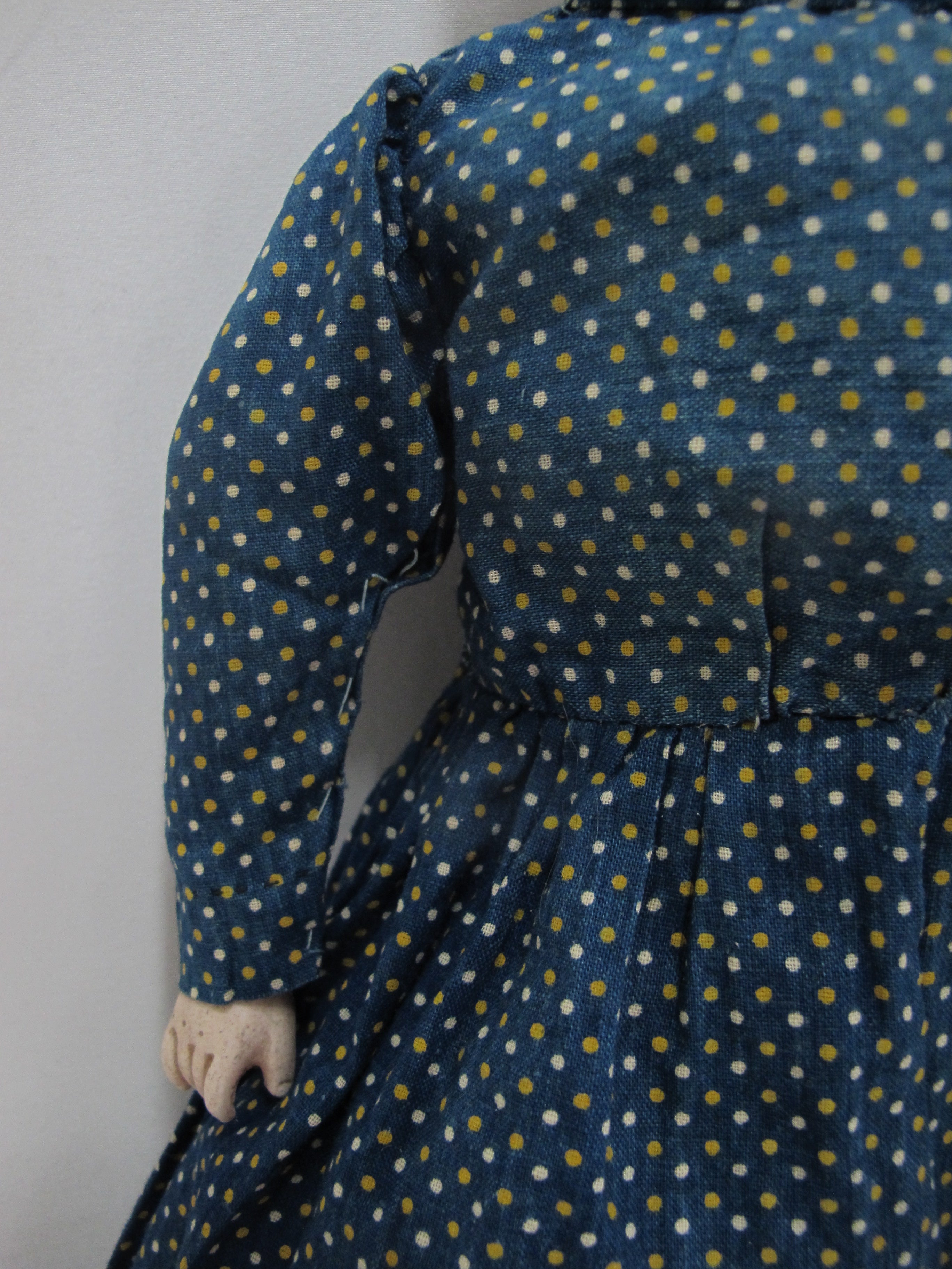 Measures 17 1/2". Very good condition, I believe she is in original clothing, hooks at back of dress are loose. Some obvious staining and fading to clothing and body, light wear to paint at head, but overall very good for her old age.