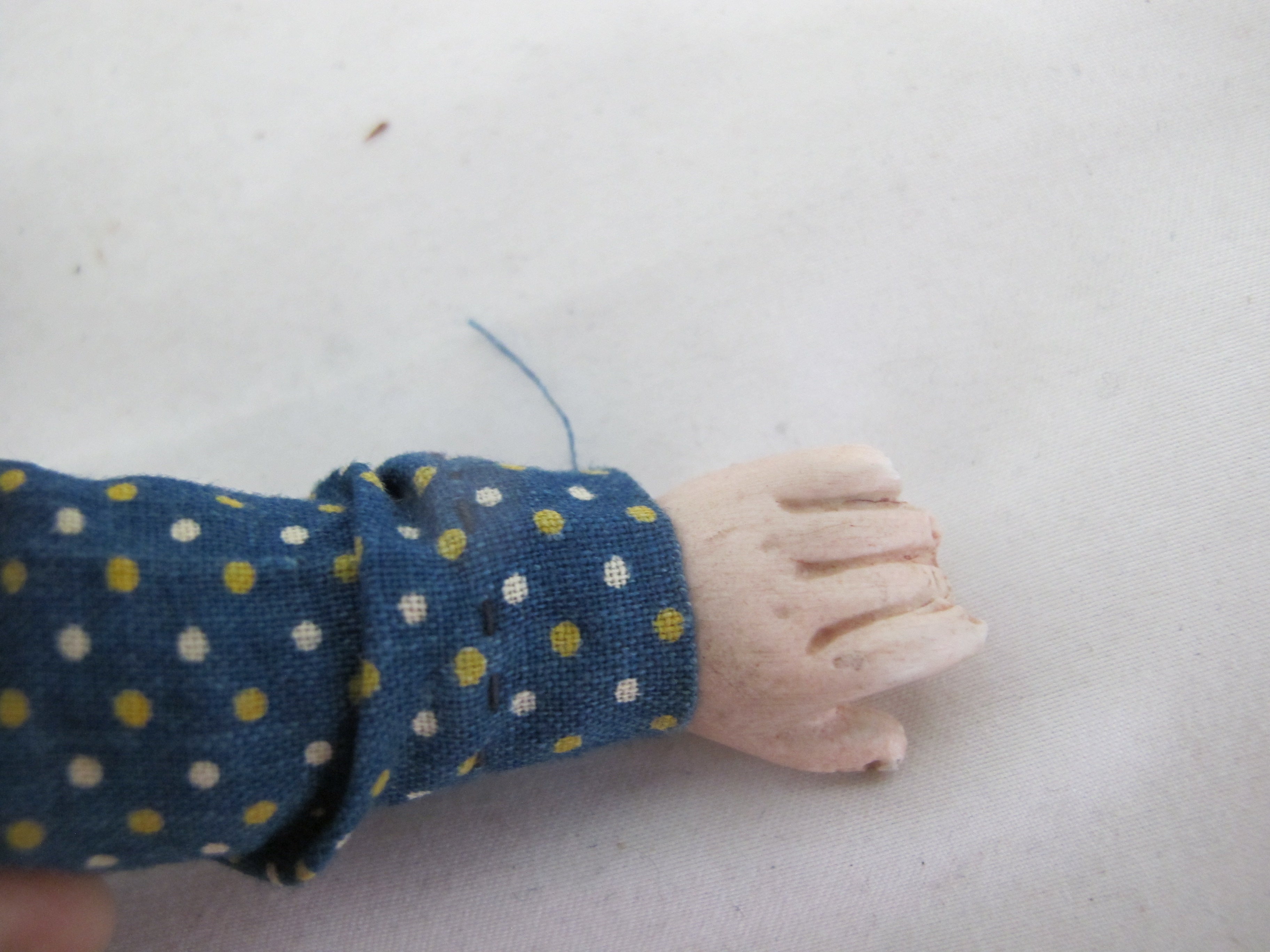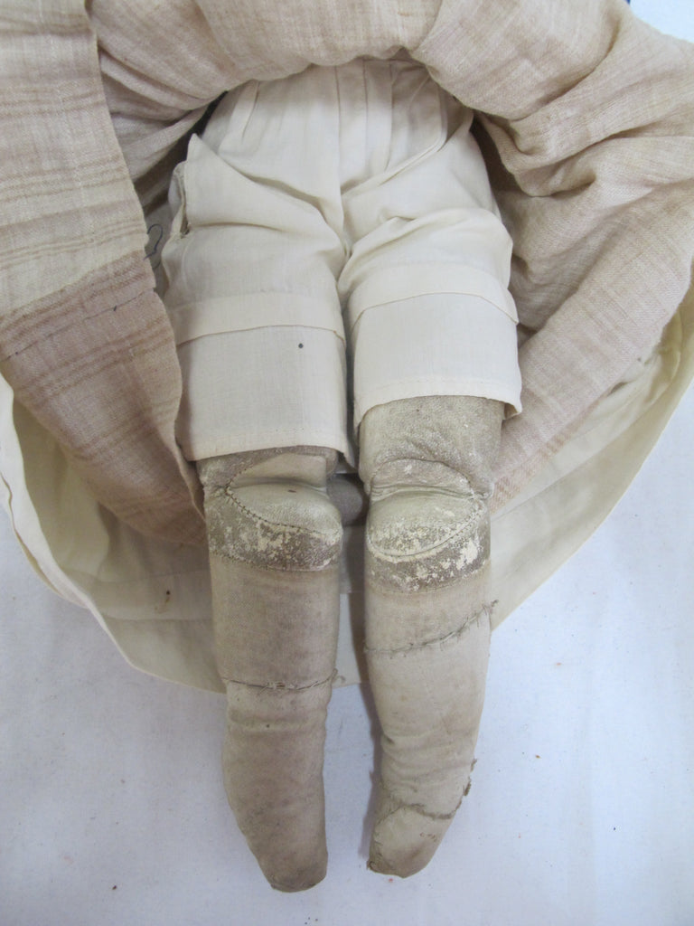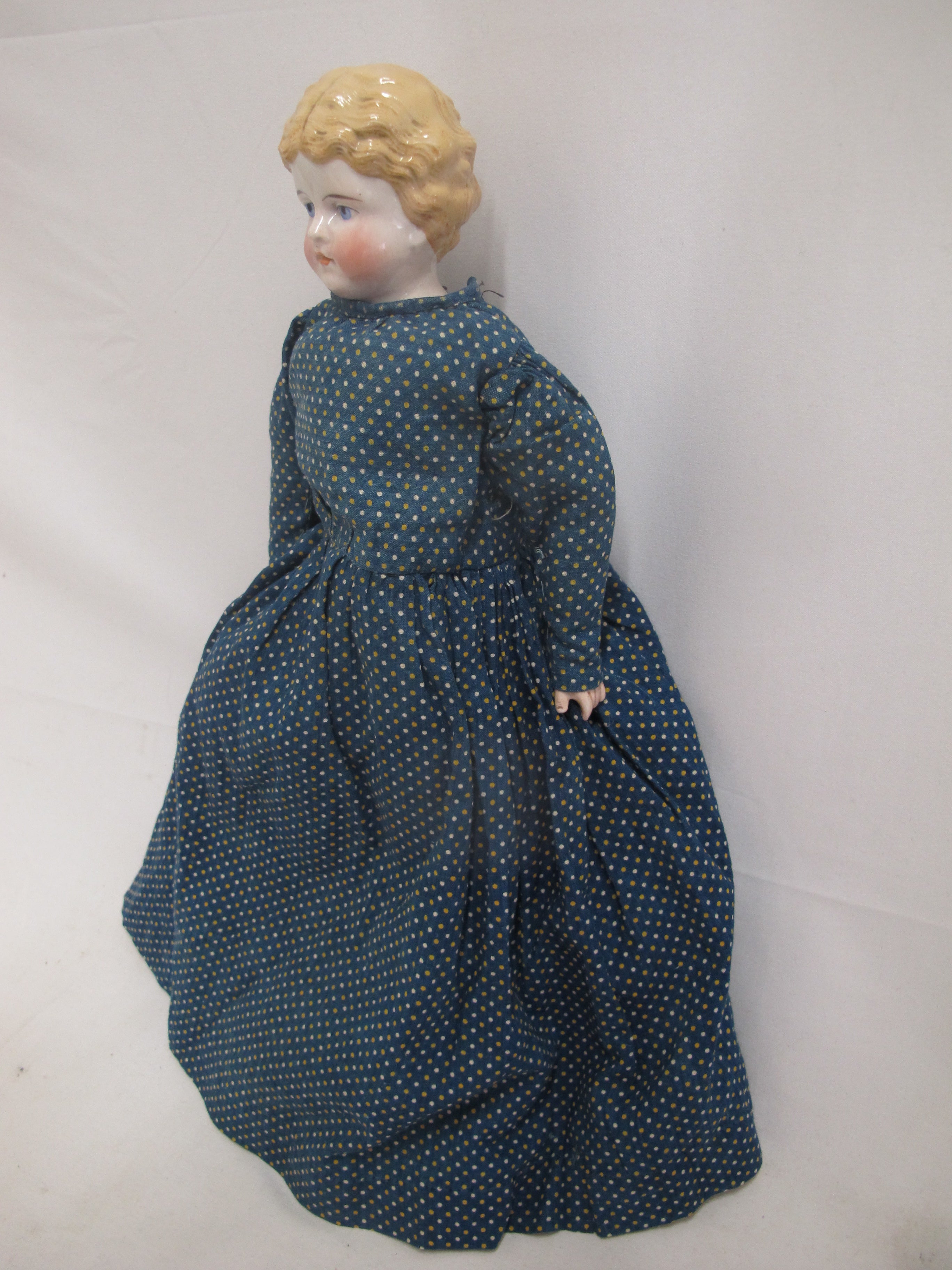Mid to late 19th century, German Colonial girl doll. Porcelain head and shoulders with leather bodice/arms and legs, cloth feet, bisque hands, and articulated joints, all hand made and hand sewn. Wonderful features of blond hair with center part and molded curls. Piercing blue eyes, sweet rosy cheeks and lips, and one stroke eyebrows.