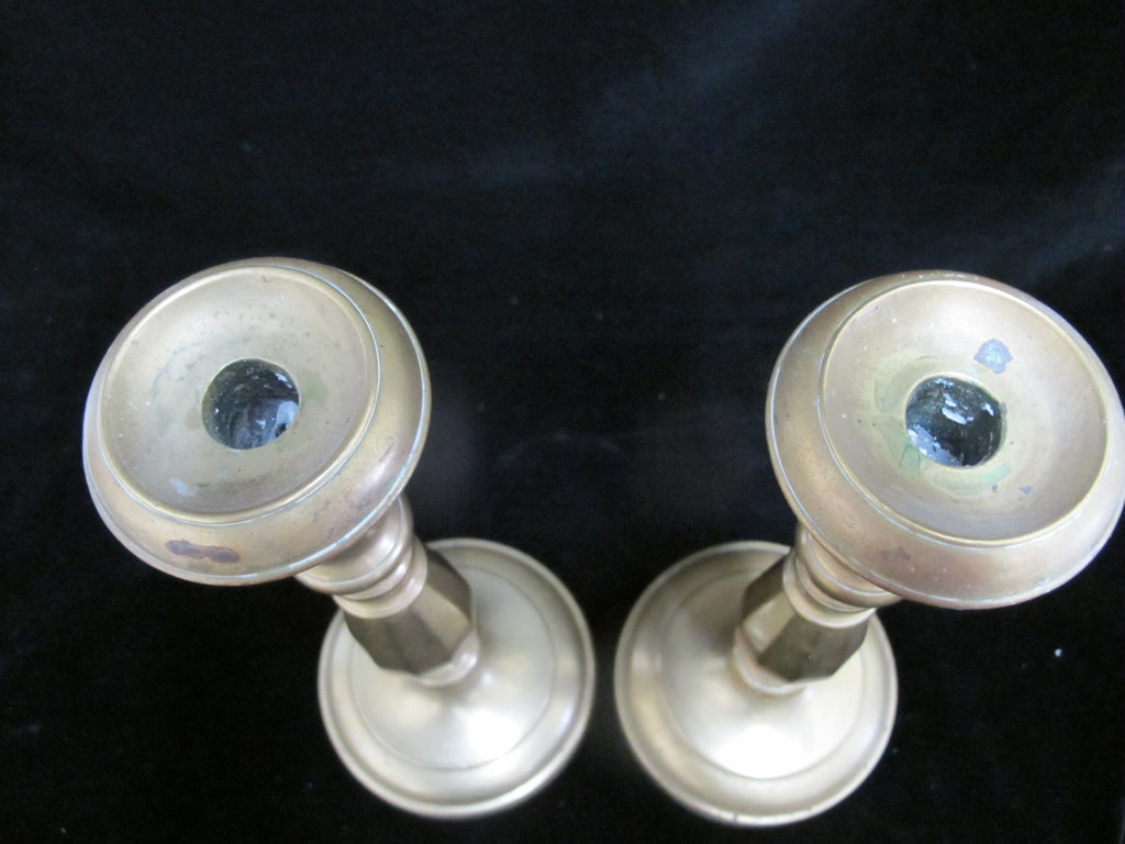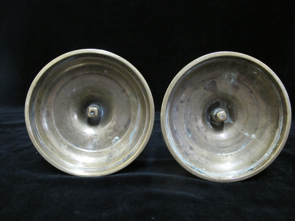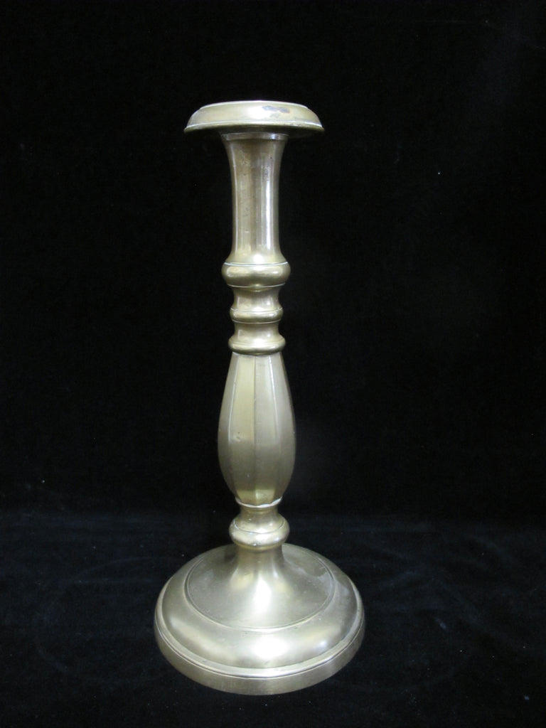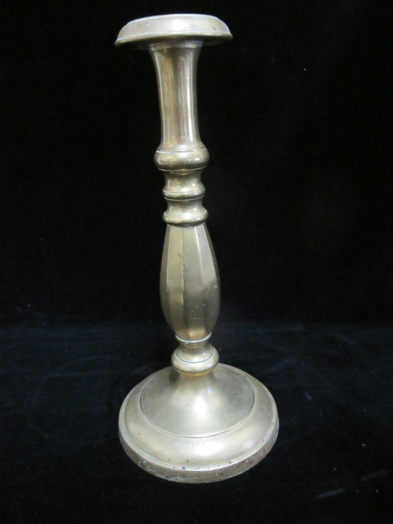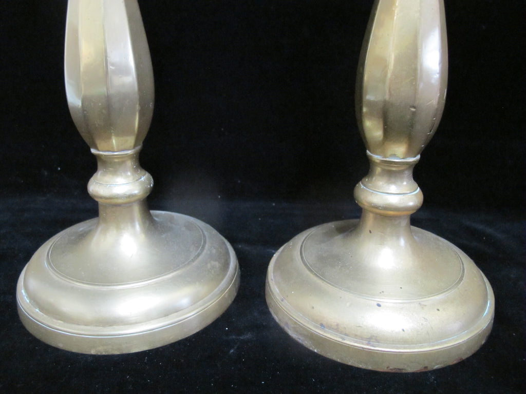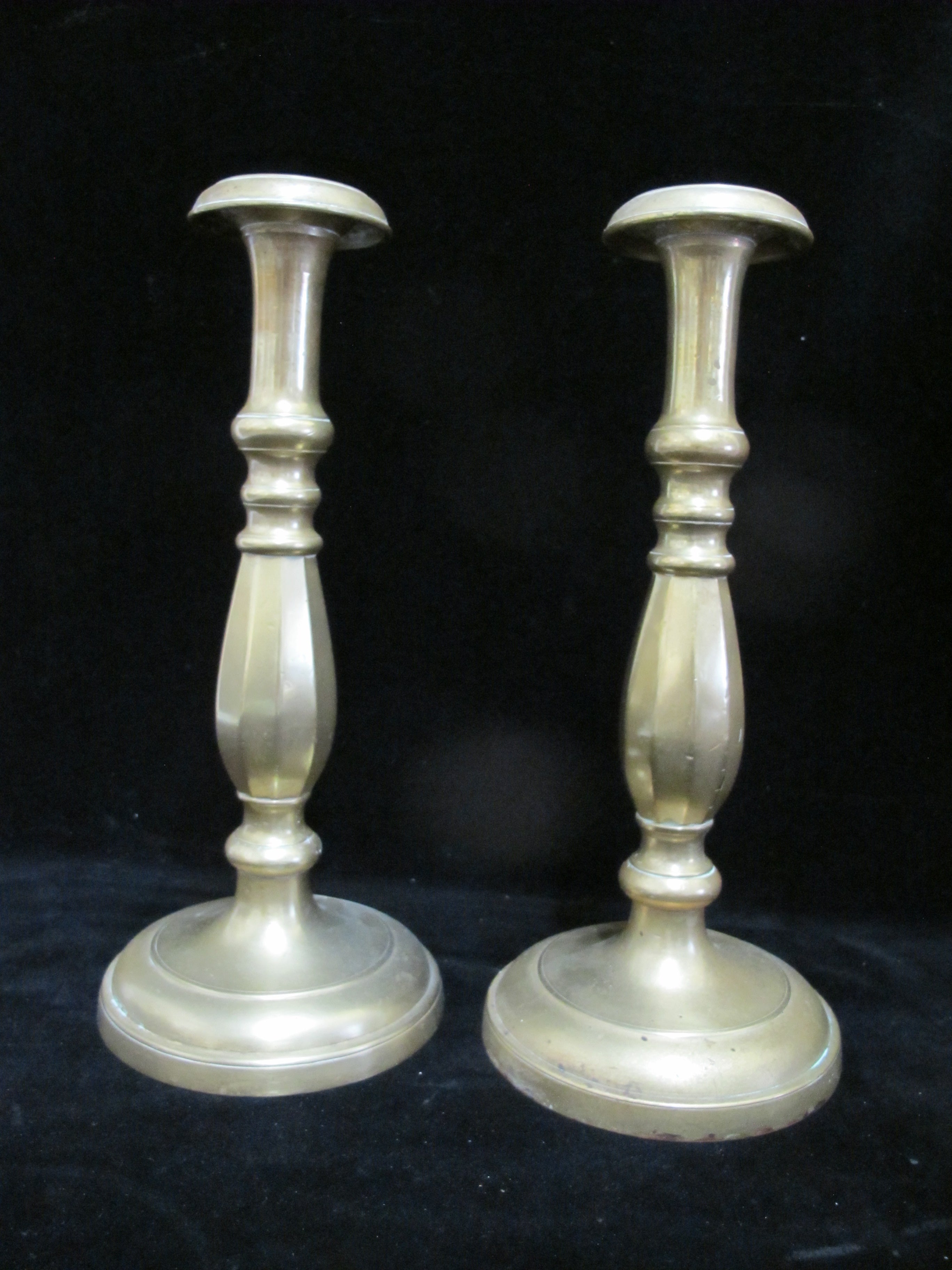 Antique, 18th - 19th century candlesticks. Heavy brass with rounded bases and lobed stems, each measures 12" tall x 5 5/8". Excellent condition, obvious wear, but nothing unusual for age. Total weight of 4157 grams.