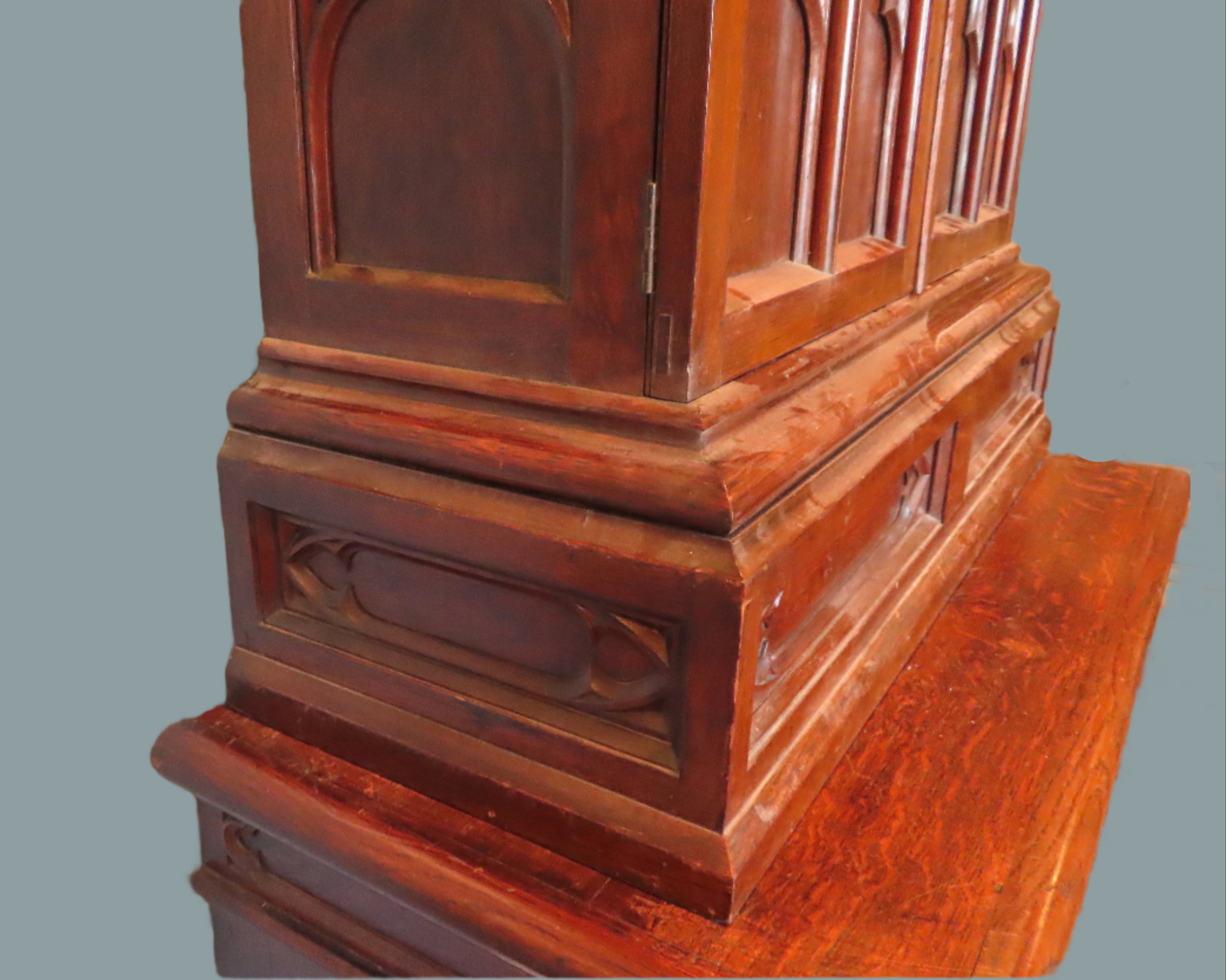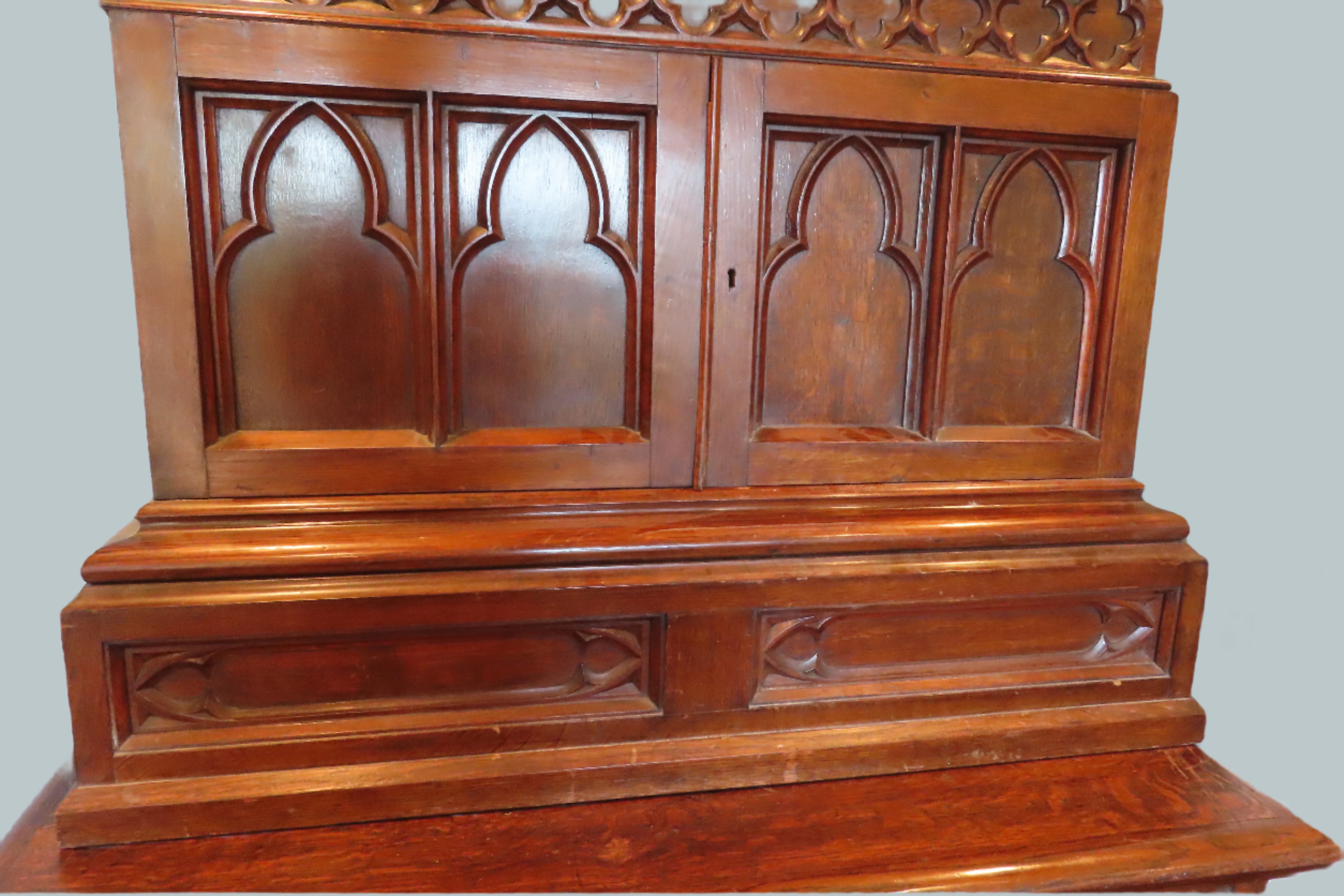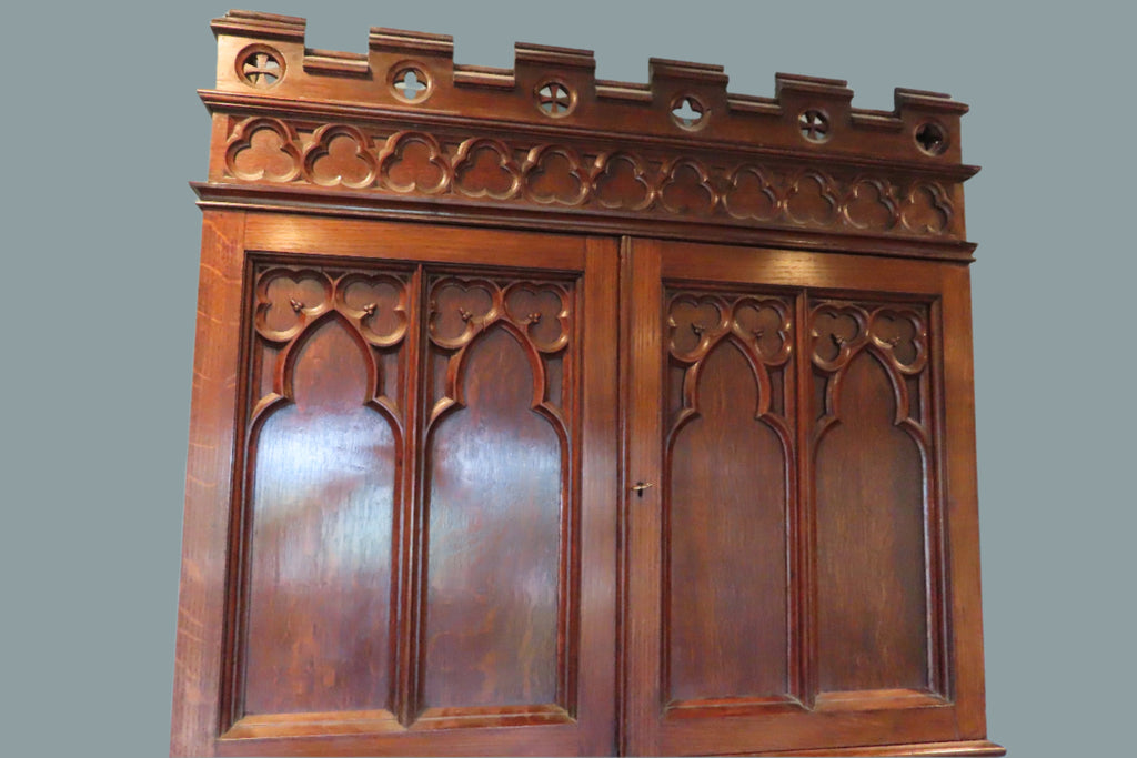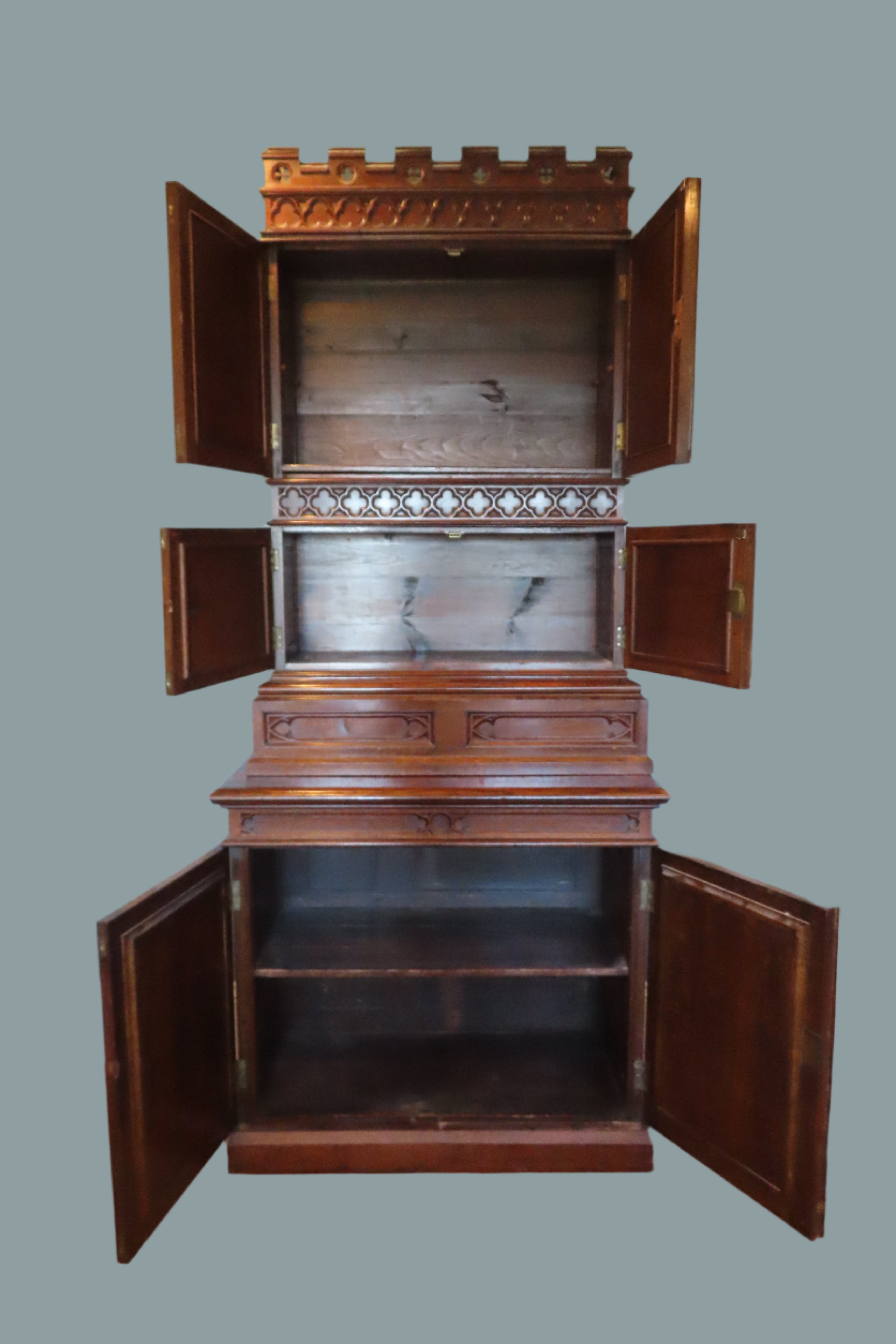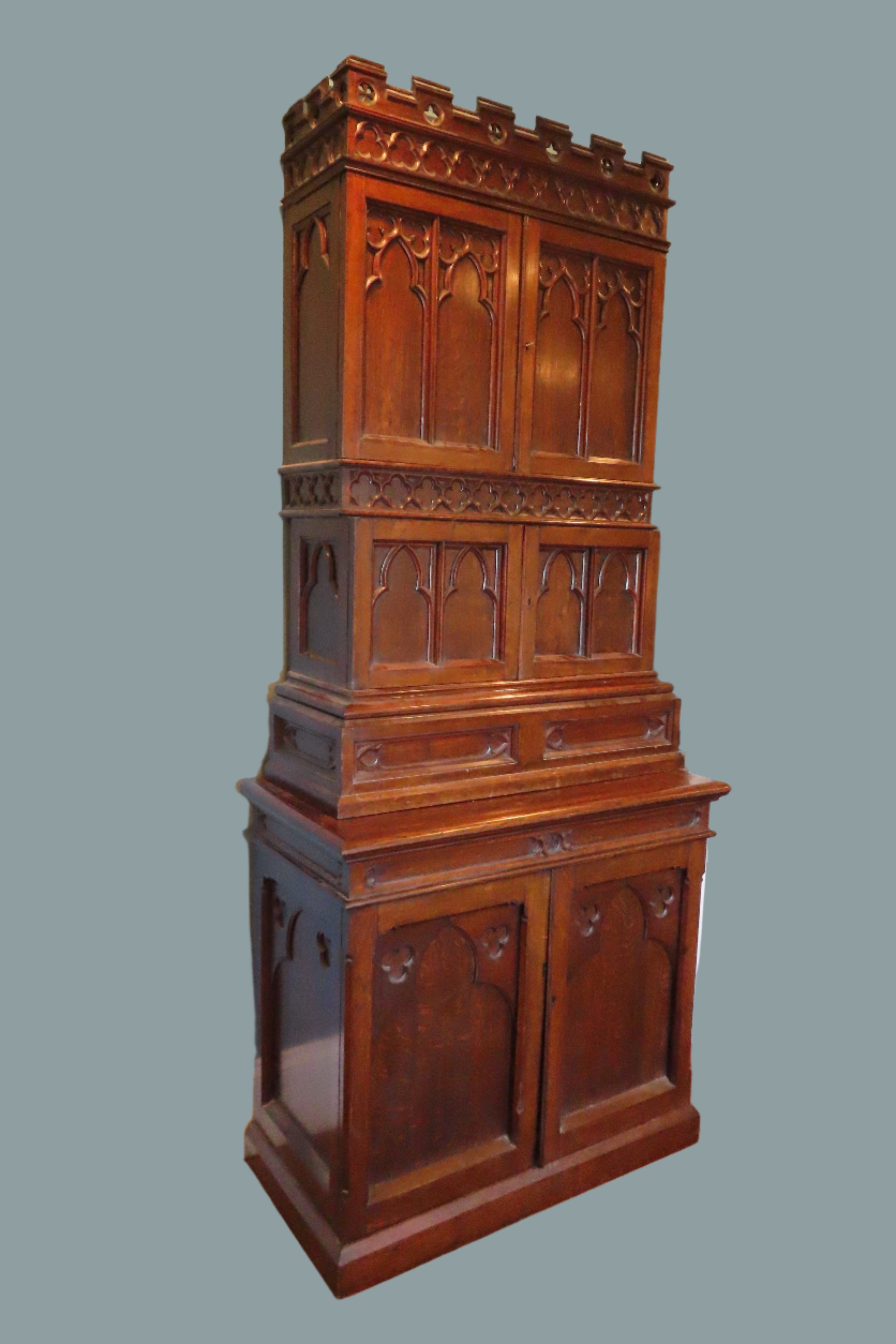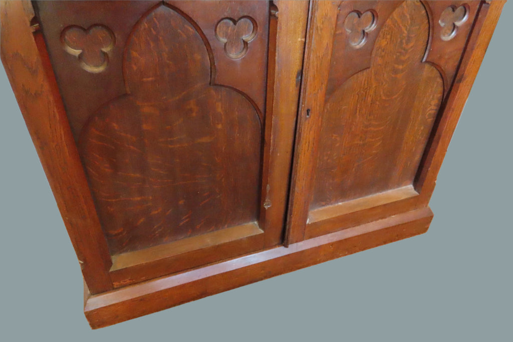 Gorgeous antique three piece oak cabinet with three separate compartments with doors. Each shelf compartment has a locking mechanism, one key is included, works on all three locks. The top outer edge of the top piece is decorated with cathedral like finials. The lack of shelving in the compartments make this cabinet ideal for storing tall items and bulking material.