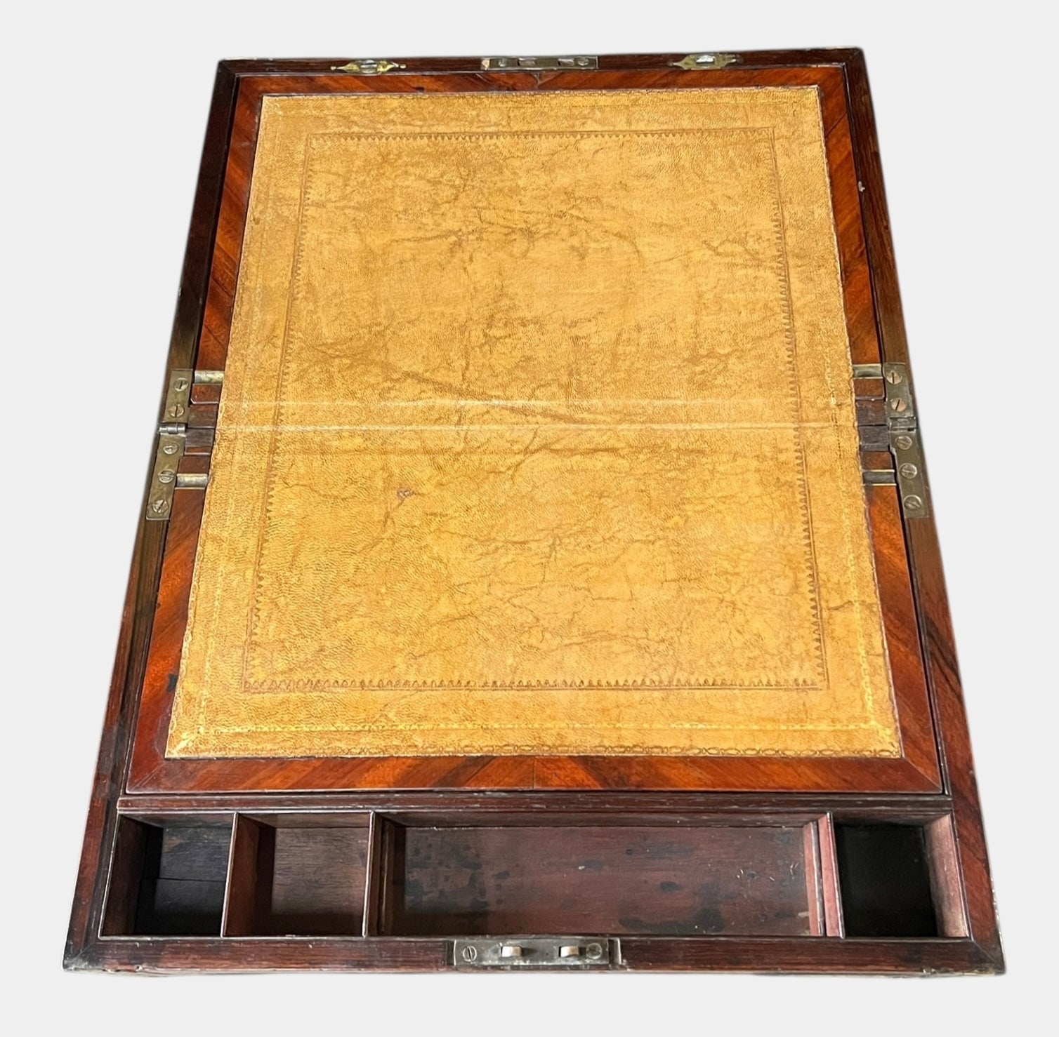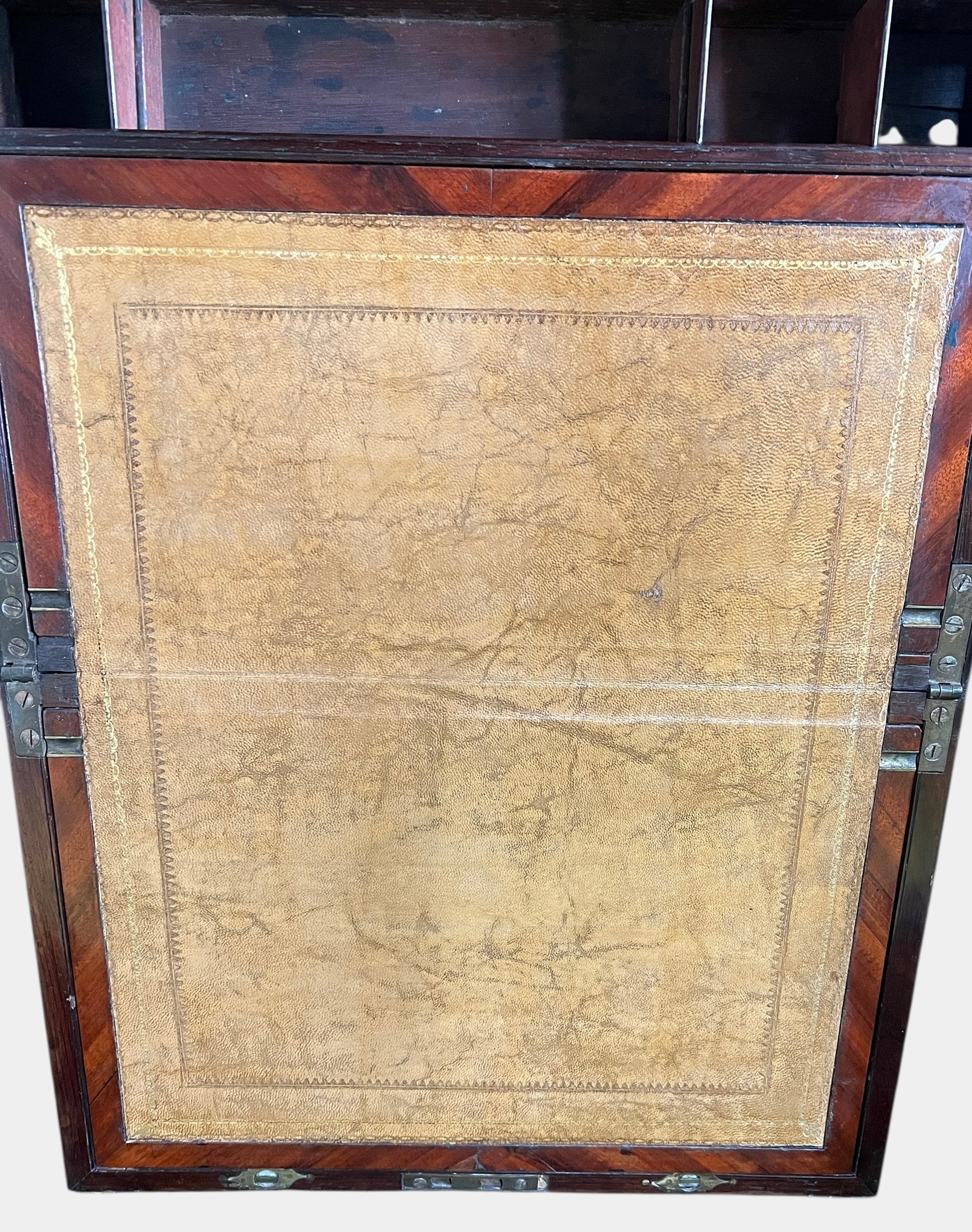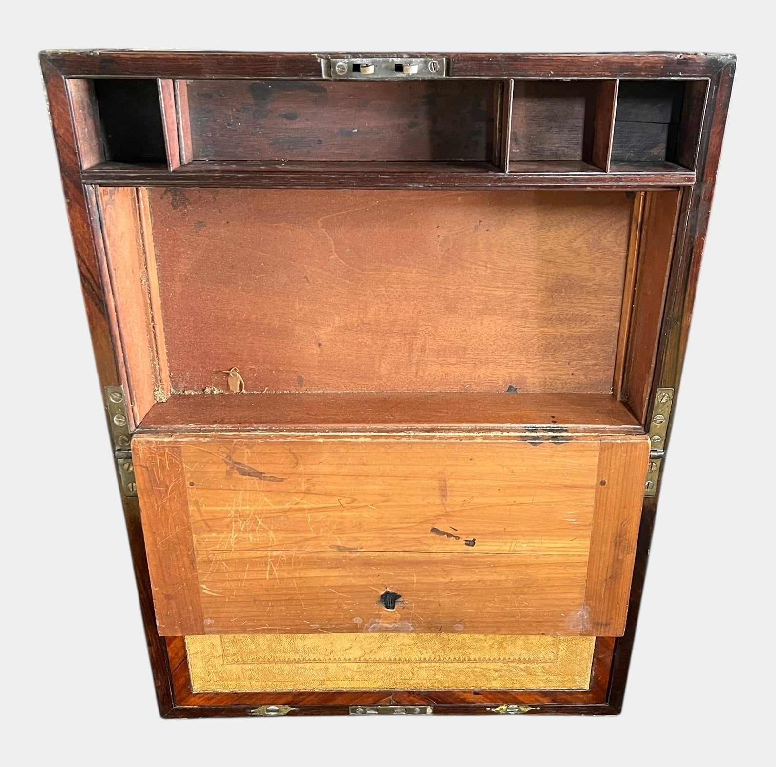 Appears to be in decent condition. Shows some cracks inside of the box, and the top brass piece may need to be re-glued at some point. Missing string pieces to pull the leather drawer up inside of the box. Otherwise, box looks great.