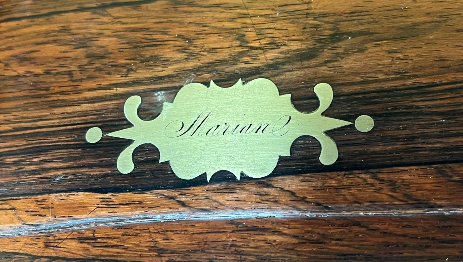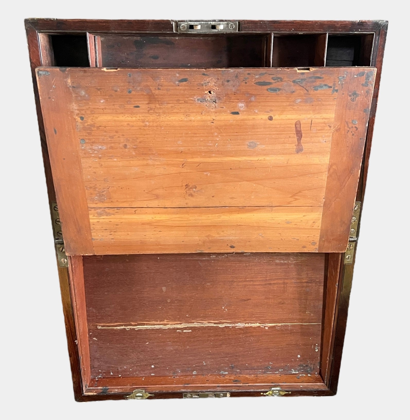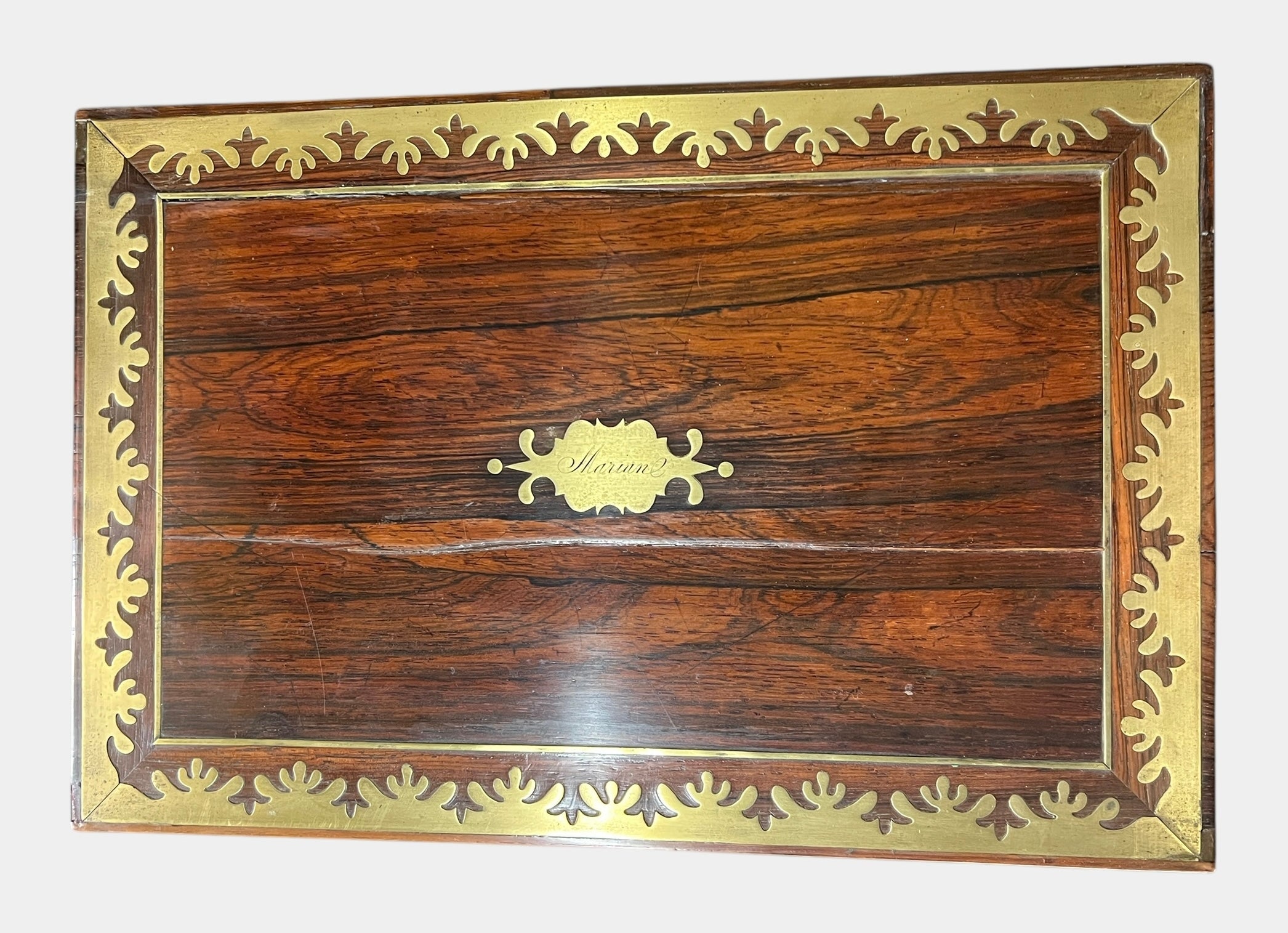 Appears to be in decent condition. Shows some cracks inside of the box, and the top brass piece may need to be re-glued at some point. Missing string pieces to pull the leather drawer up inside of the box. Otherwise, box looks great.