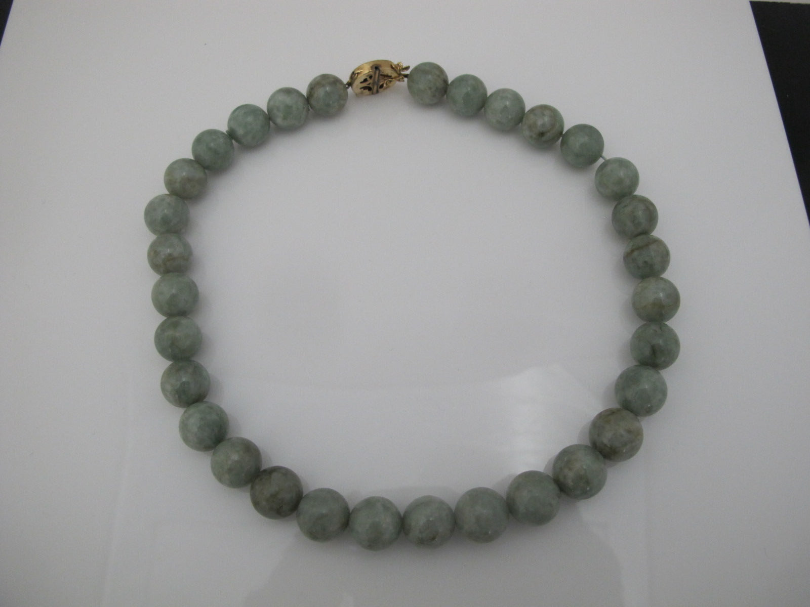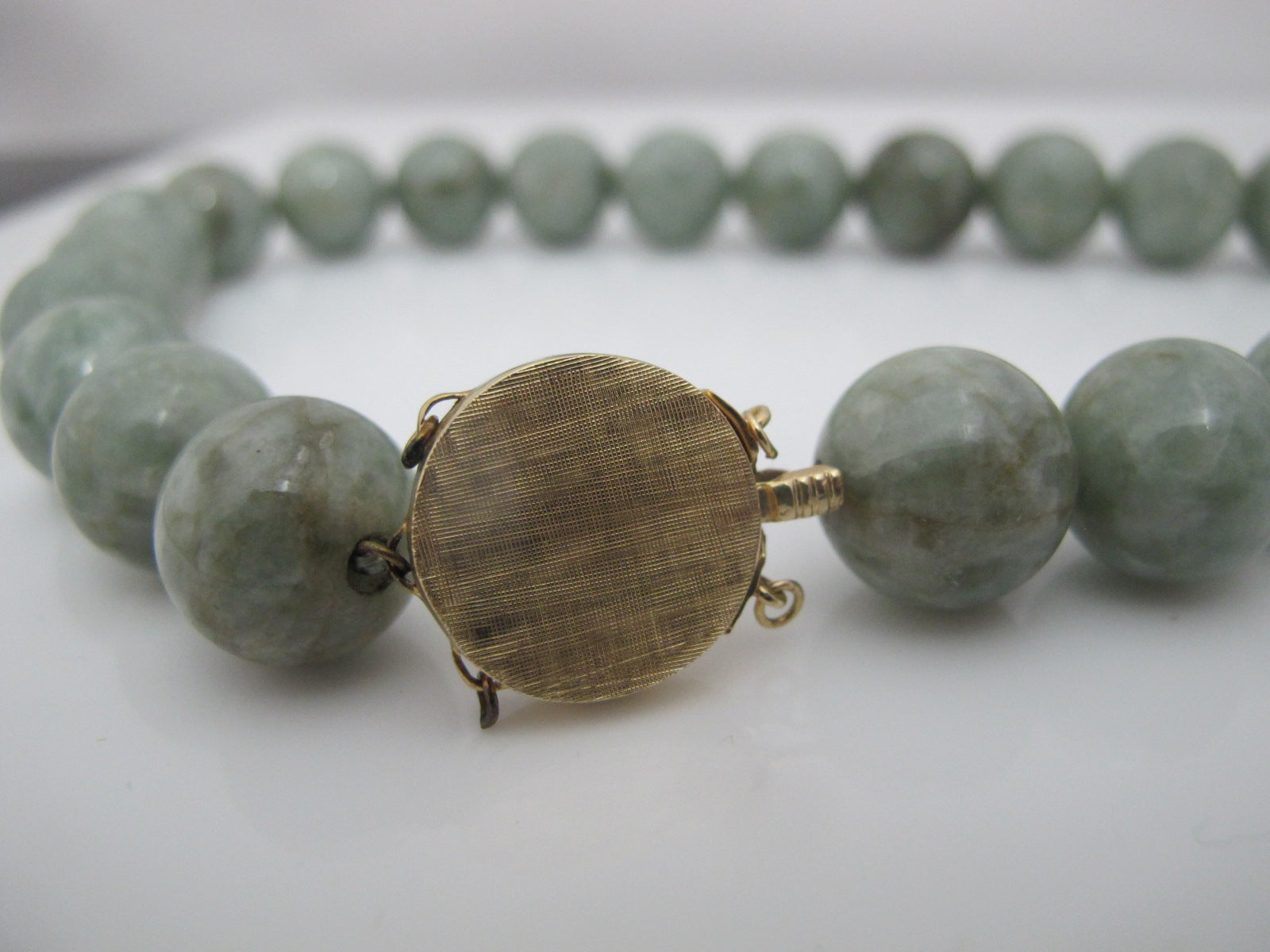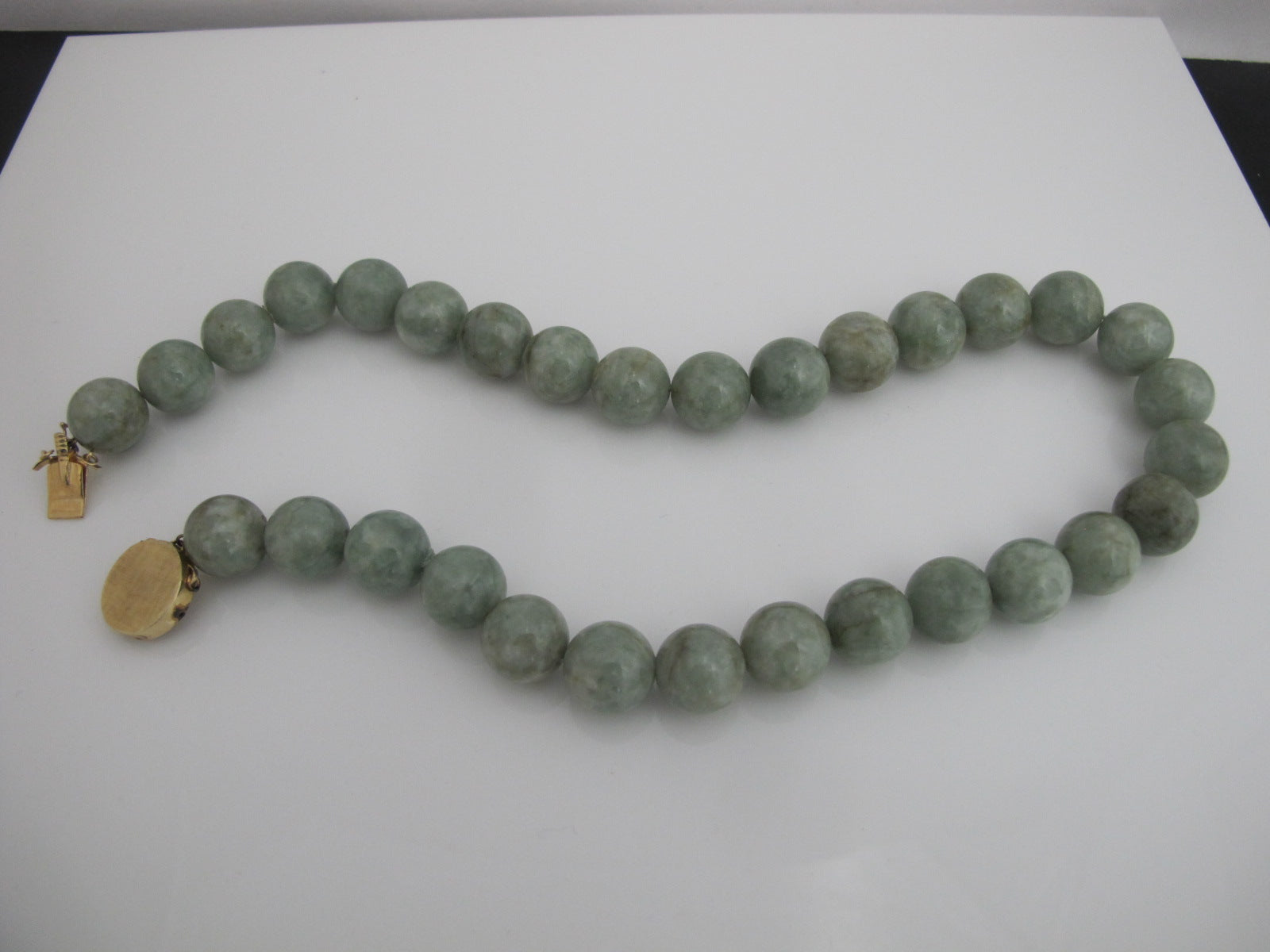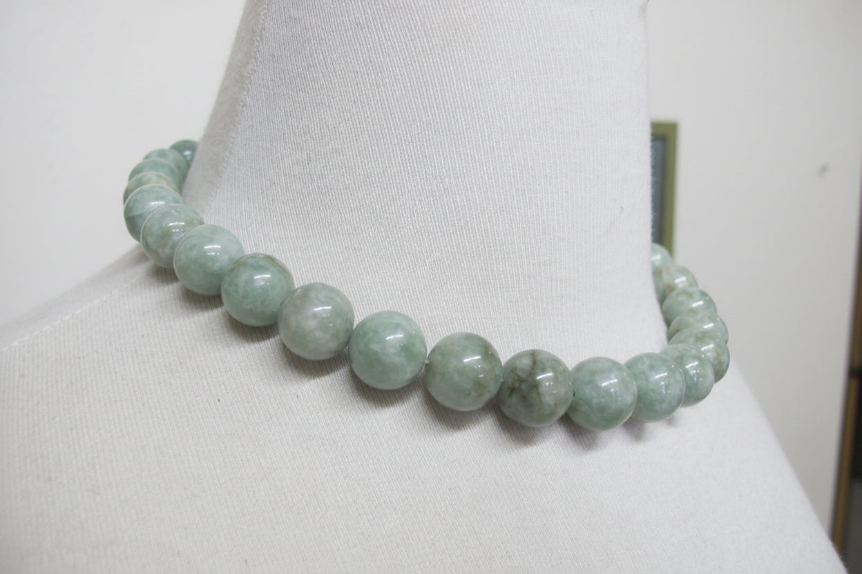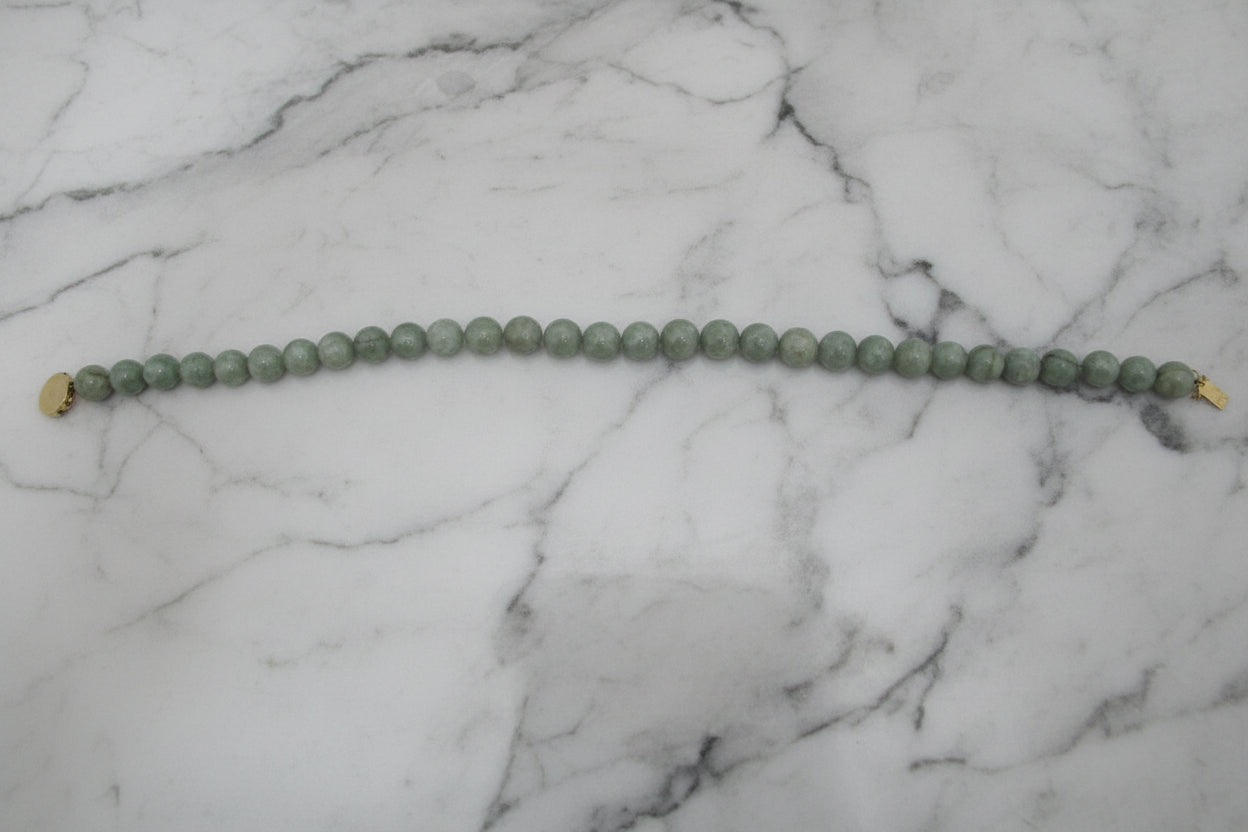 Classic choker style necklace of green Burma beads on cord with 14k yellow gold clasp. Each bead measures approximately 13.9mm.