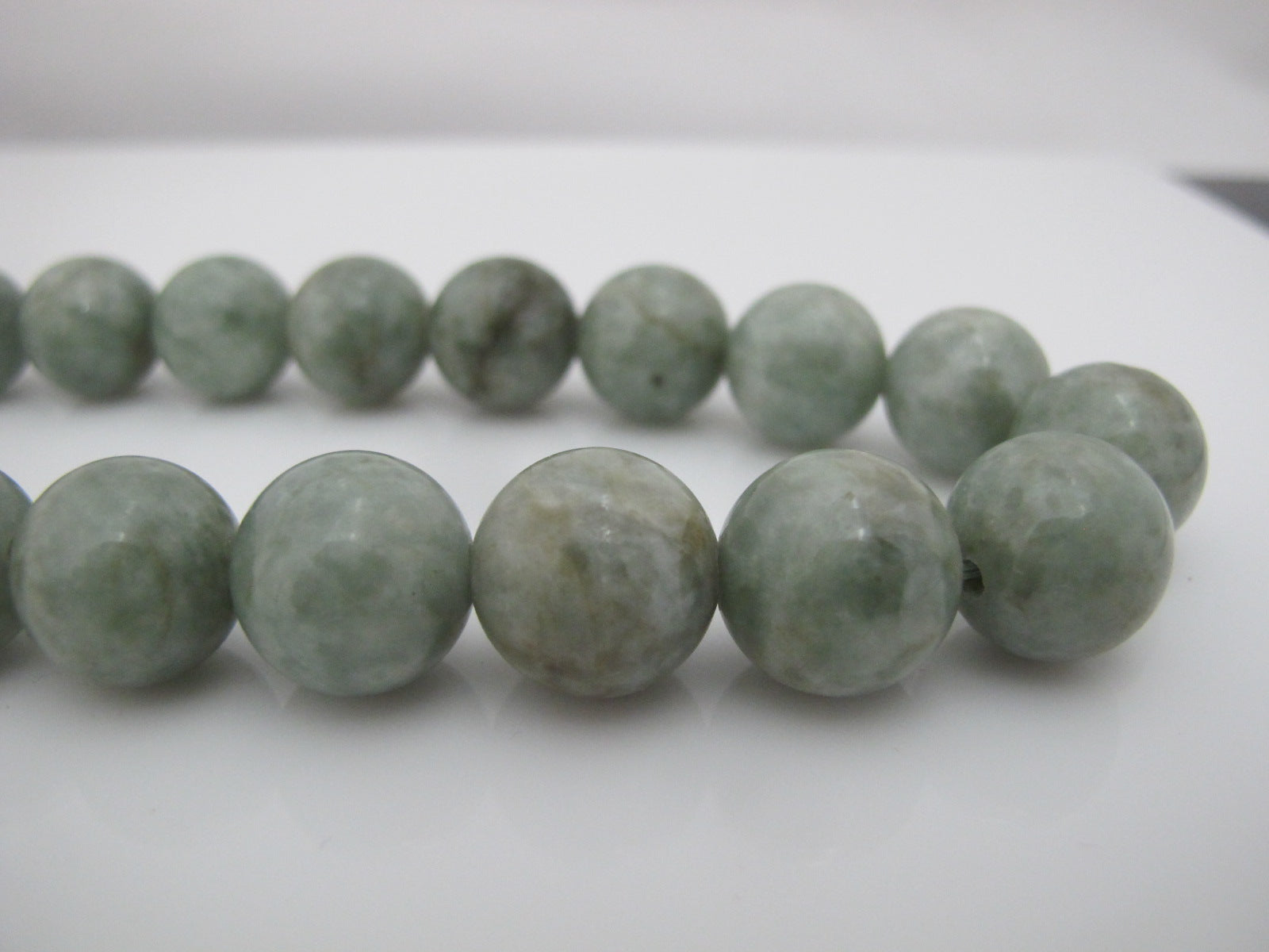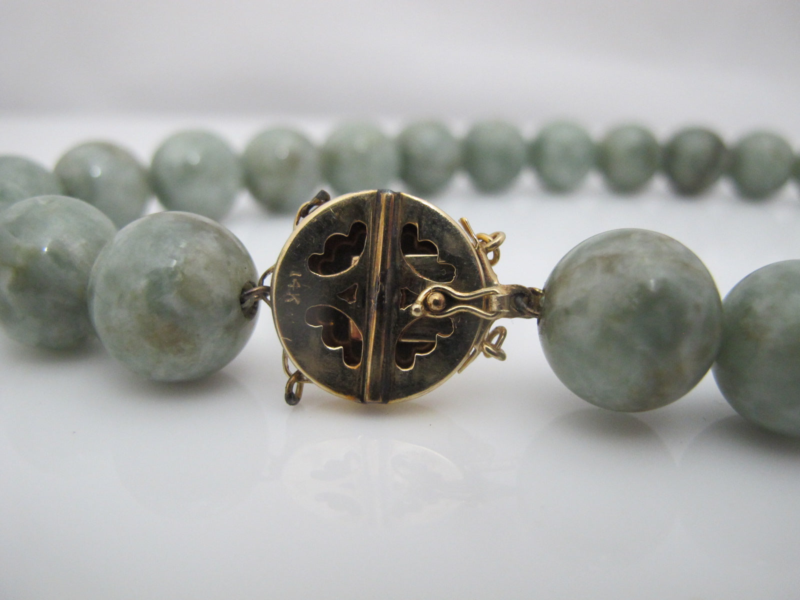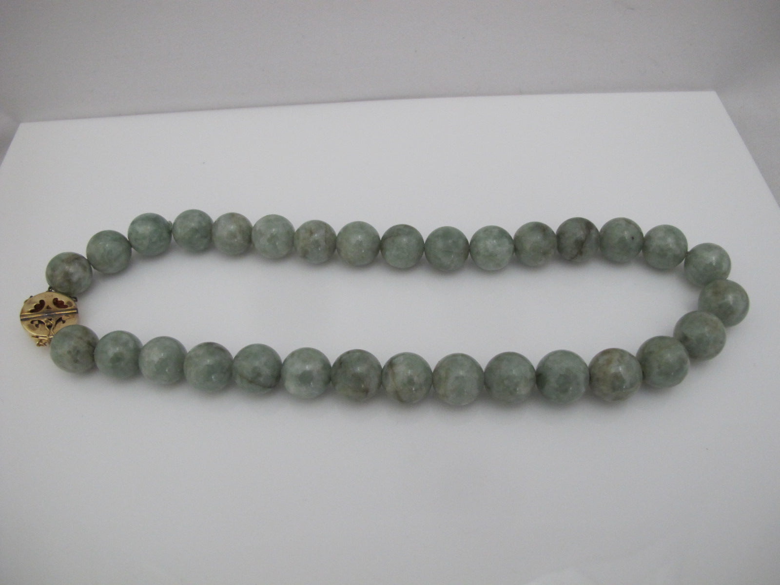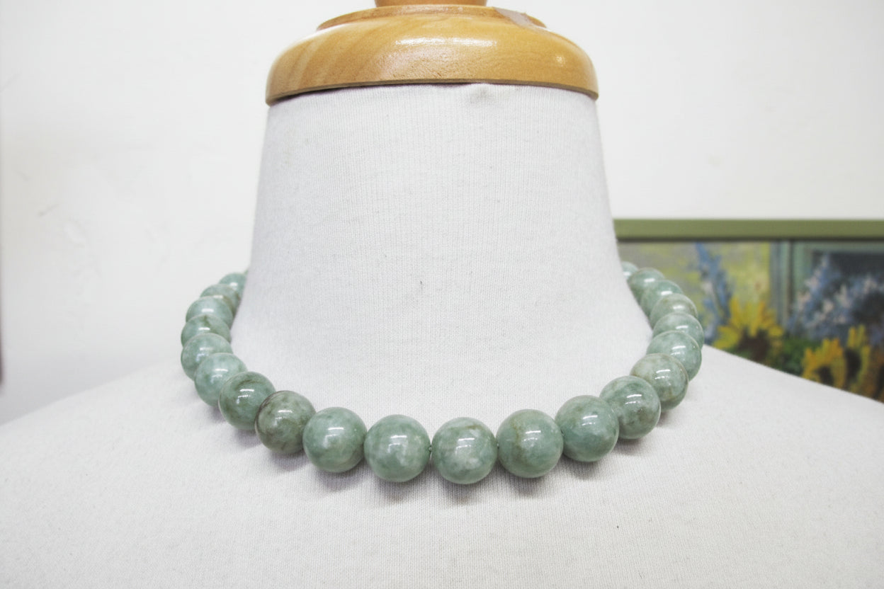 Classic choker style necklace of green Burma beads on cord with 14k yellow gold clasp. Each bead measures approximately 13.9mm.