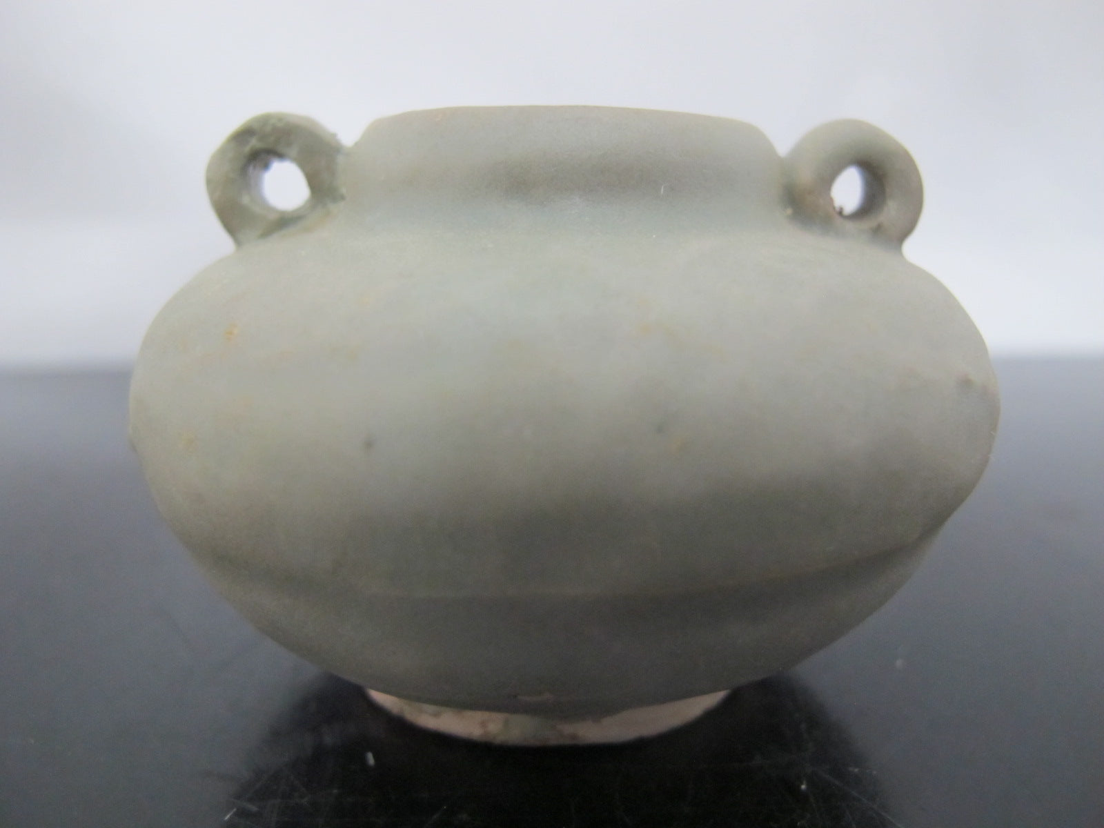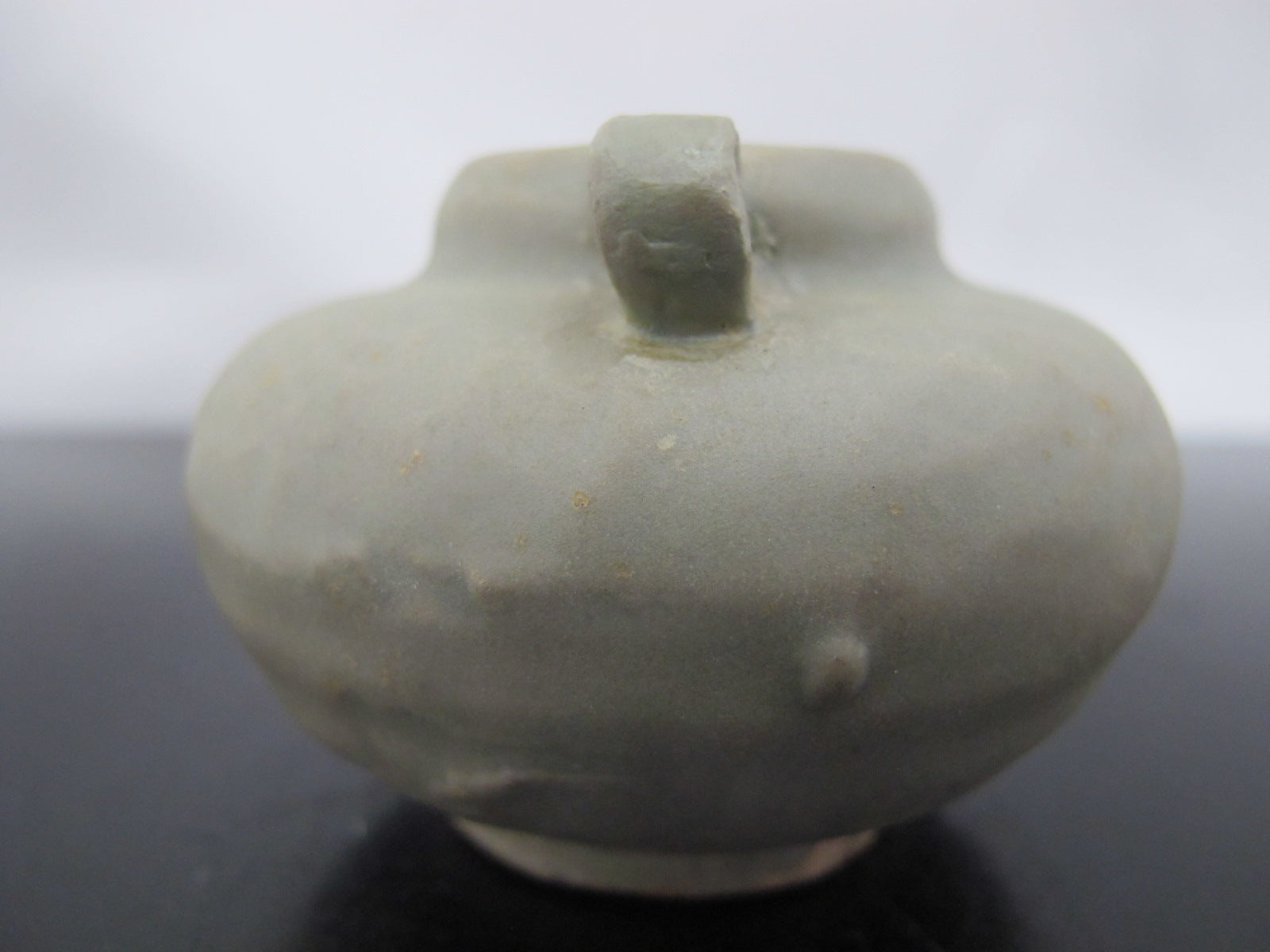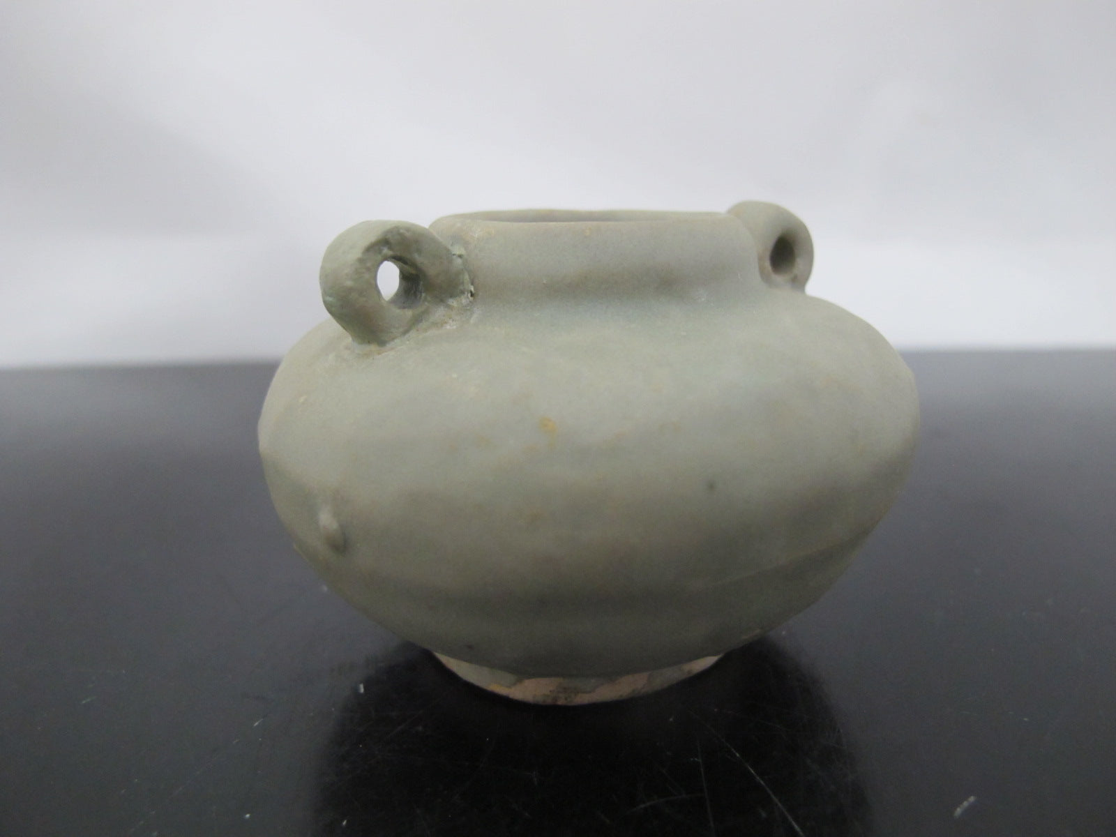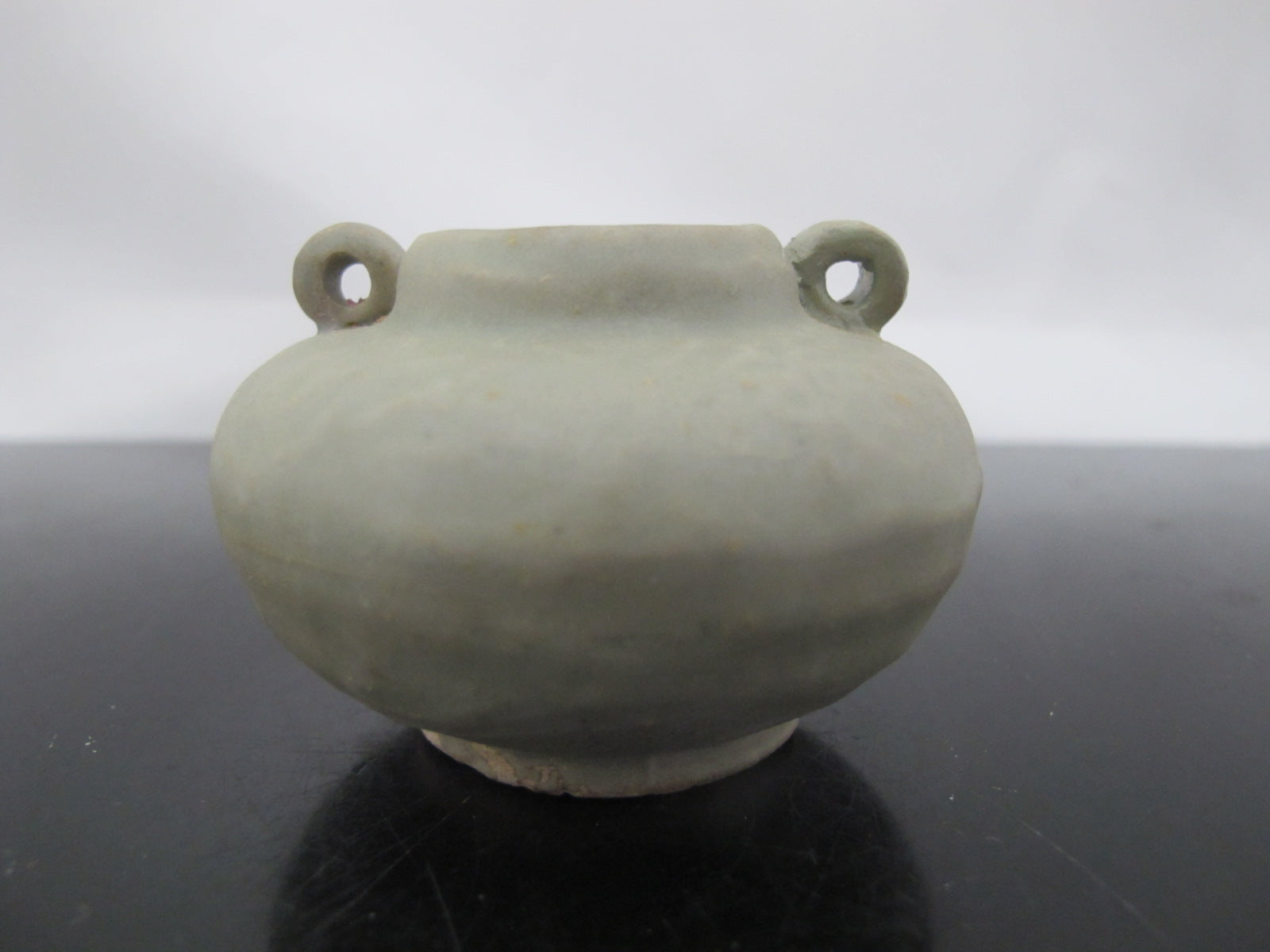 Chinese Longquan celadon glazed jarlet. It features a globular body, two loop handles, and is covered in a characteristic pale sea green hue.
