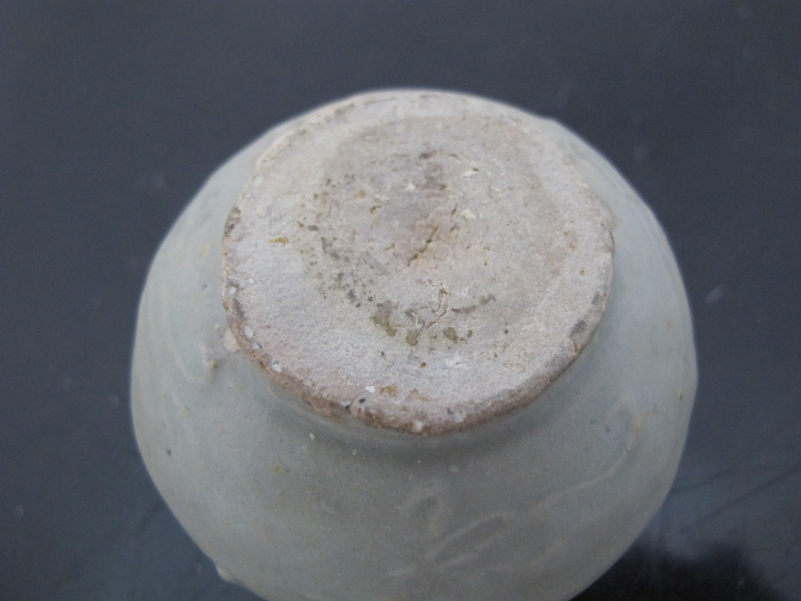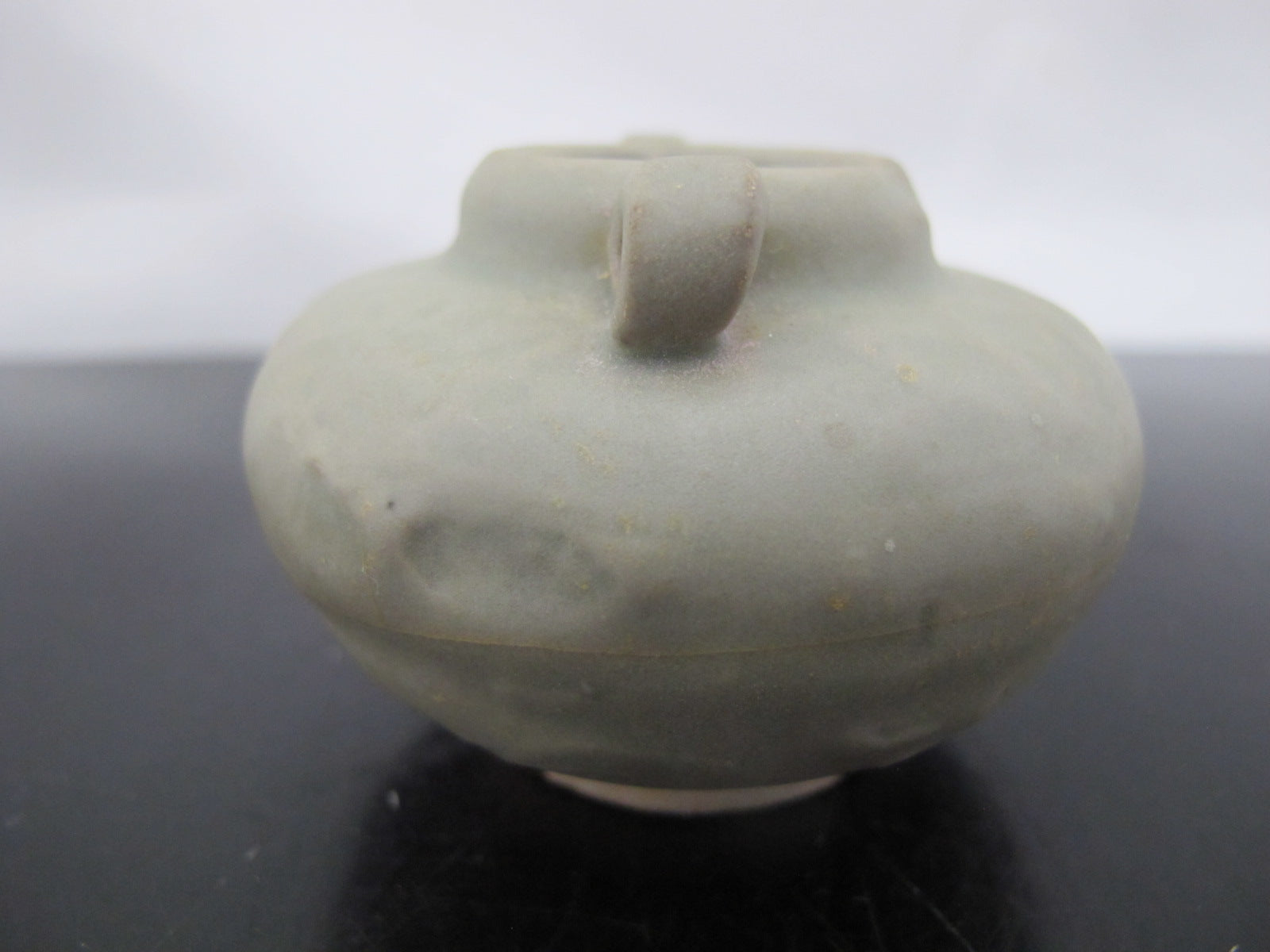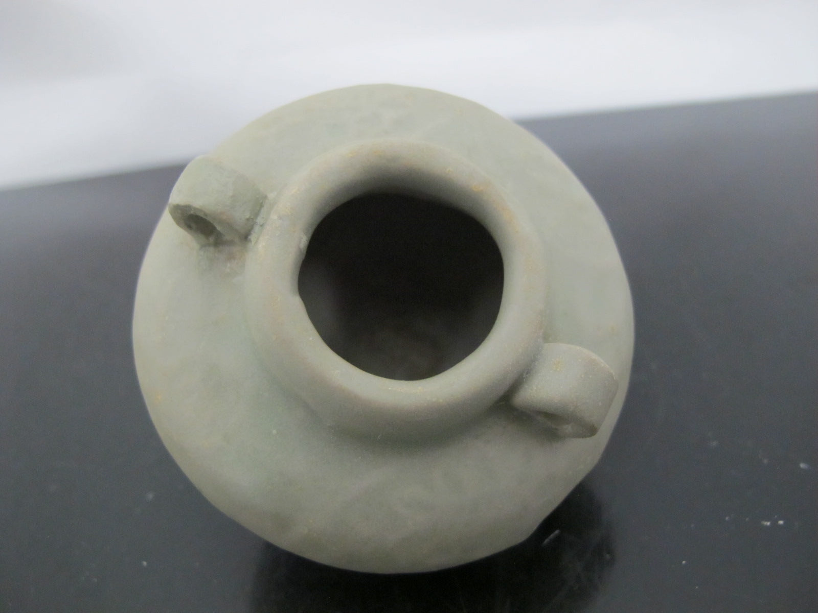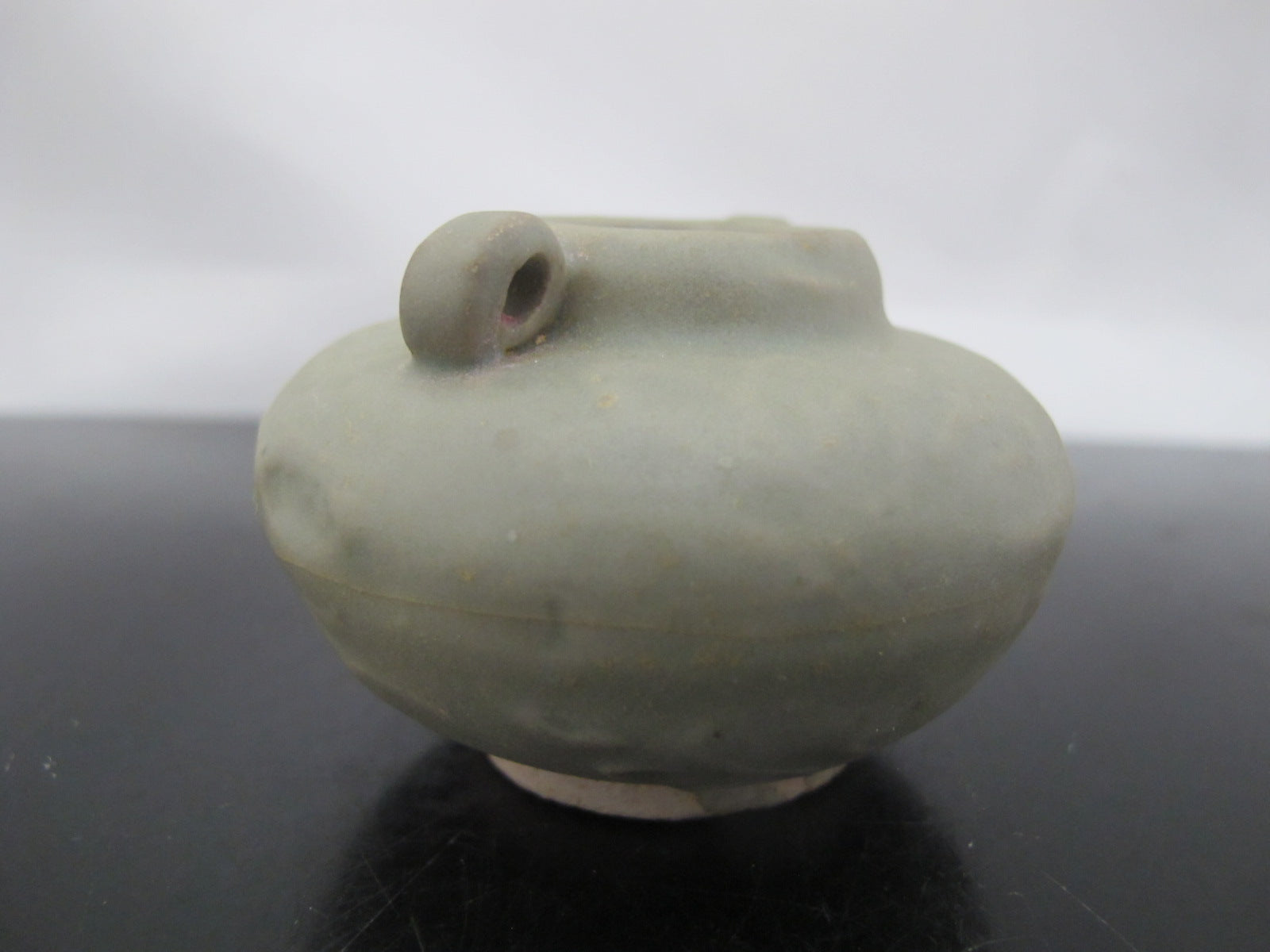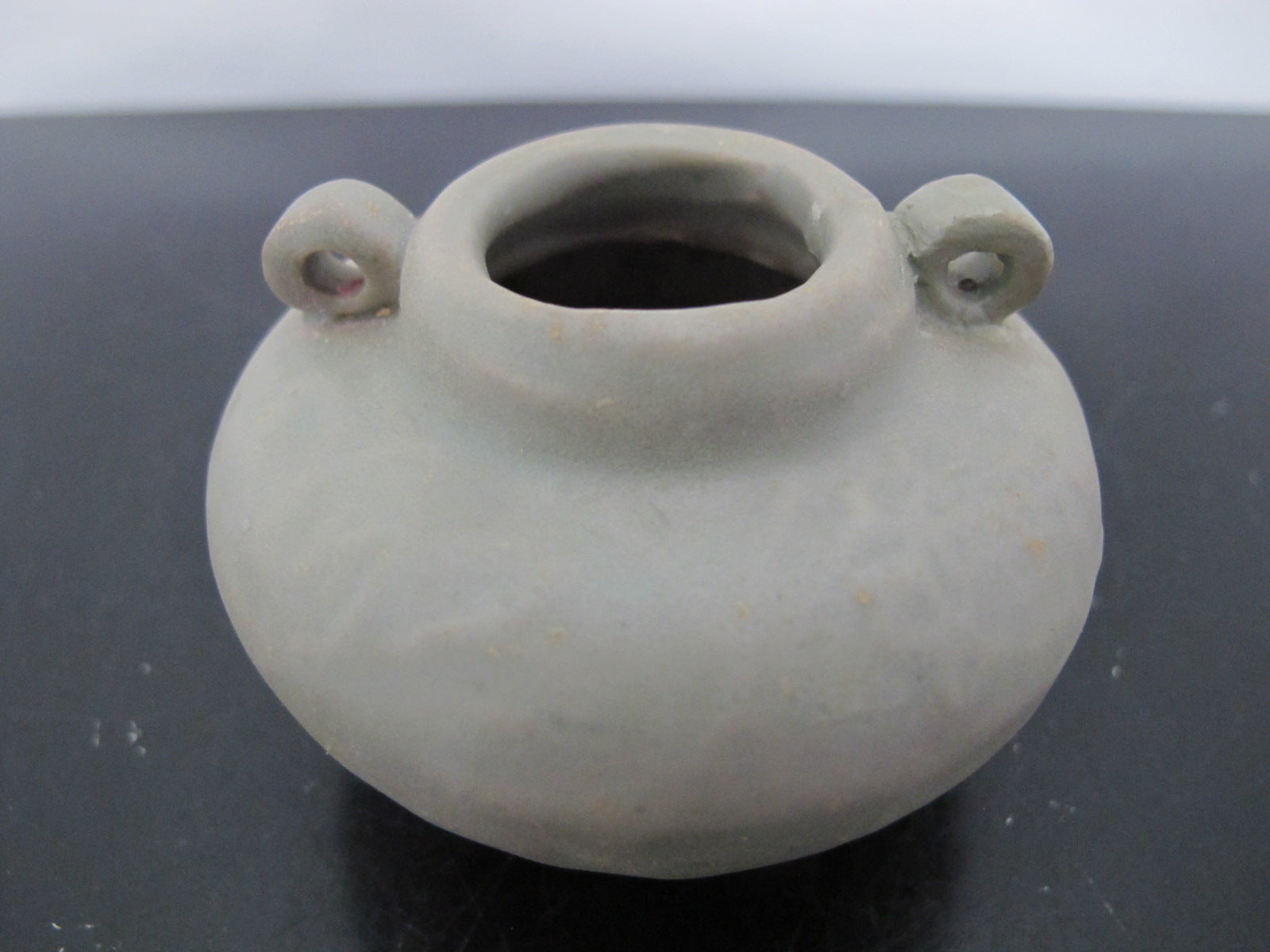 Chinese Longquan celadon glazed jarlet. It features a globular body, two loop handles, and is covered in a characteristic pale sea green hue.