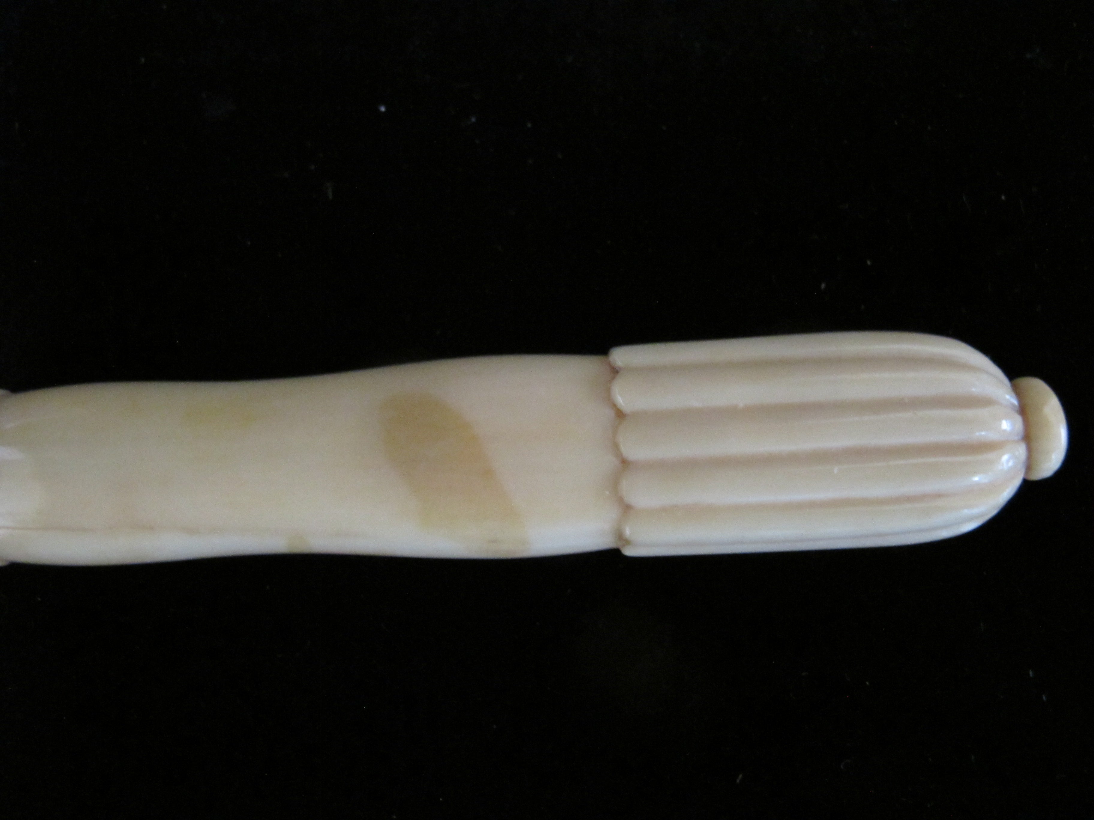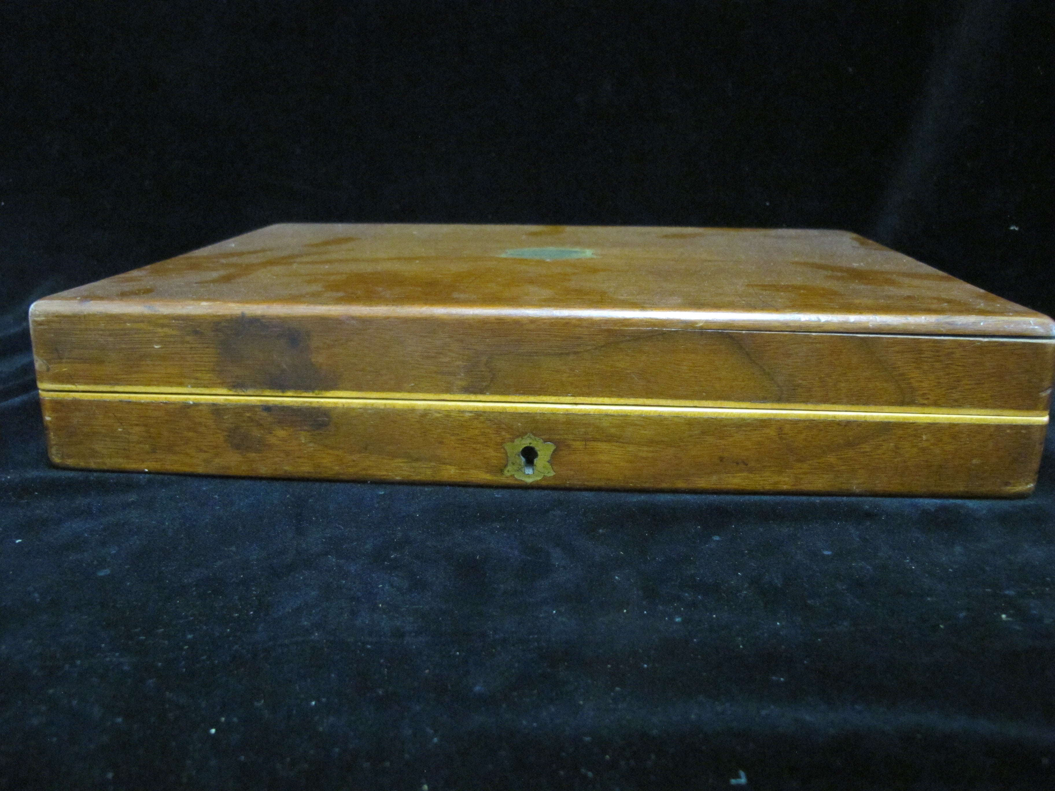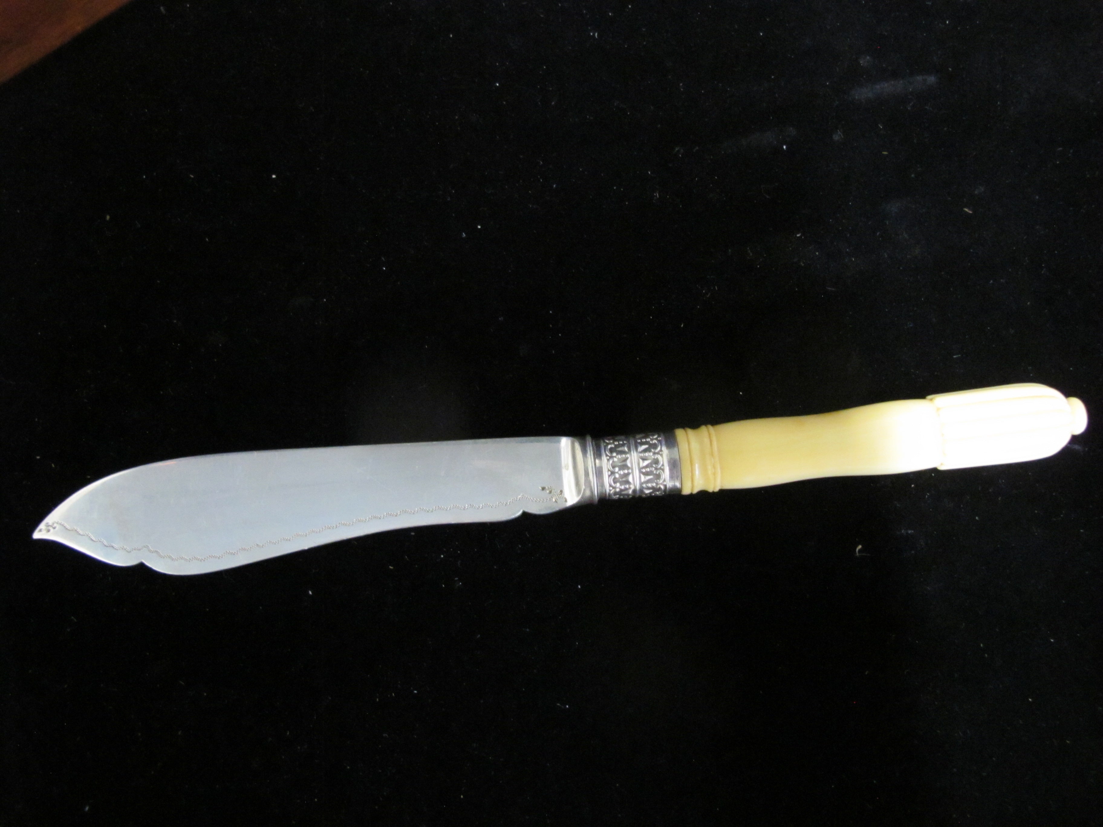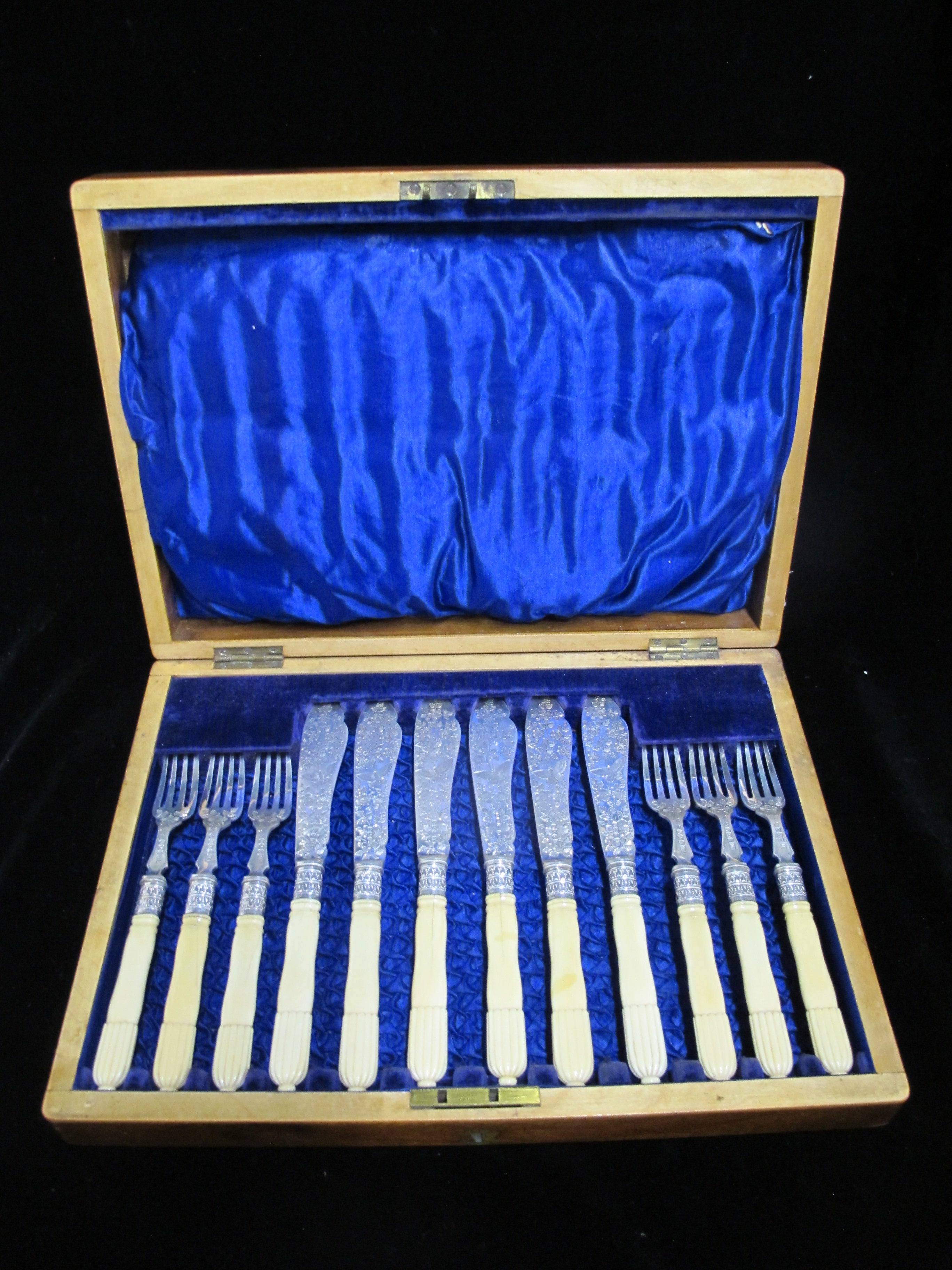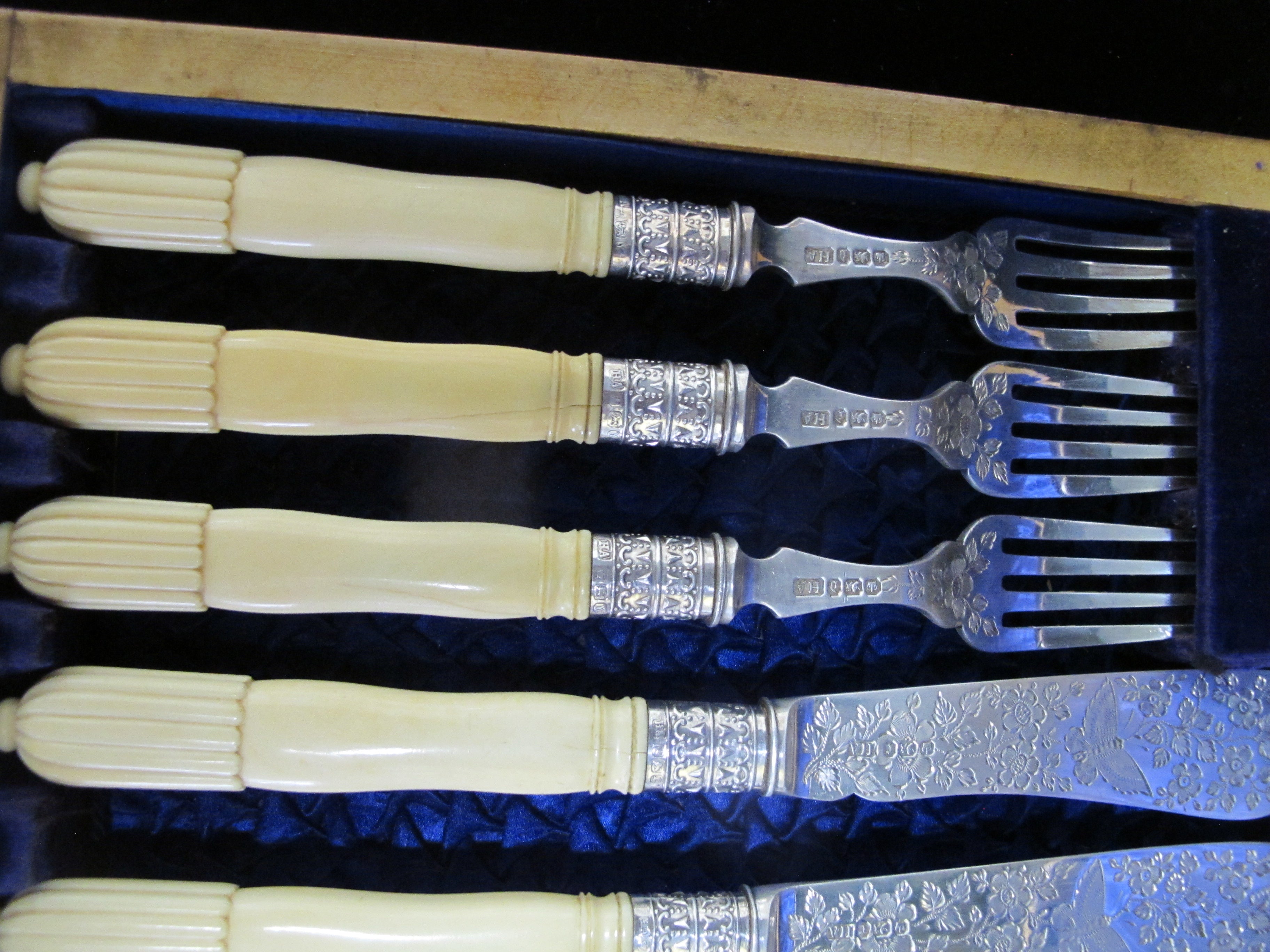 Stunning Sheffield sterling silver fish knife and fork set in original wood case with blue velvet and satin lining. Includes 6 forks and 6 knives, each with intricately hand engraved botanical and butterfly design on sterling with bone handles. All flatware is in excellent condition, box shows signs of wear, but overall, very good condition.