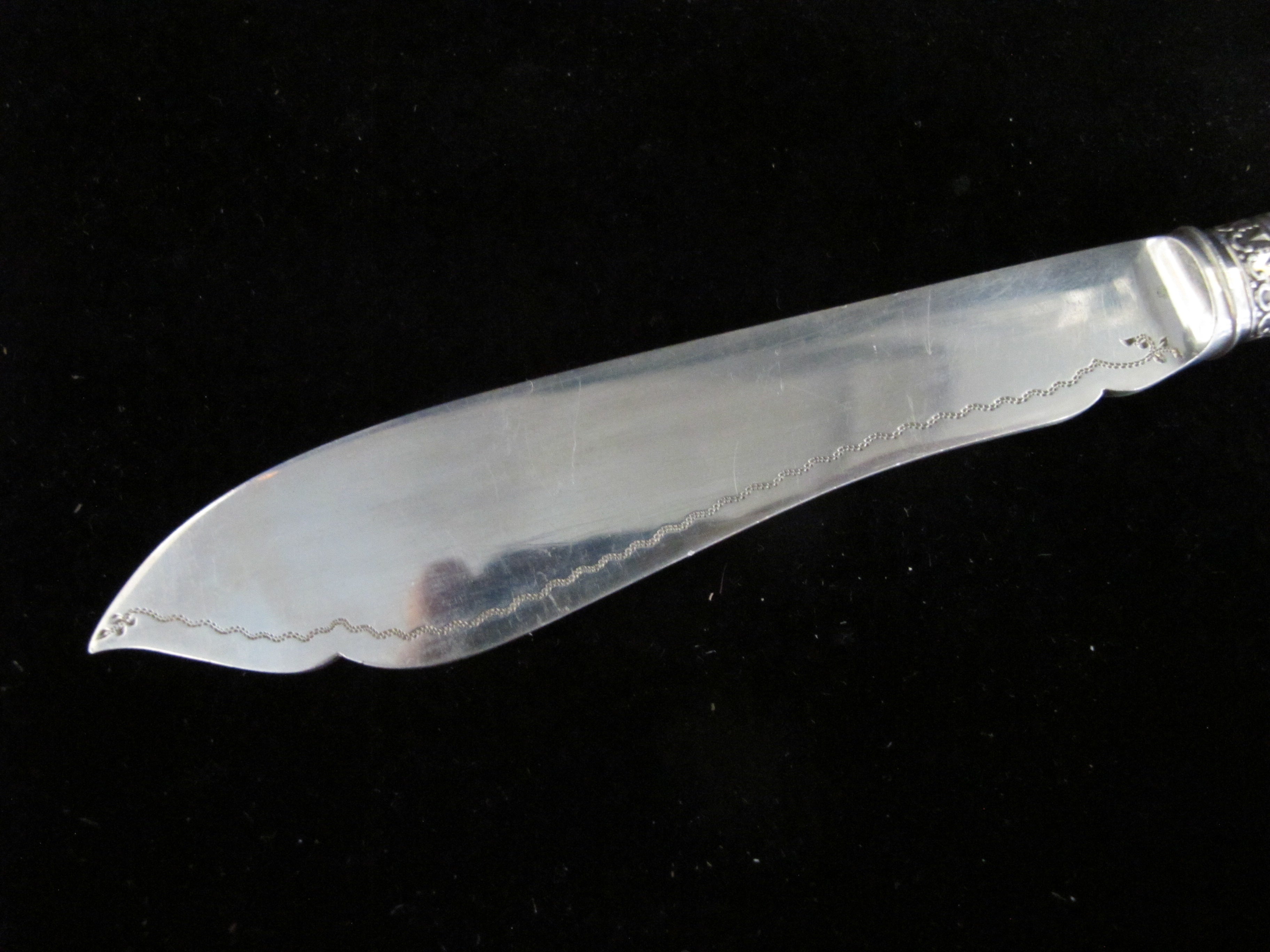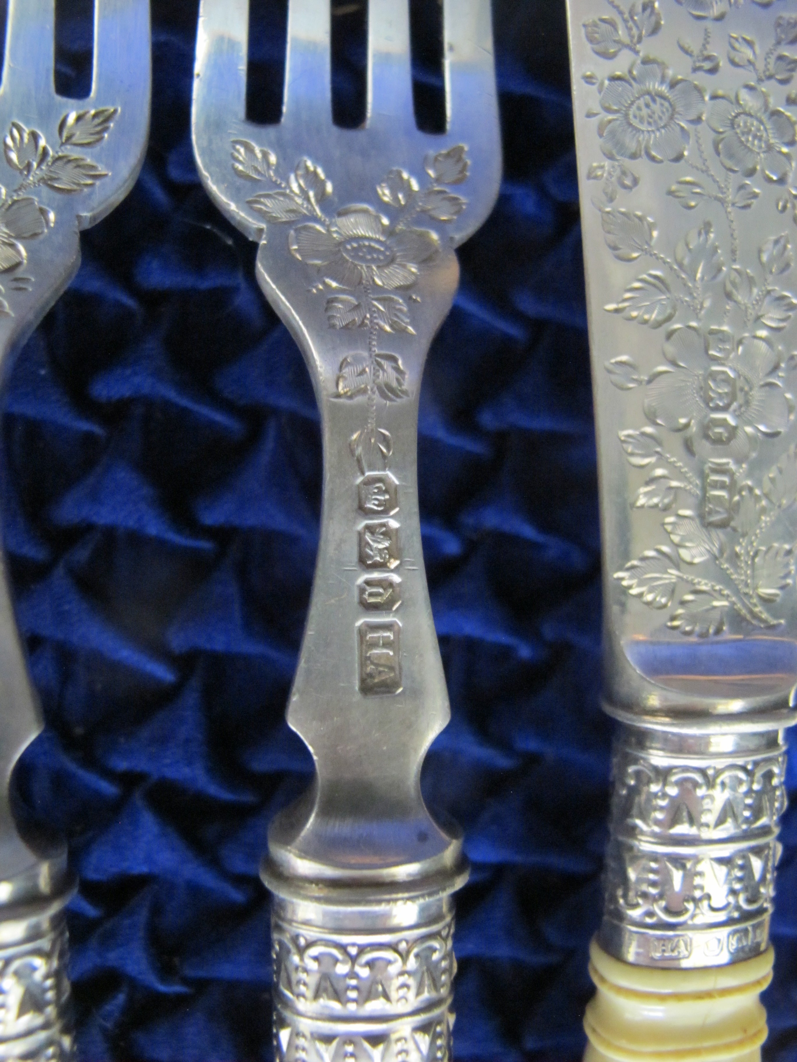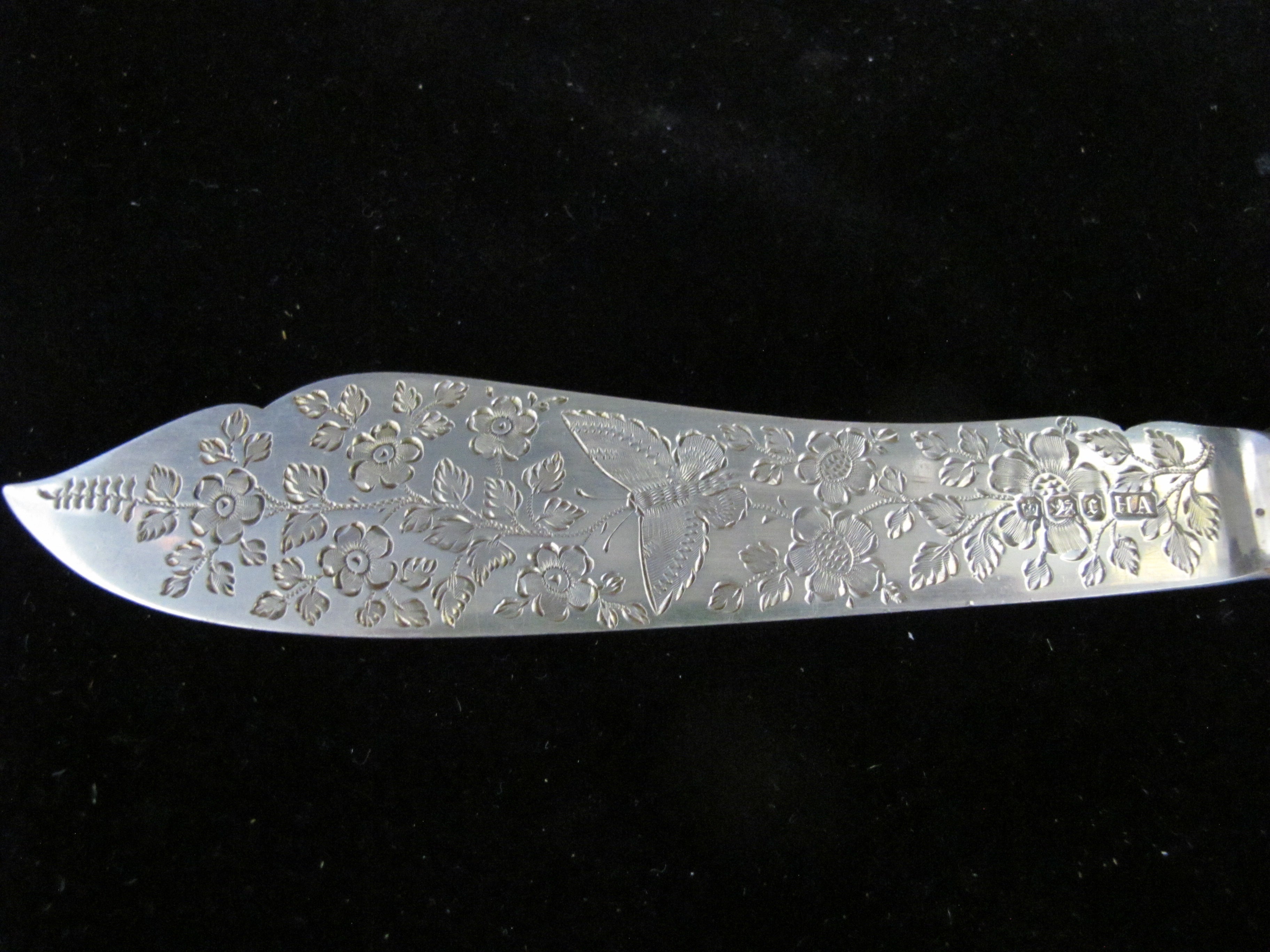 English VICTORIAN Engraved BUTTERFLY Sterling Silver FISH Knife Fork Set in Case