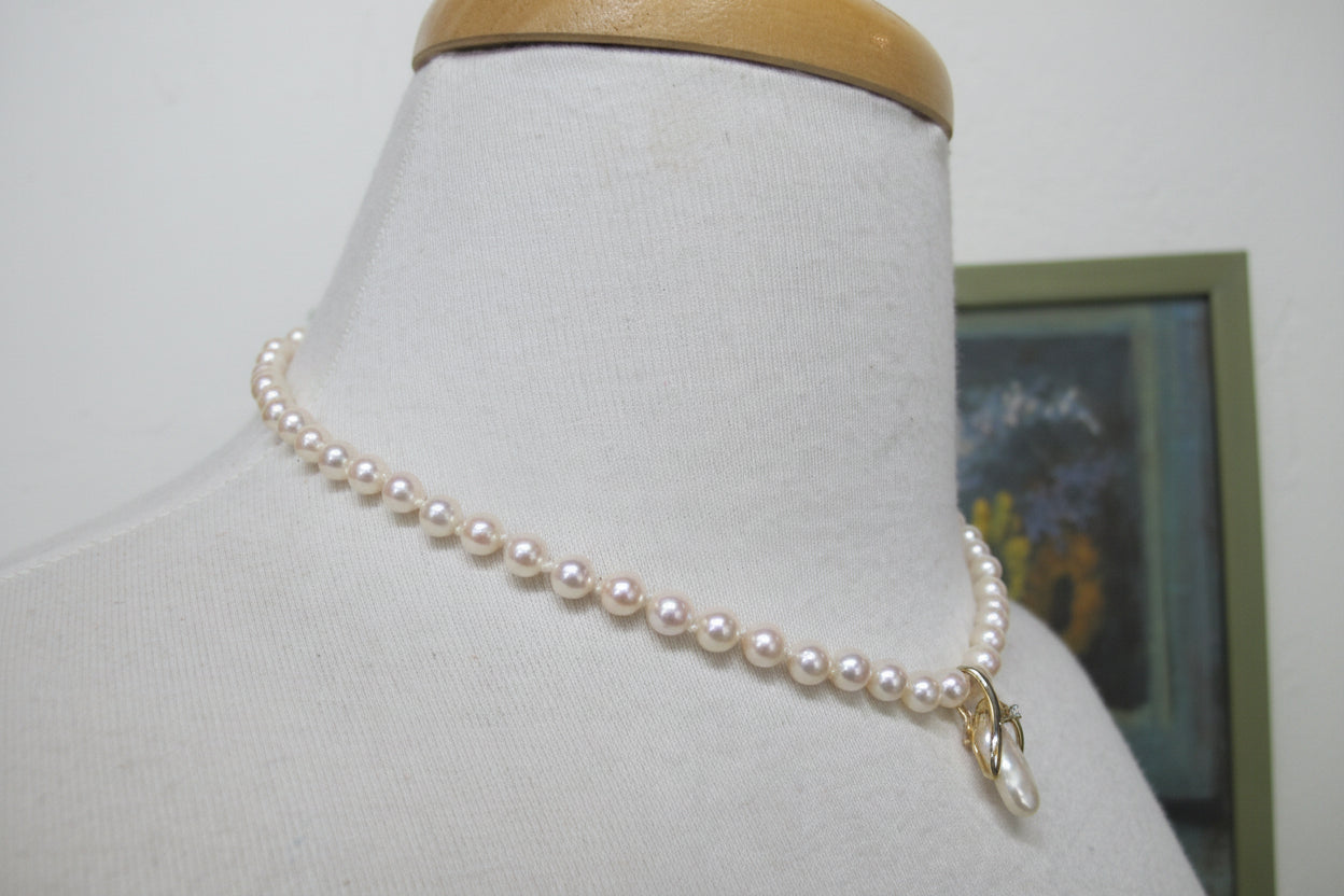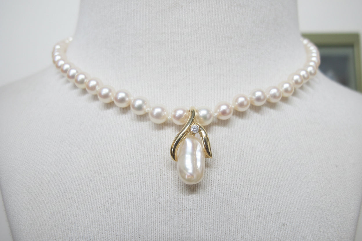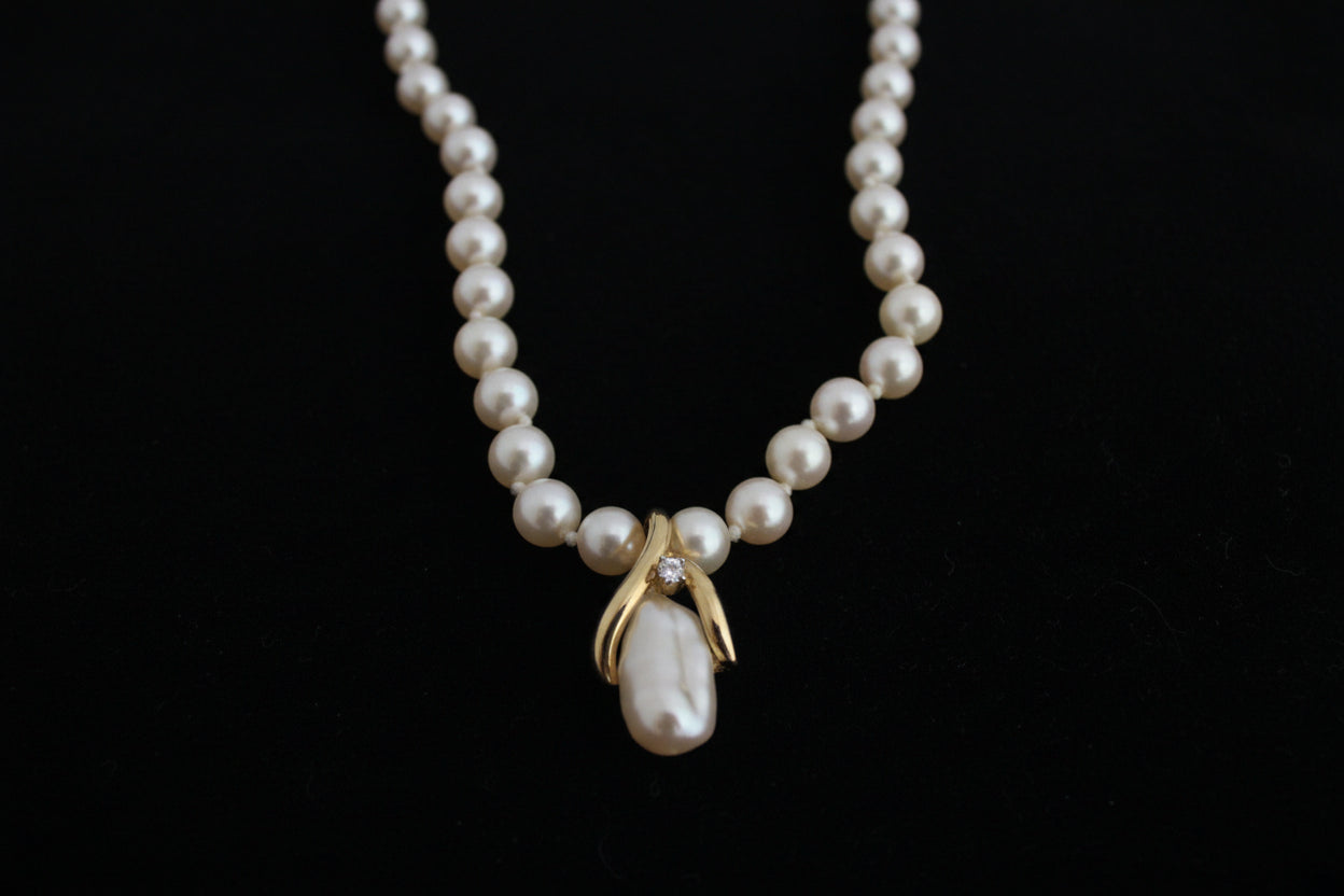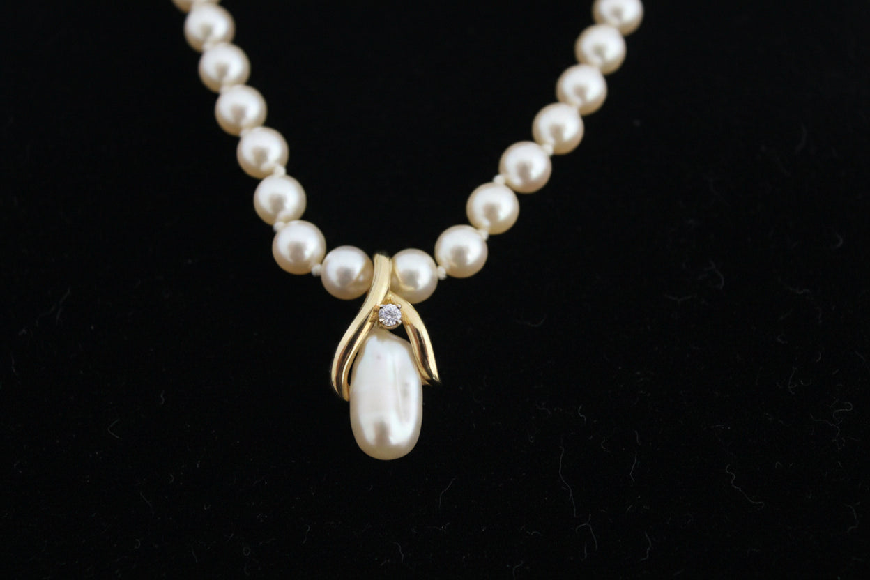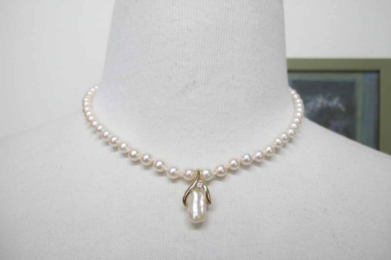 Classic pearl necklace beaded necklace with pendant. Pearl choker or bib style necklace with 14k yellow gold clasp. Detachable gold pendant with freshwater pearl and small diamond accent. Pendant has a berry or fruit-like design with gold leaves.