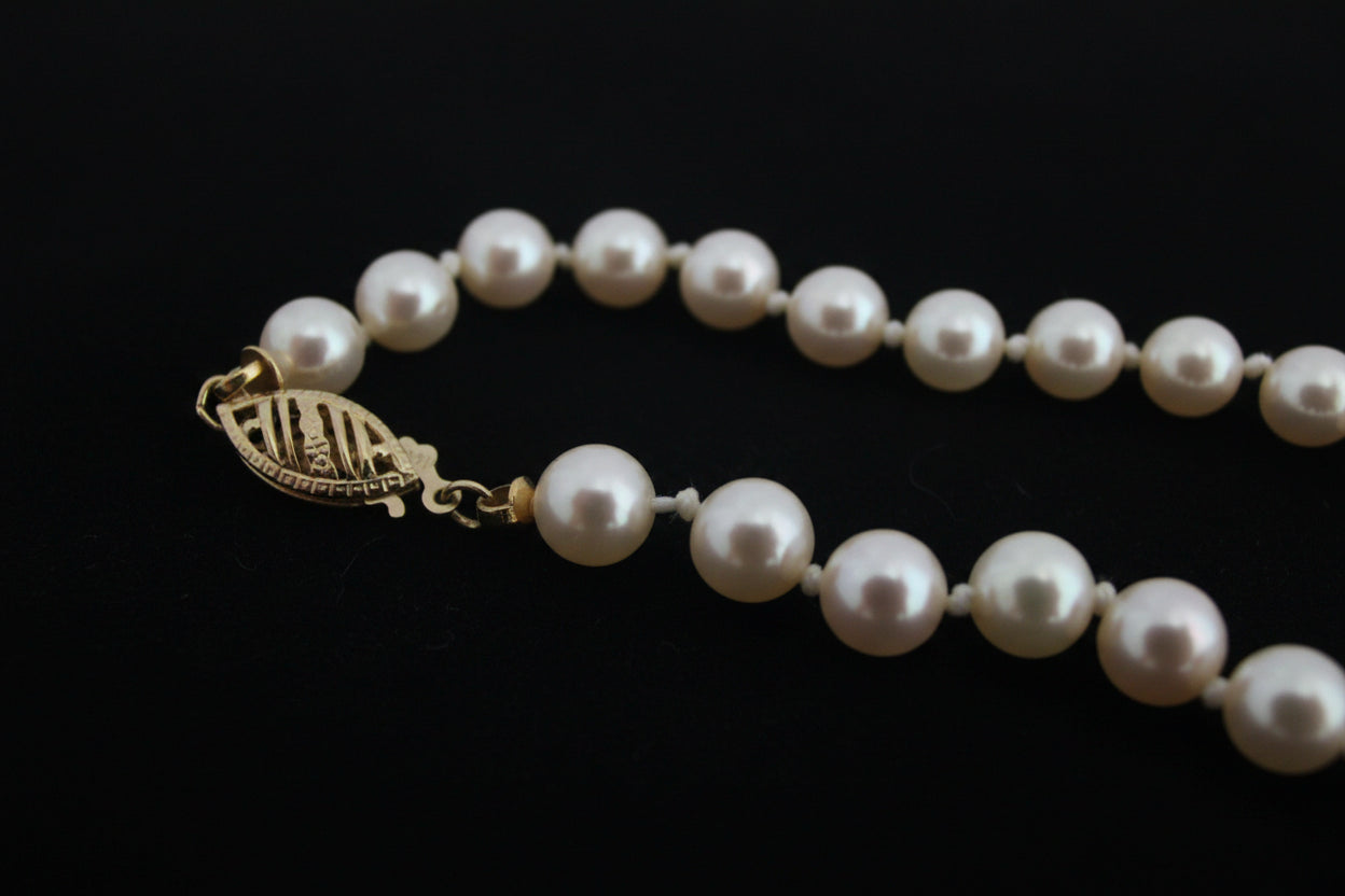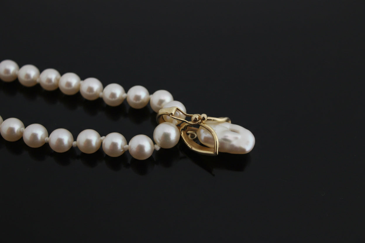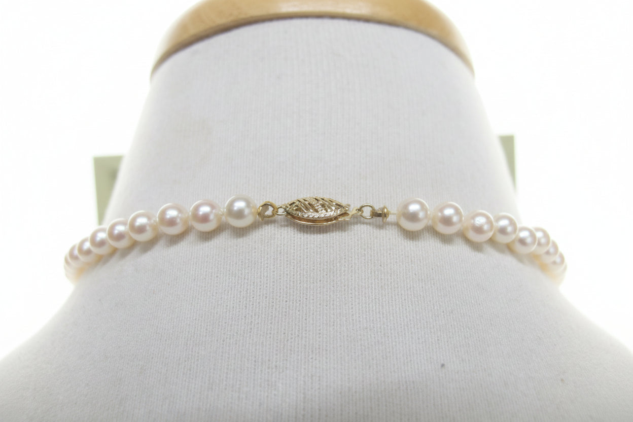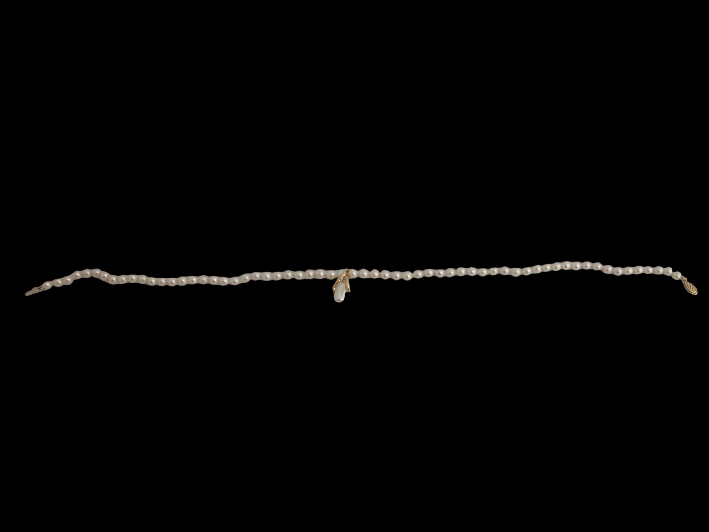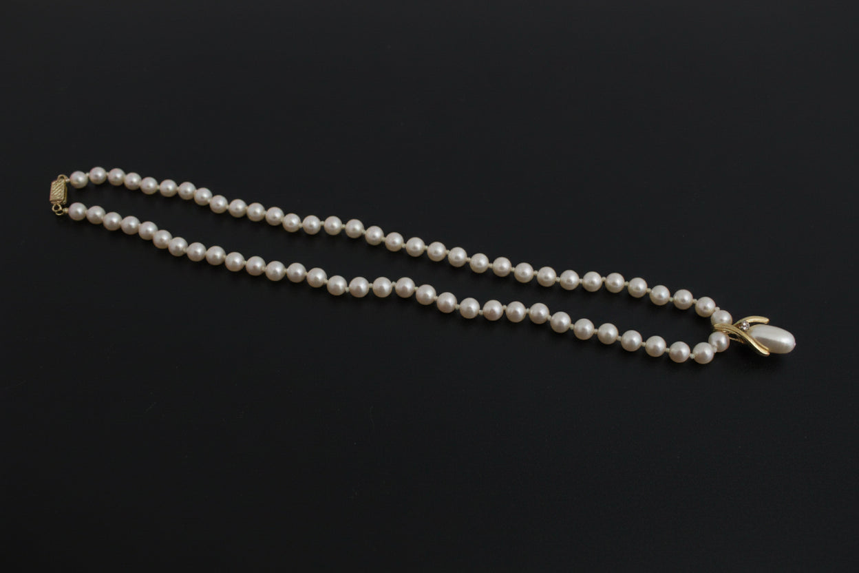 Classic pearl necklace beaded necklace with pendant. Pearl choker or bib style necklace with 14k yellow gold clasp. Detachable gold pendant with freshwater pearl and small diamond accent. Pendant has a berry or fruit-like design with gold leaves.
