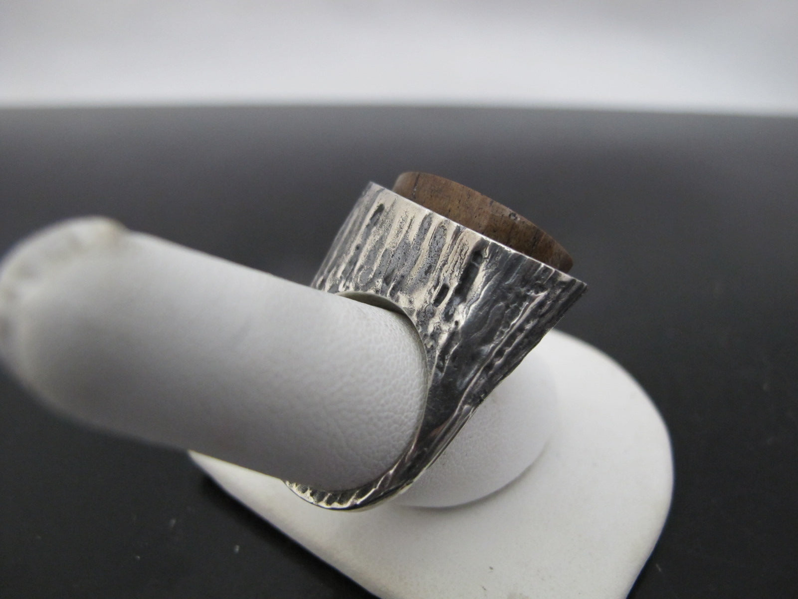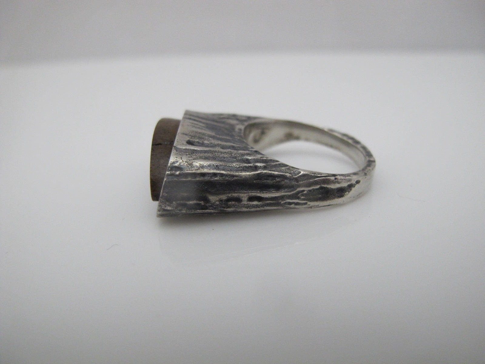 Stunning hand crafted Native American statement ring with hand wrought bark like texture and kidney shaped Bronzite gemstone.