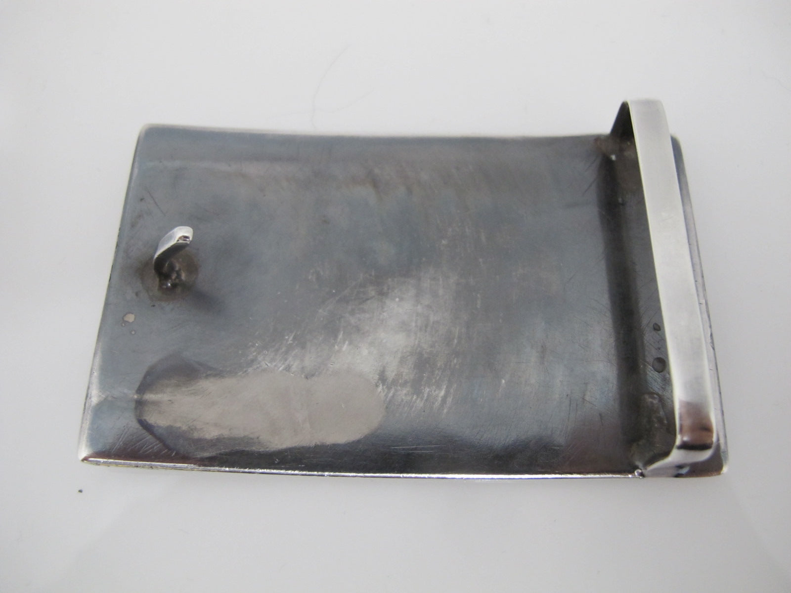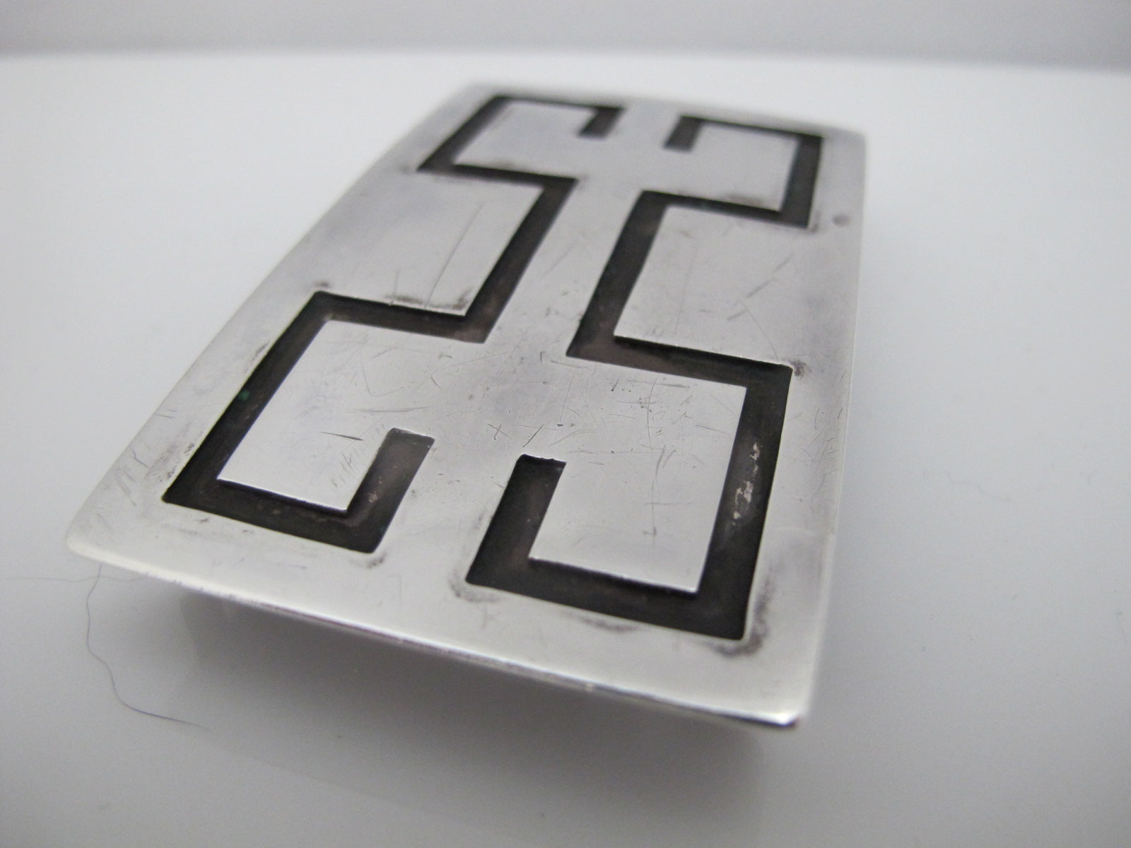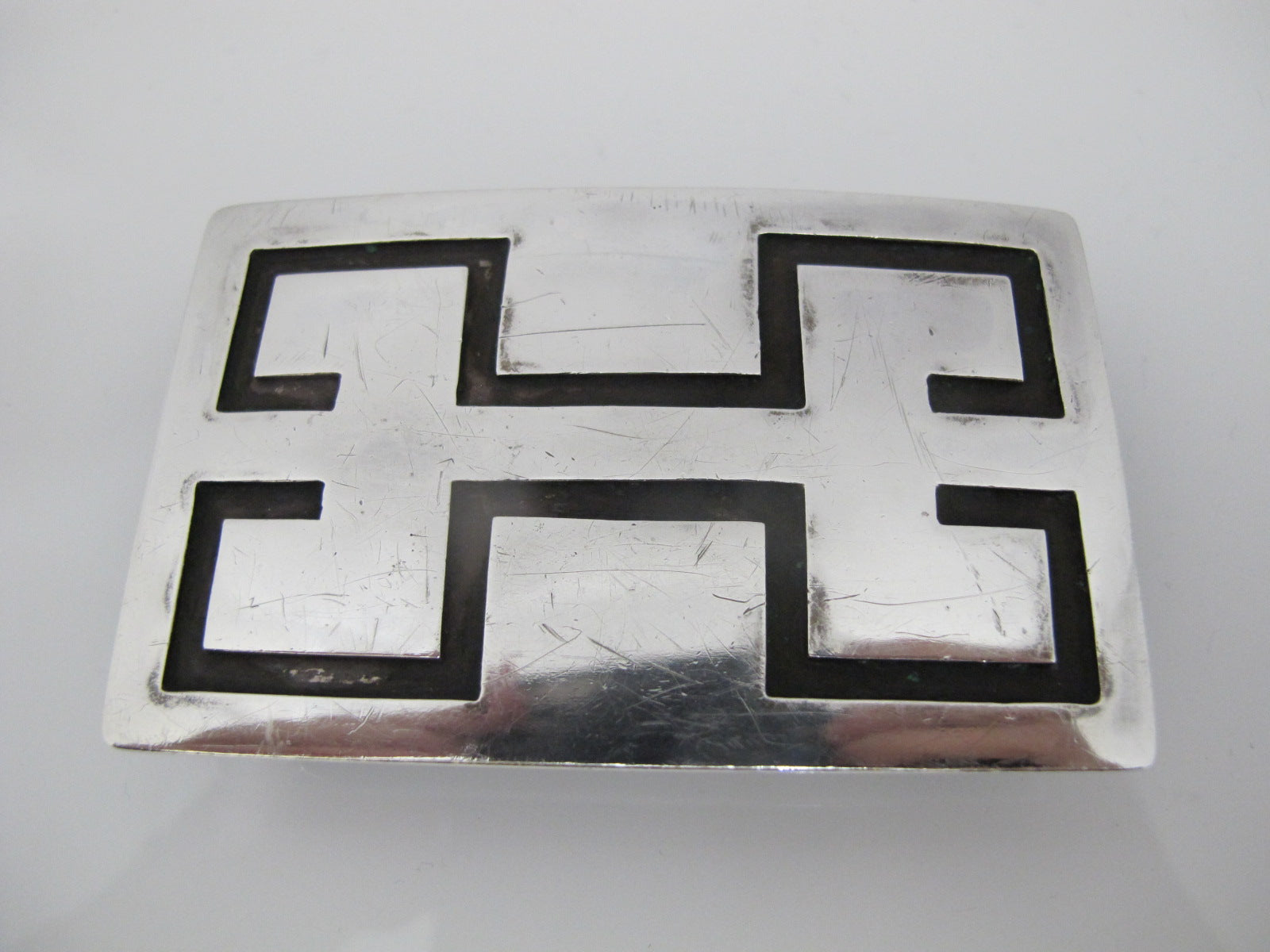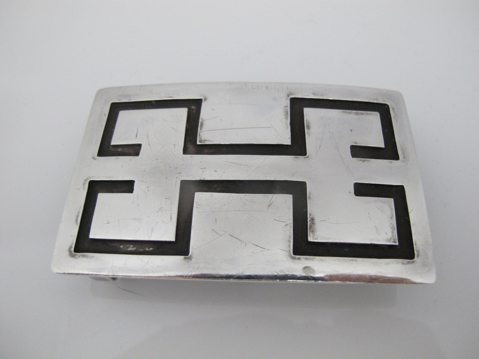 Hopi Native American hand made belt buckle. Rectangular silver buckle with overlay design.