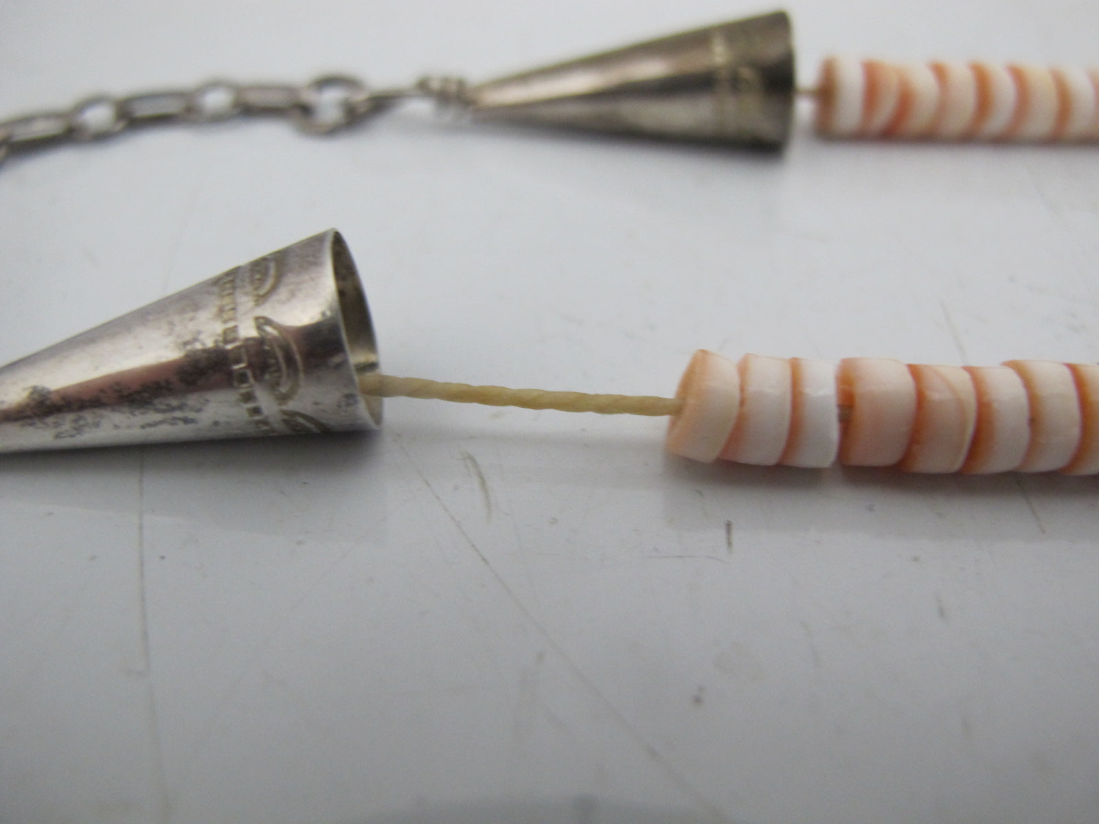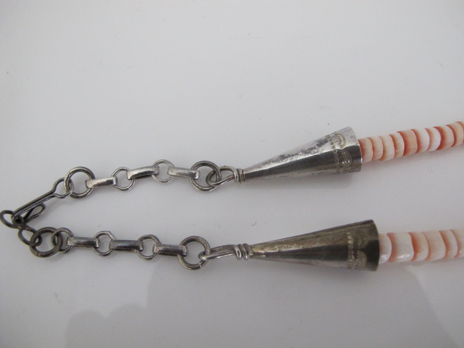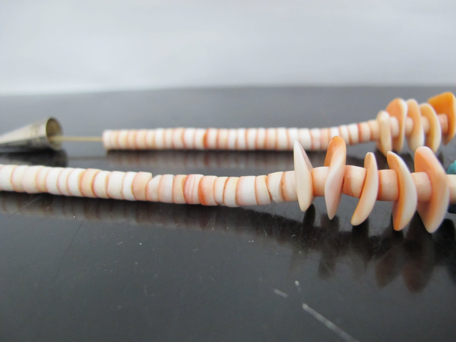 Santo Domingo Pueblo Native American coral and turquoise beaded necklace. Pink and white coral chip beads interspersed with hints of turquoise on rope with engraved sterling silver tips.