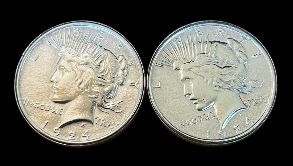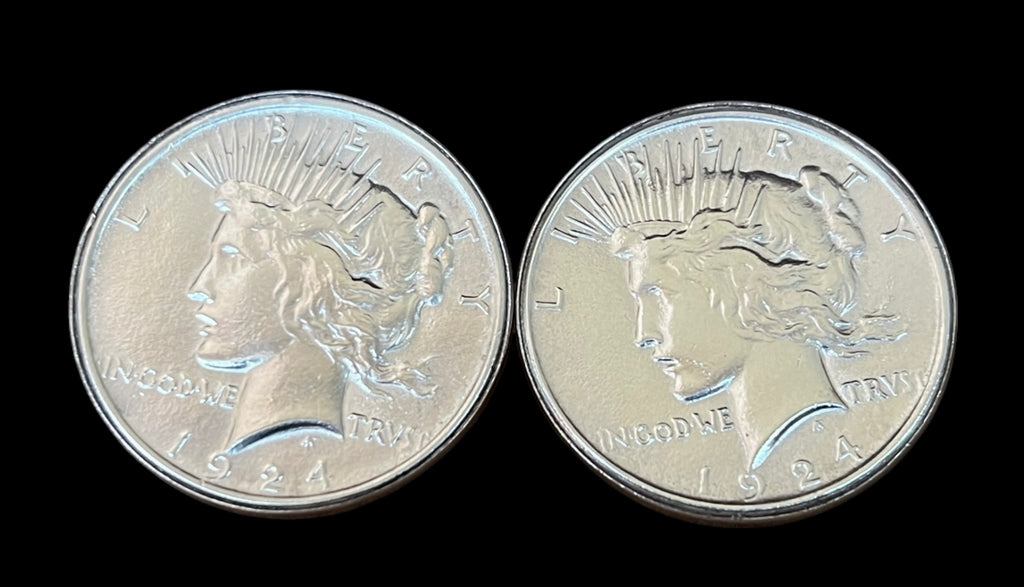 They show some wear specifically around the word "TRUST." One of the coins has some slight markings on the chin. Overall nice looking coins. Please zoom in on each photo.