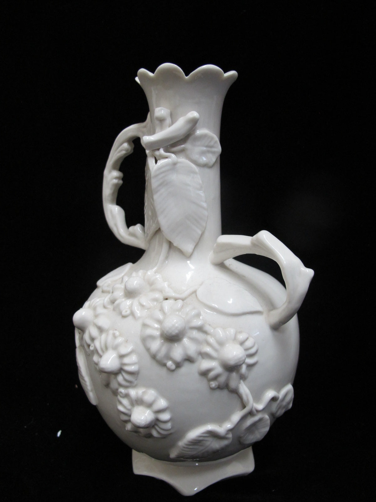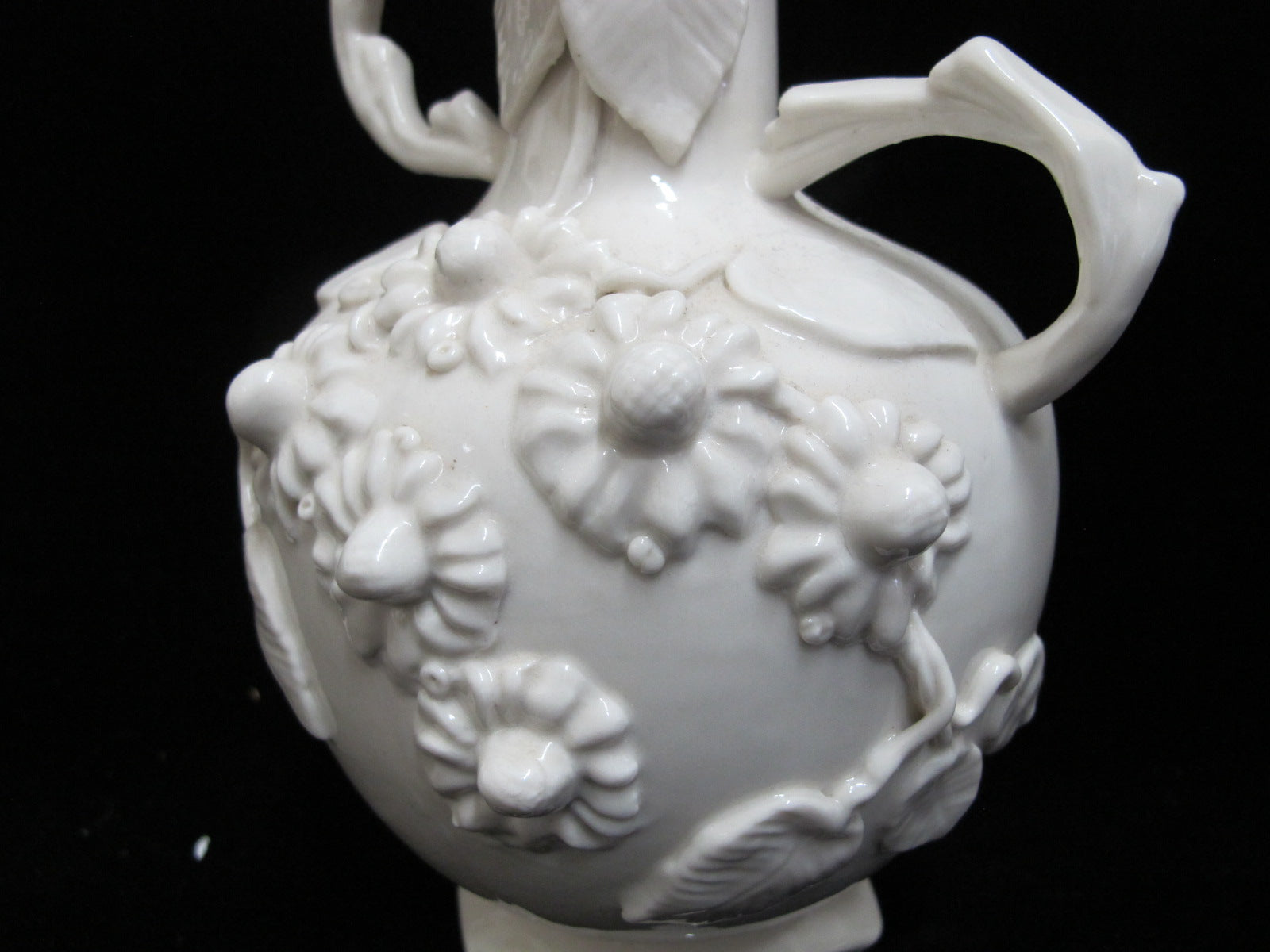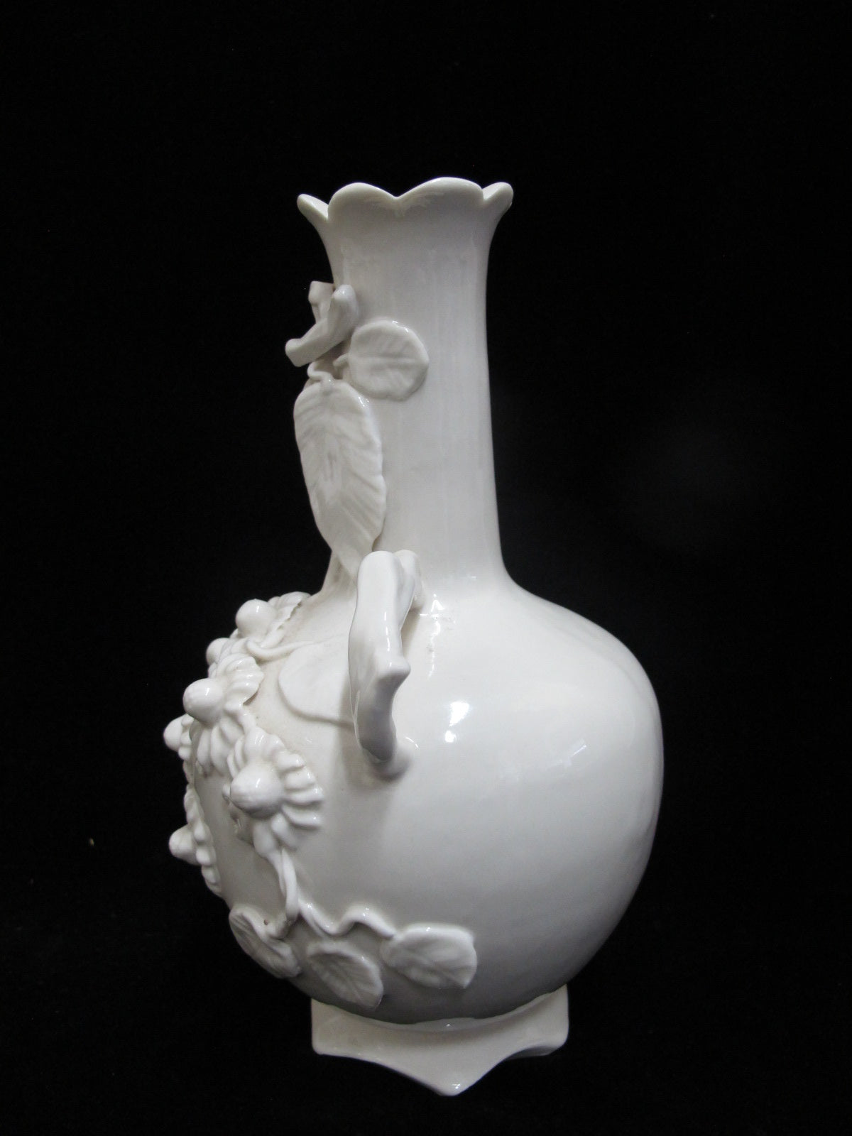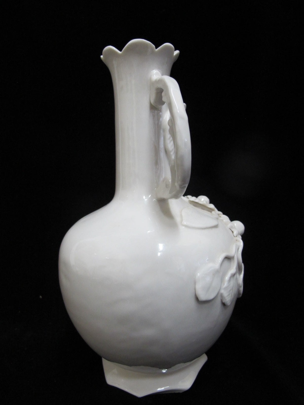 Vintage white porcelain vase, Blanc de Chine in style. Glossy glaze with applied high relief floral and leaf motifs. Bulbous body with slim neck and scalloped mouth. Handle at each side.