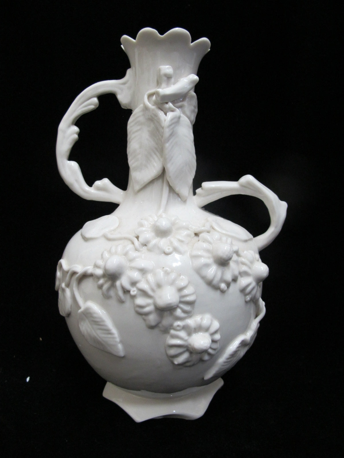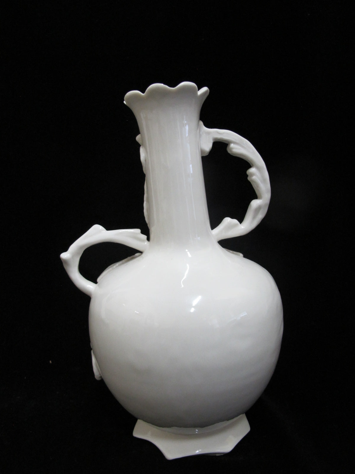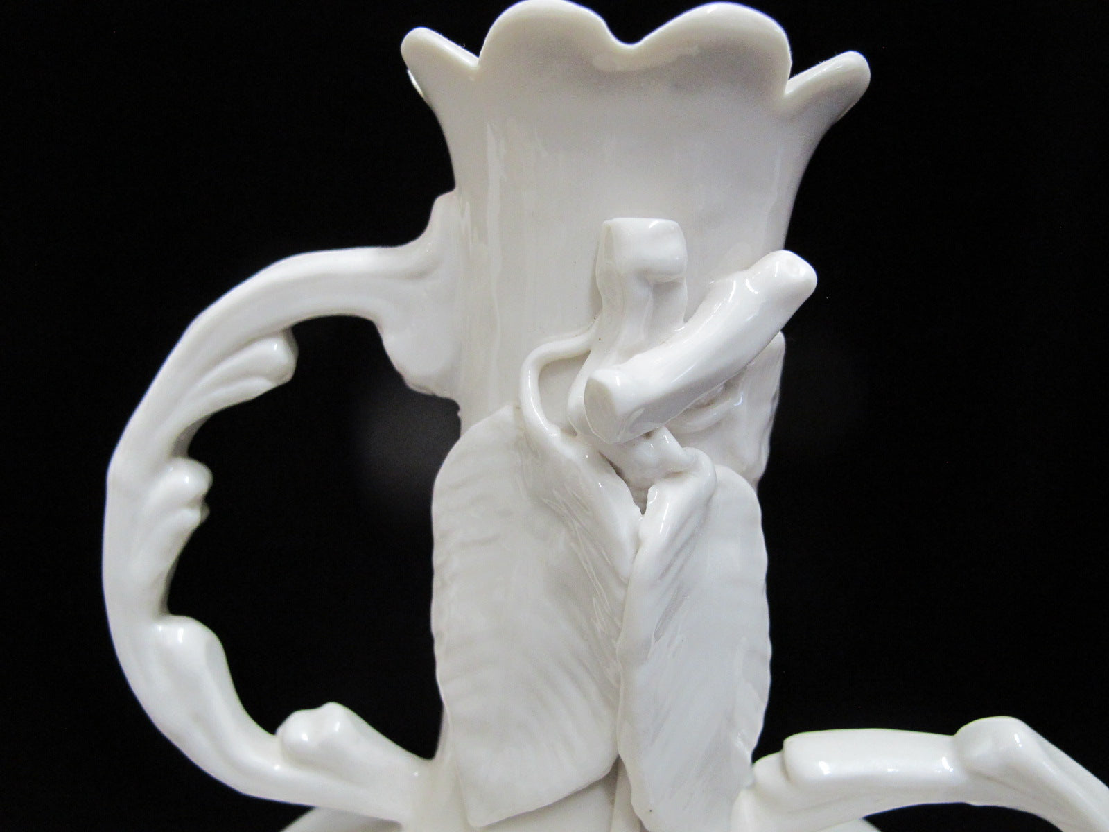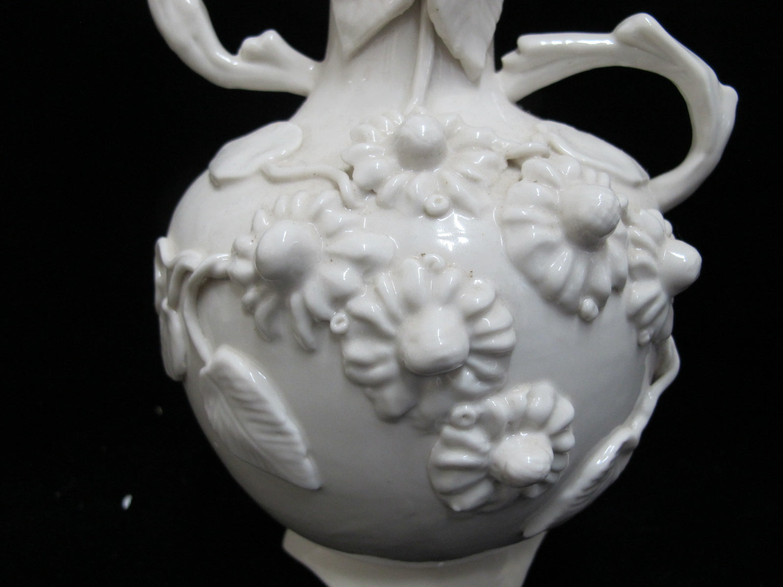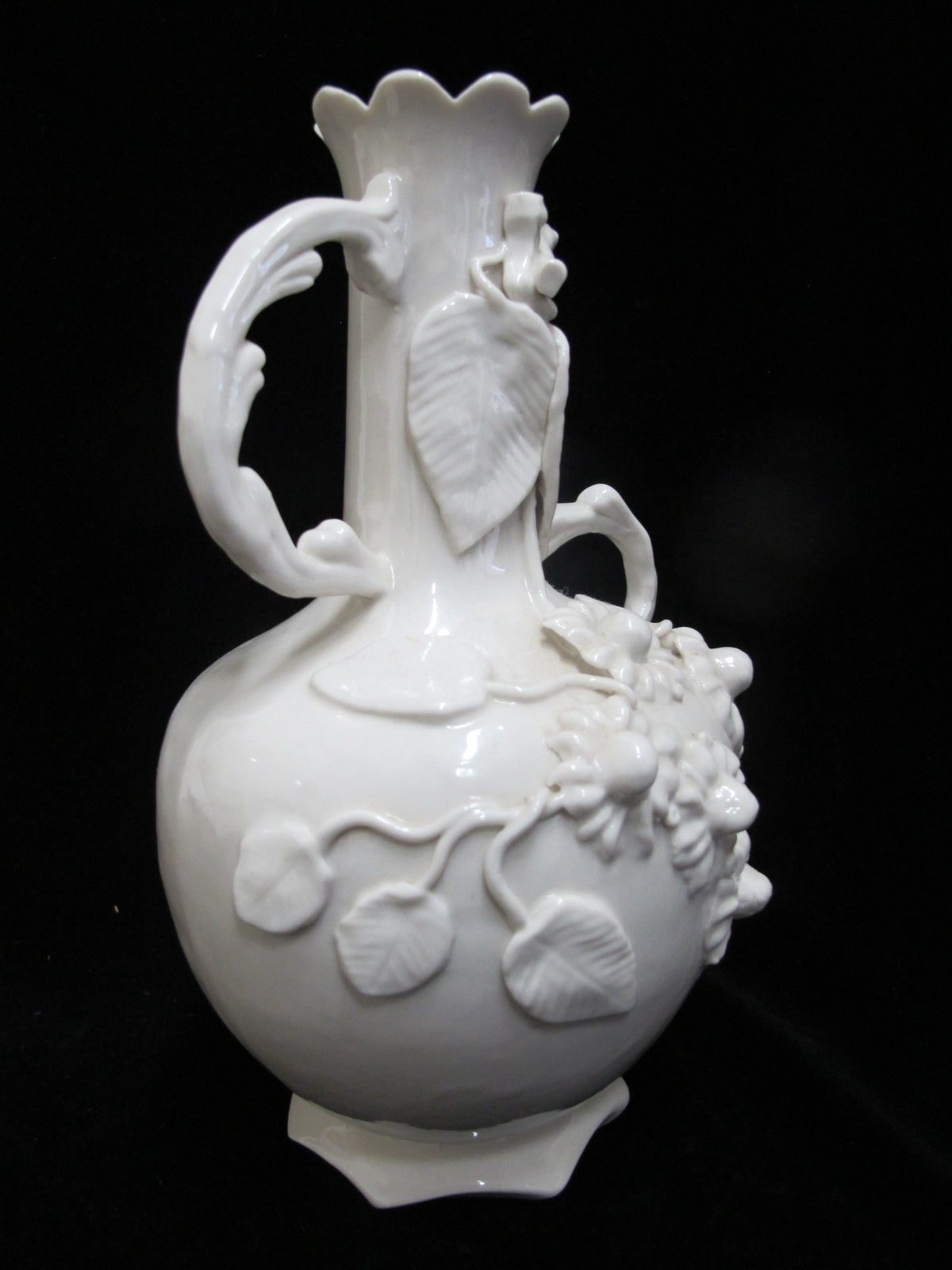 Vintage white porcelain vase, Blanc de Chine in style. Glossy glaze with applied high relief floral and leaf motifs. Bulbous body with slim neck and scalloped mouth. Handle at each side.