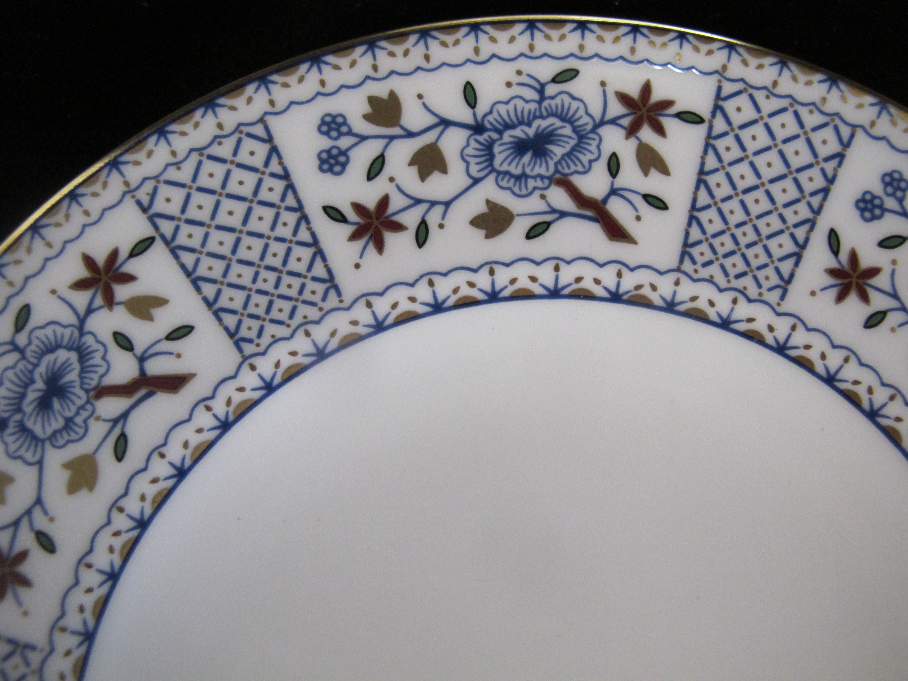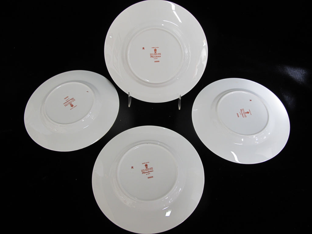Royal Crown Derby English Bone China, A1277 bread and butter plate set of 4 in lovely Mandarin Blue pattern. White bone China with beautifully detailed floral design in blue with gold trim. Excellent condition, no chips, cracks or repairs. Hallmarks at base may vary.