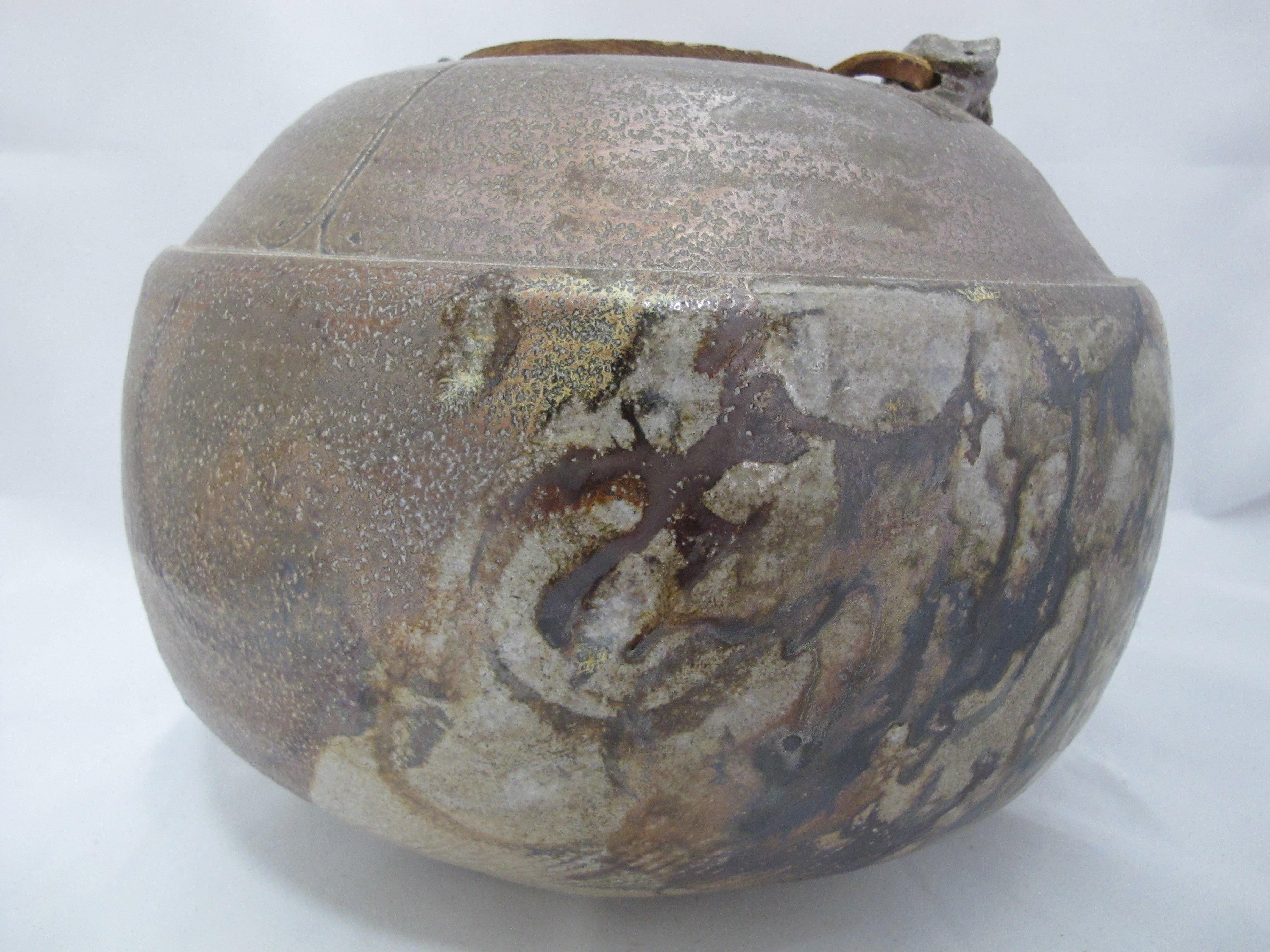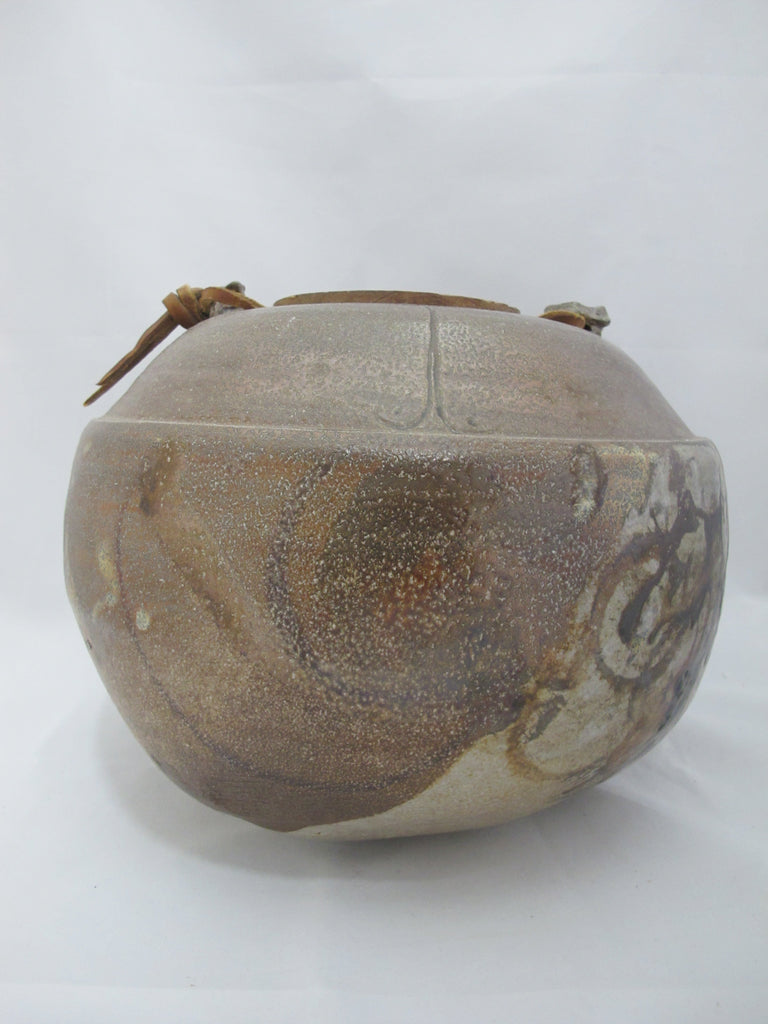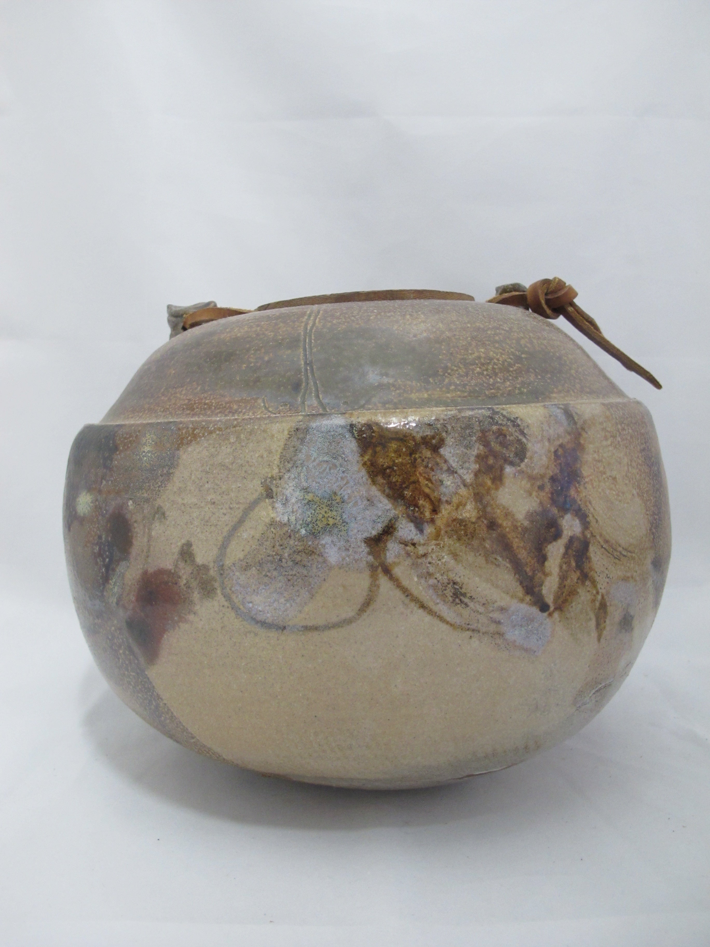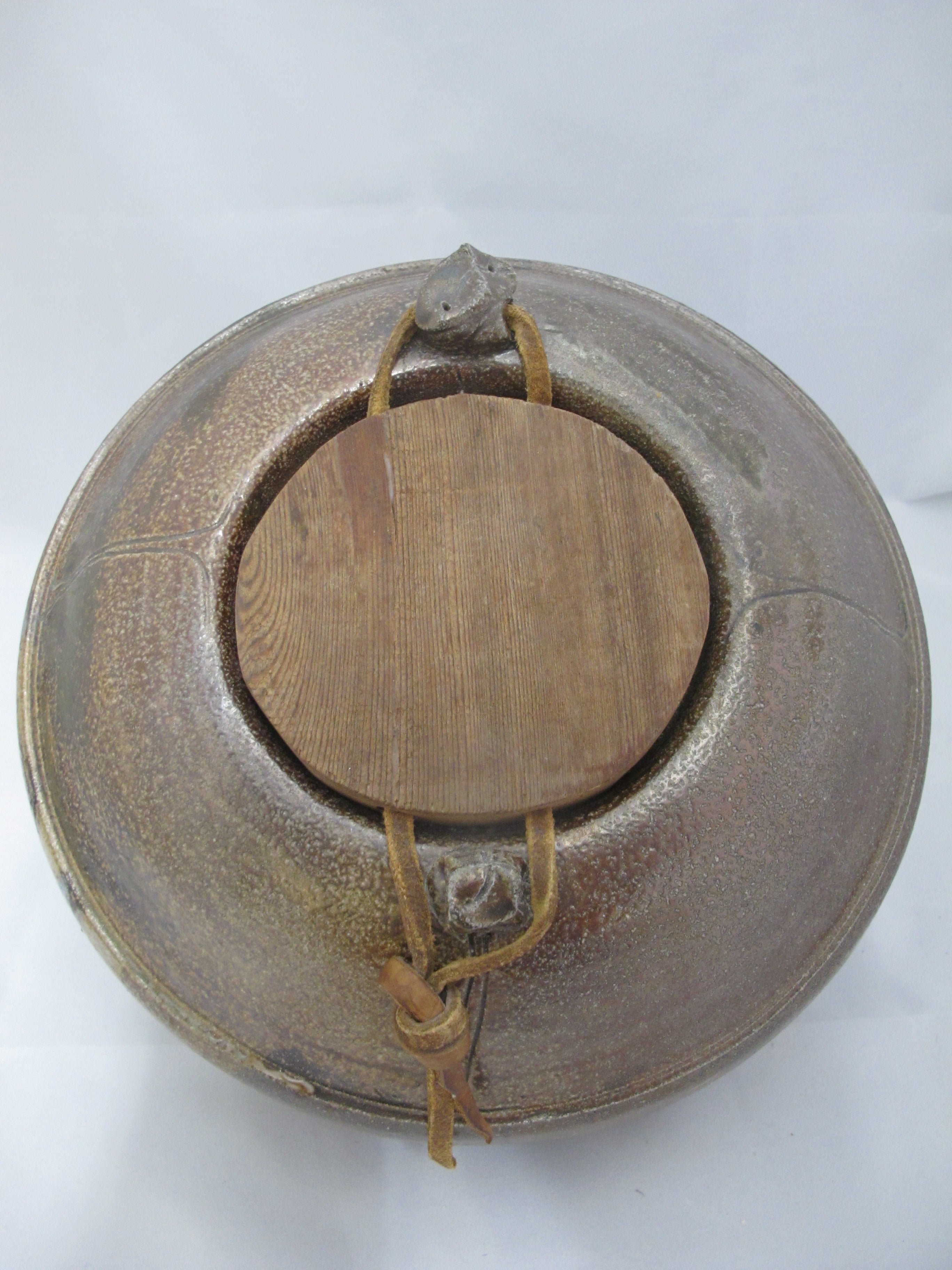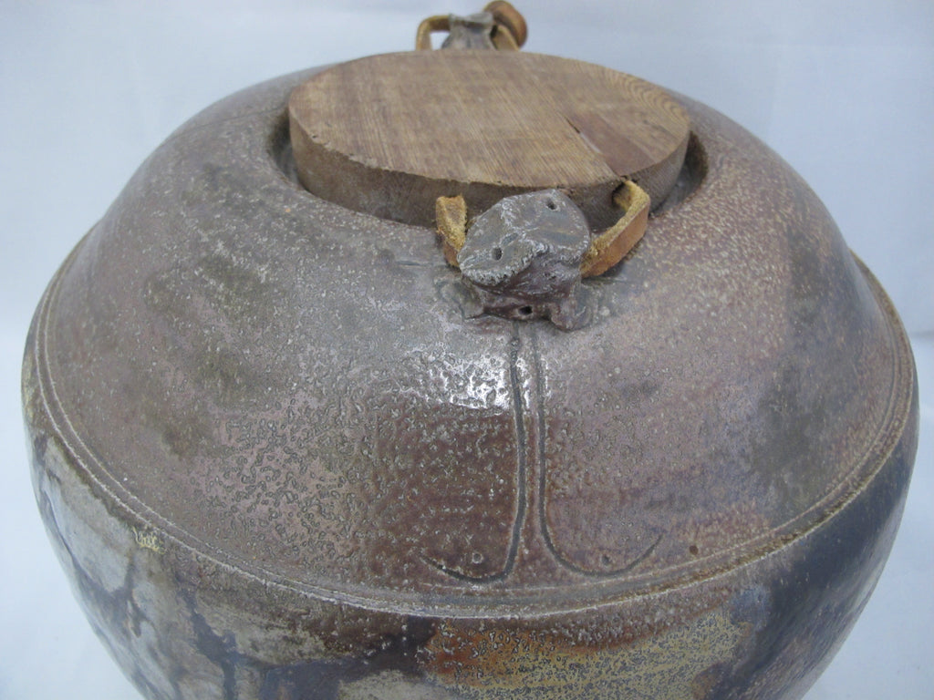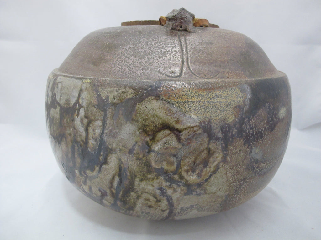 A stunning abstract, salt-fired lidded vessel by renowned potter Sandra Johnstone from the 1970s. Large bulbous shape with indentation on one side so it can sit uniquely at an angle, as photographed. It features a distinctive, solid wooden top with a leather cord for securing it to the vessel.
