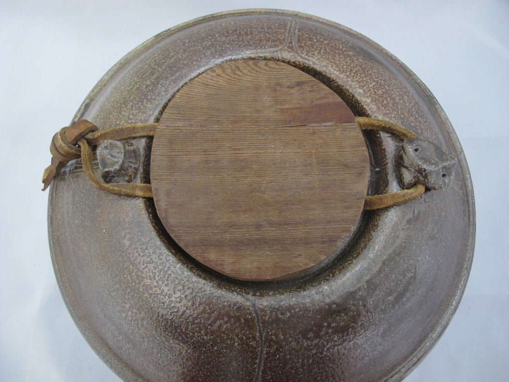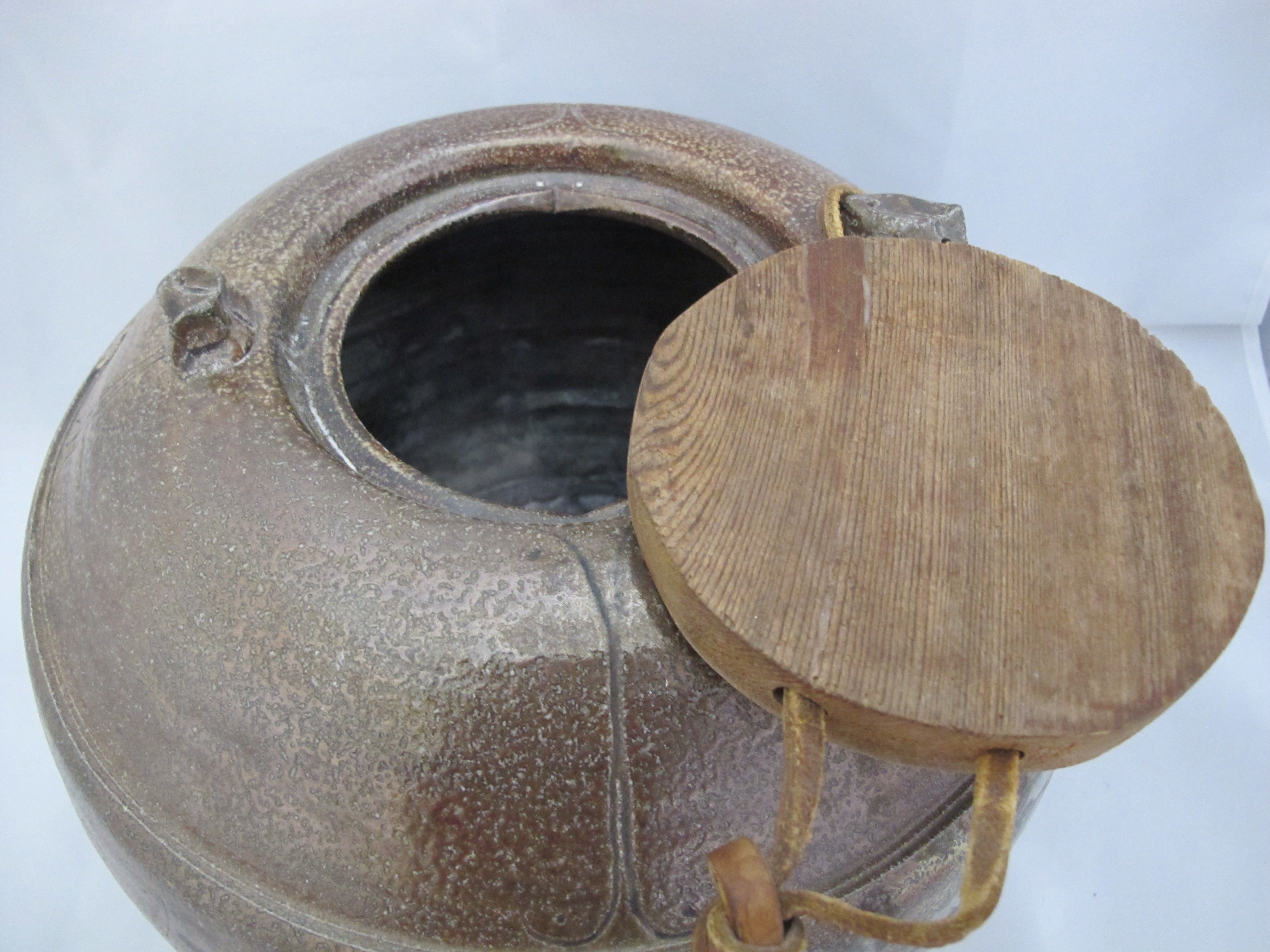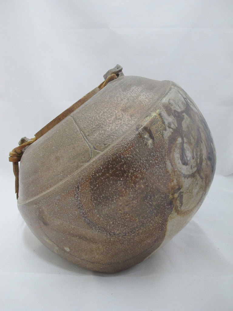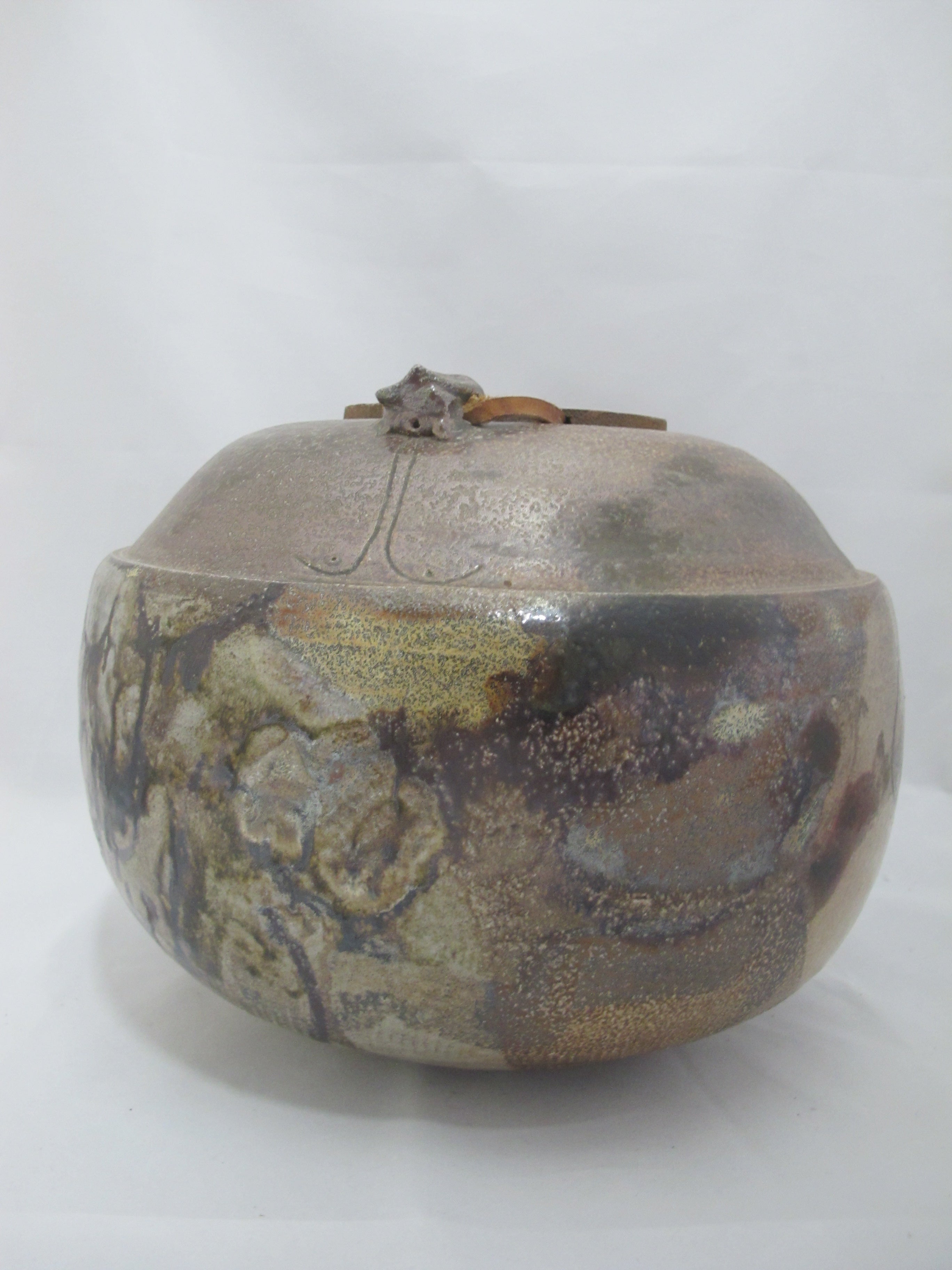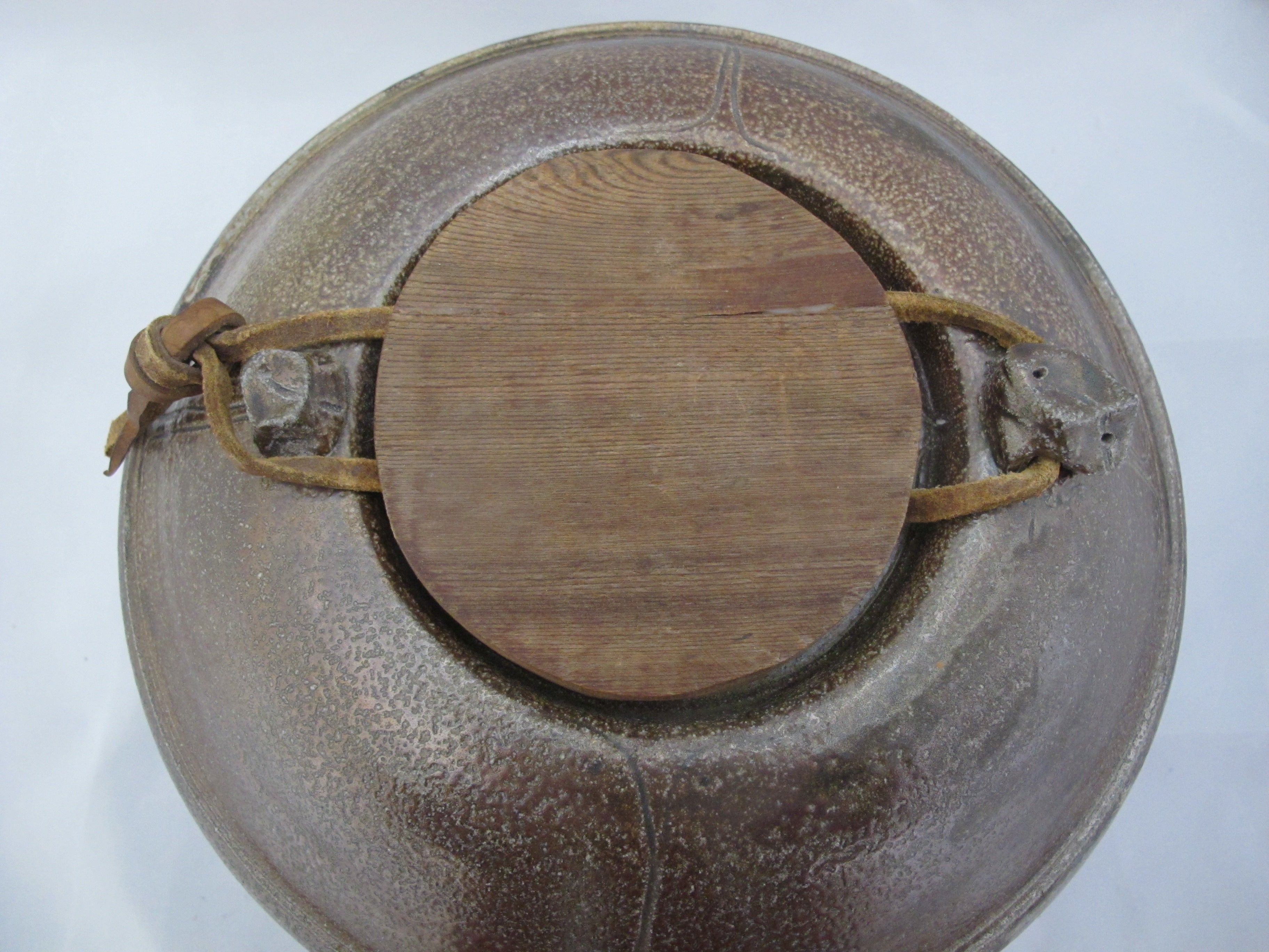 A stunning abstract, salt-fired lidded vessel by renowned potter Sandra Johnstone from the 1970s. Large bulbous shape with indentation on one side so it can sit uniquely at an angle, as photographed. It features a distinctive, solid wooden top with a leather cord for securing it to the vessel.