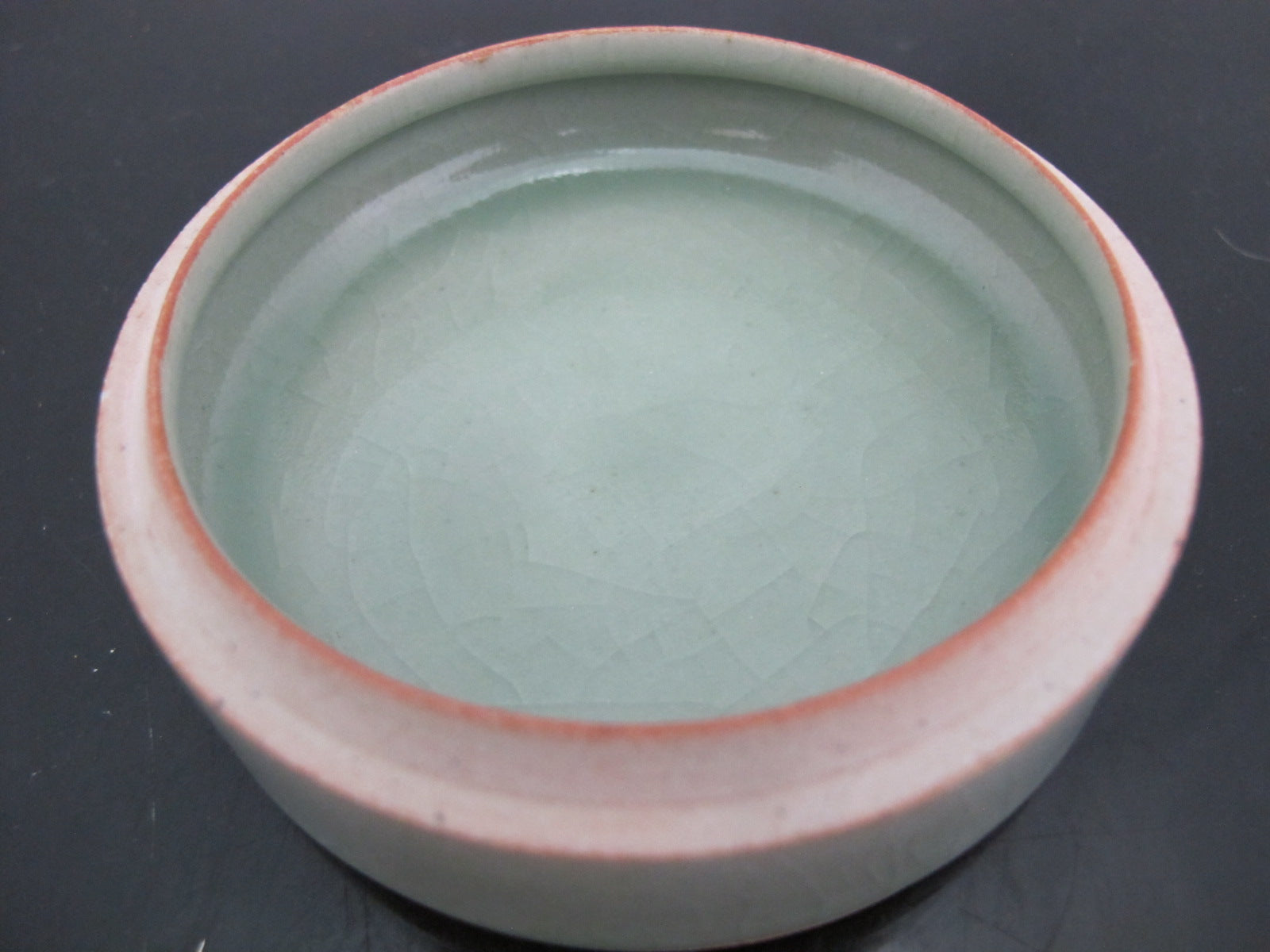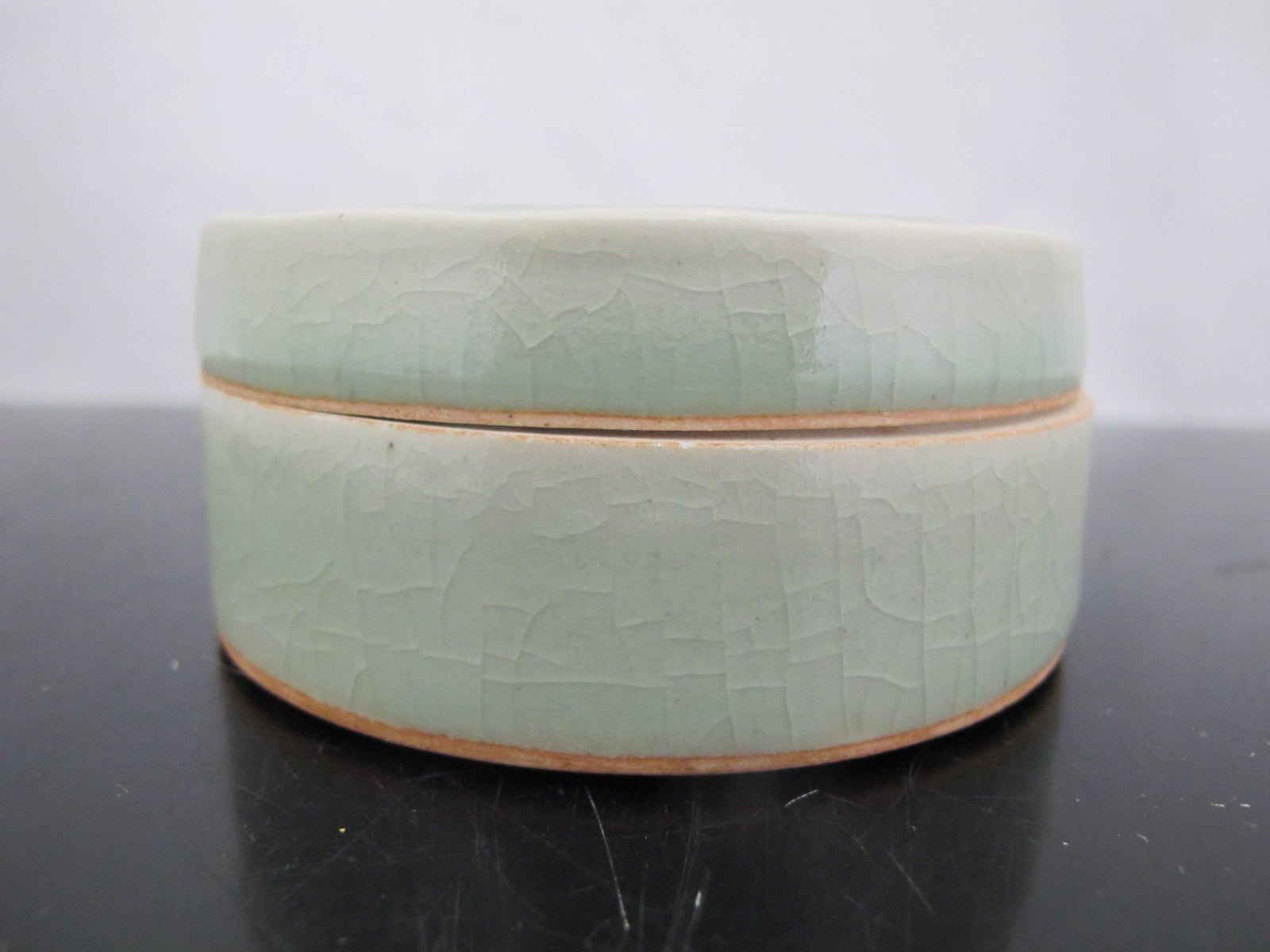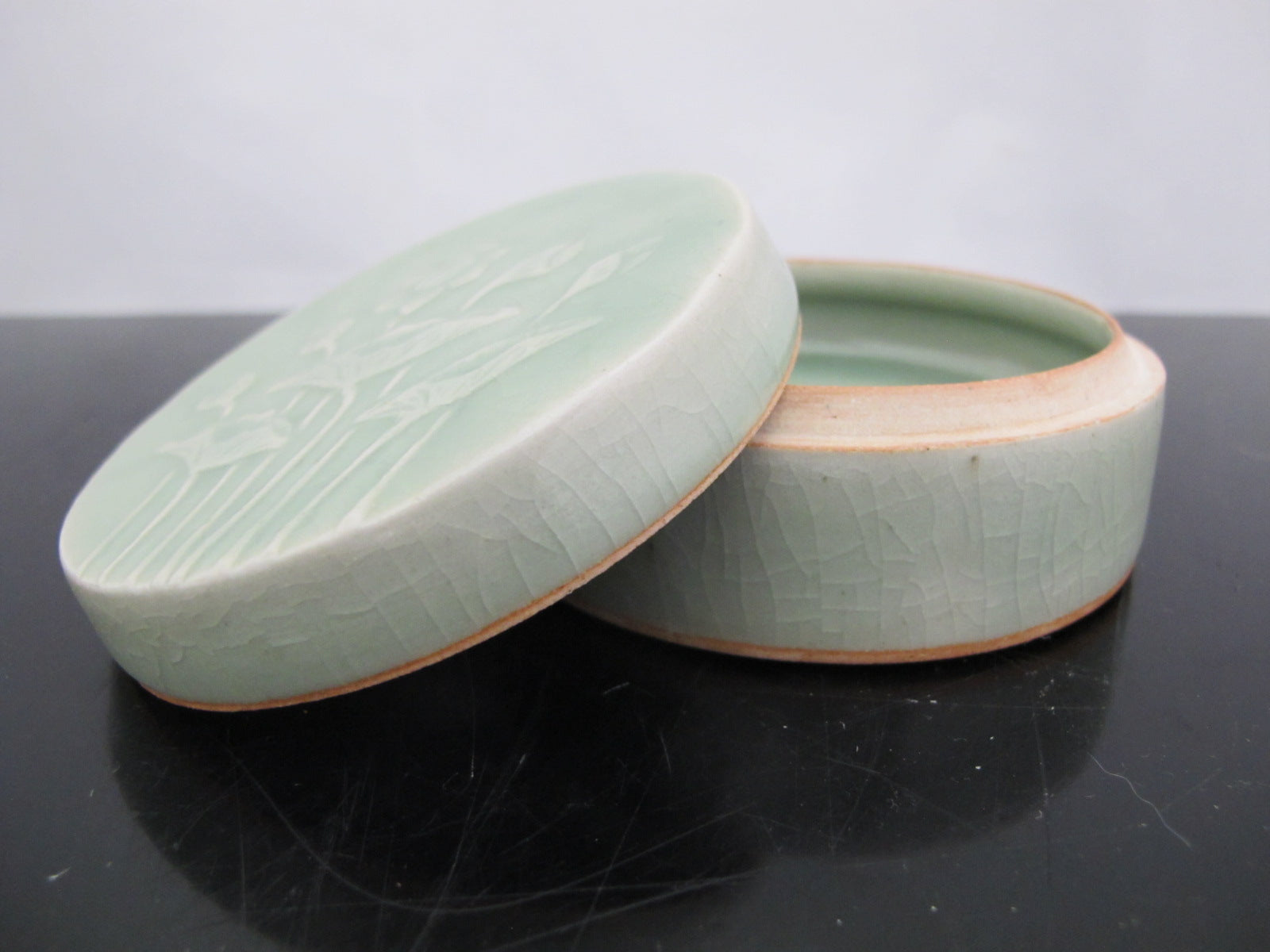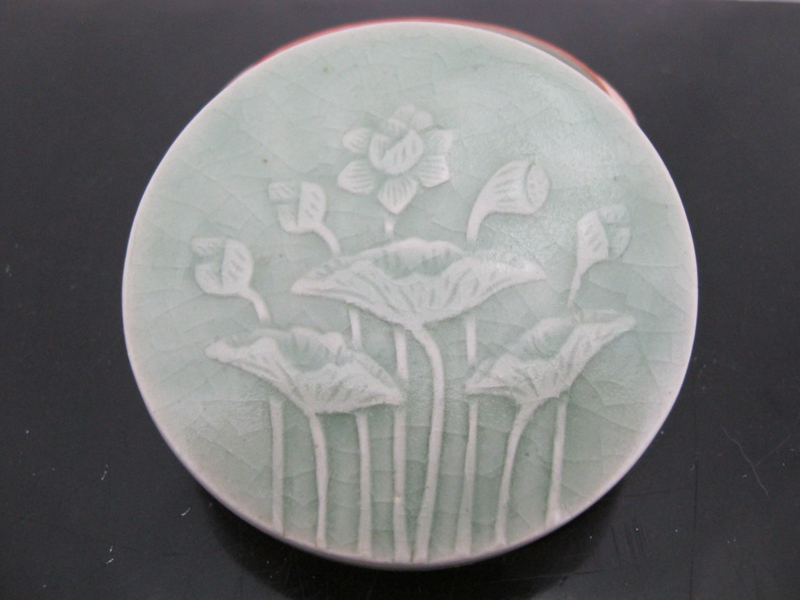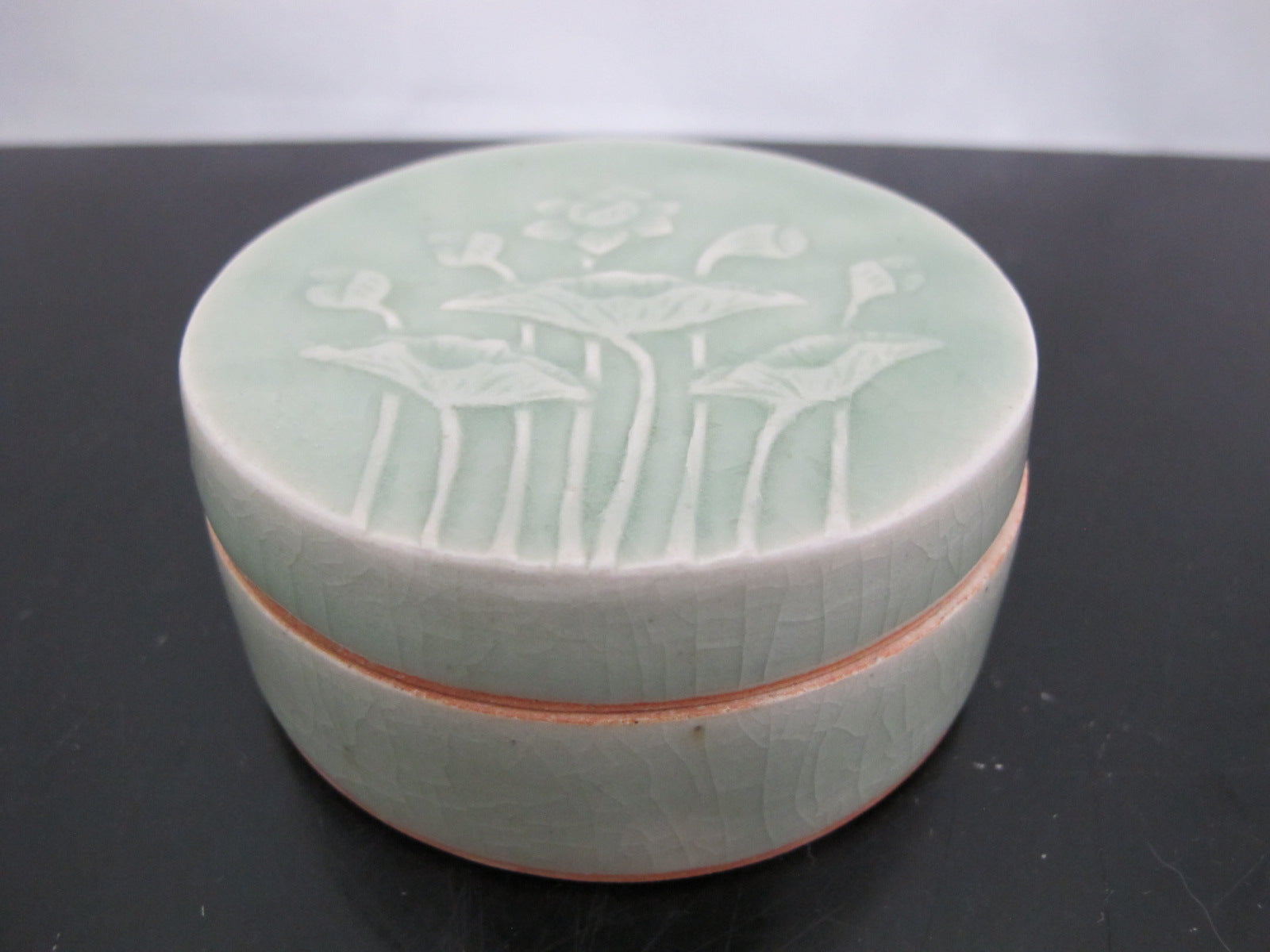 Thai CELADON Round Pottery Lidded Box with LOTUS Flower & Leaves Motif