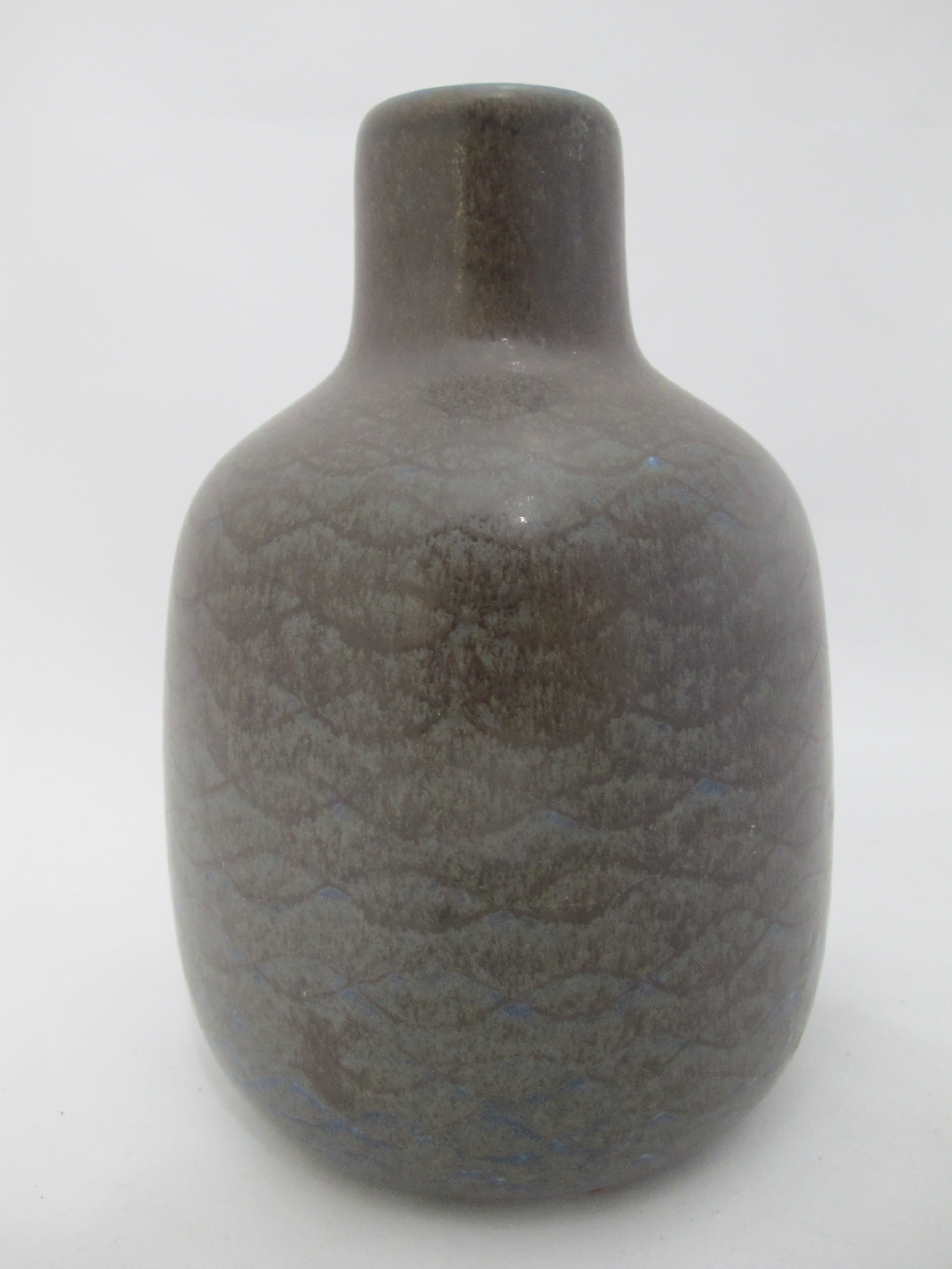 Bottle style vase, round with short, narrow neck. Featuring a distinctive wavy, snake or scale-like incised design.